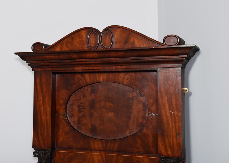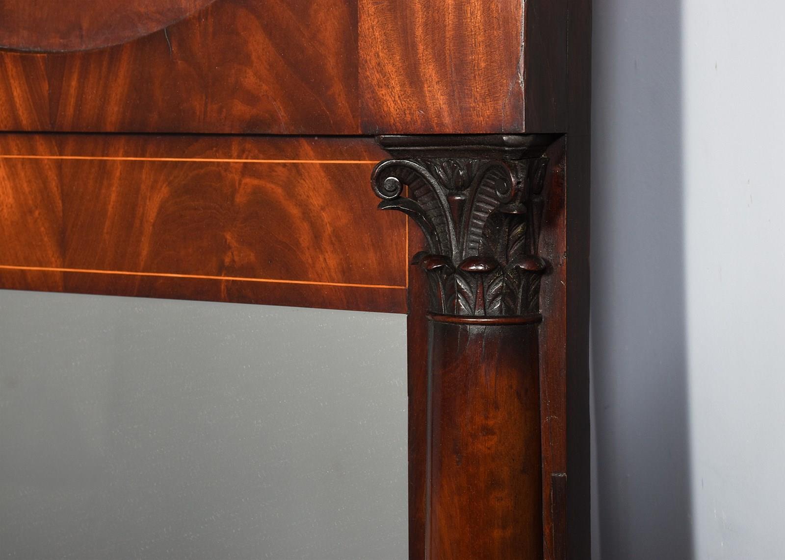 Circa 1830. A quality mahogany and inlaid French pier mirror, the top with a stylish beaded pediment with flame mahogany panels, beneath this is the moulded cornice, with an oval flamed mahogany panel in the center, the mirror plate flanked by a pair of classic pilasters with carved capitals and tapering round facings, with inlaid on the top and base, the bottom with an ogee flame mahogany section, flanked by a pair of blocks all resting on a simple base.