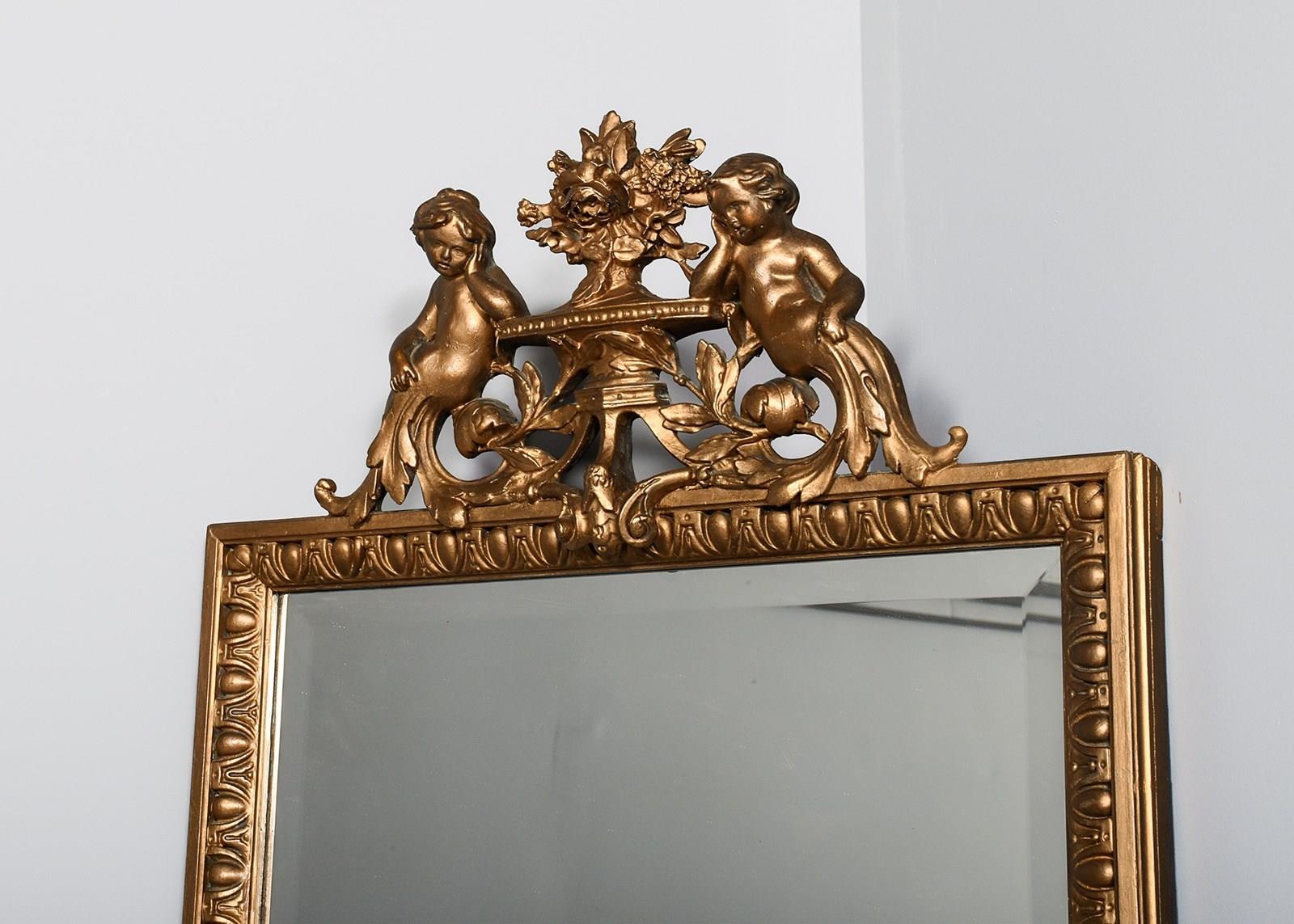 Circa 1890. A large rectangular gilded and bevelled-edged pier mirror, surmounted by a pair of classical cherubs with foliate bodies beside flowers which are resting on a pierced gilded table, the bevel-edged mirror contained in a carved and gilded gesso frame with beading on the fore-edge and the sides