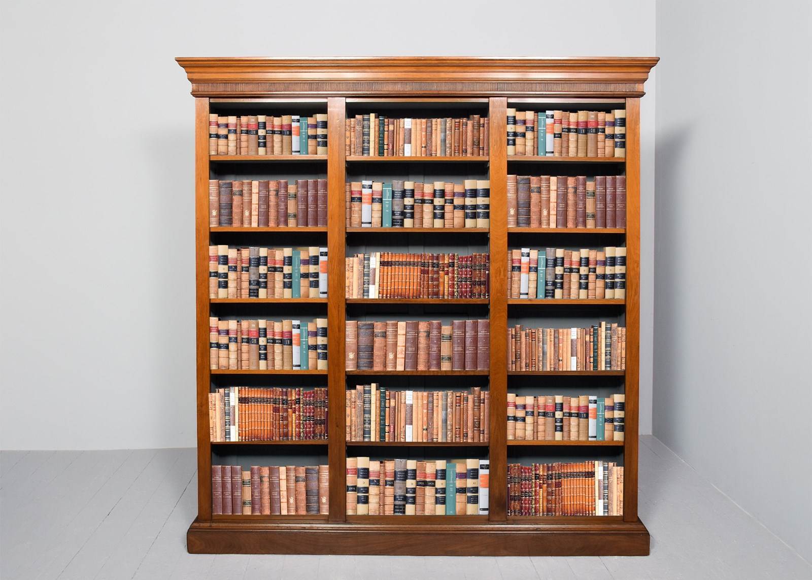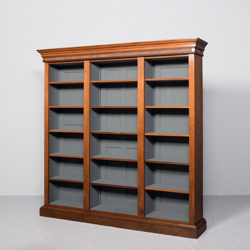 Circa 1880 with alterations. Tall, straight-grained walnut Victorian three-section open bookcase. Surmounted by a moulded cornice and a fluted frieze, the three bookcase sections each with five shelves and flanked and divided by simple vertical pilasters and all supported on a moulded enclosed plinth base. In excellent condition. Both functional and attractive.