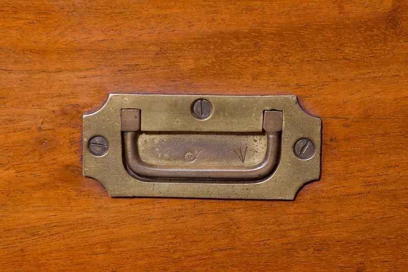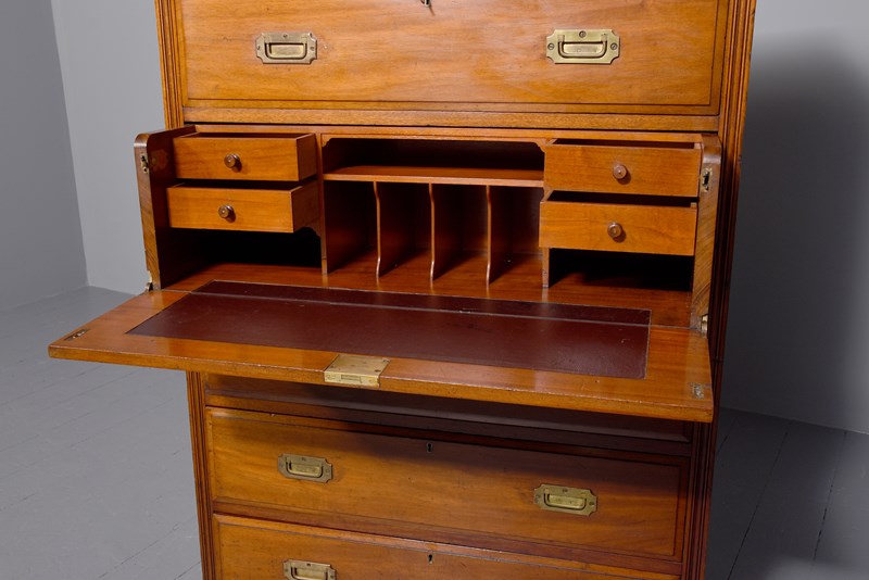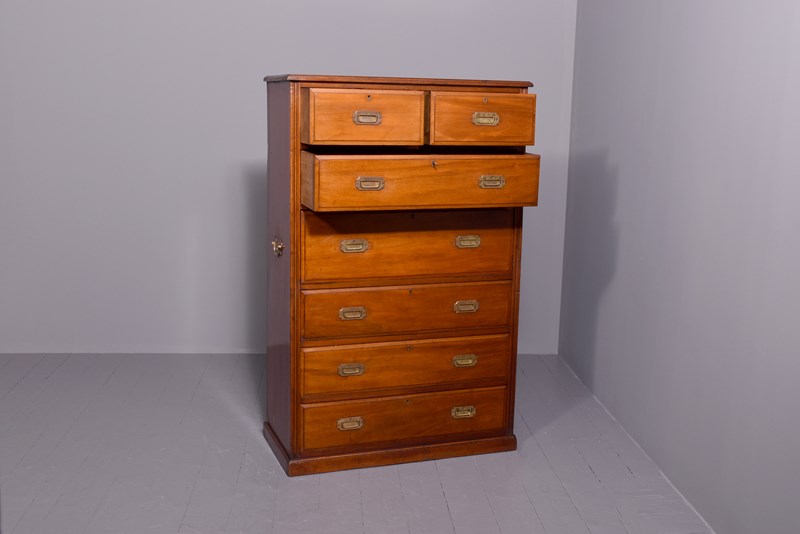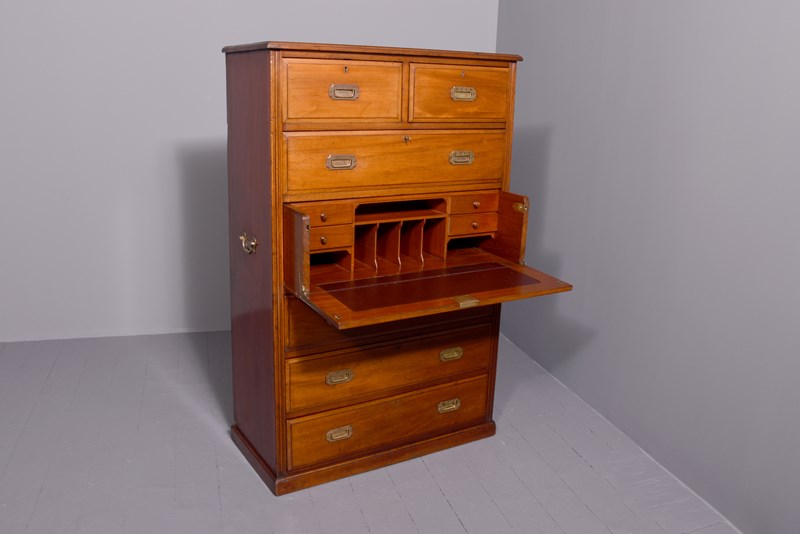 Circa 1880 Tall Victorian mahogany military secretaire chest. The chest flanked by fluted pilasters with 2 short over 5 long drawers with inset brass campaign handles. The deepest drawer is a well fitted secretaire drawer. With cut brass carrying handles to the sides, all supported on an enclosed plinth base. In excellent condition.