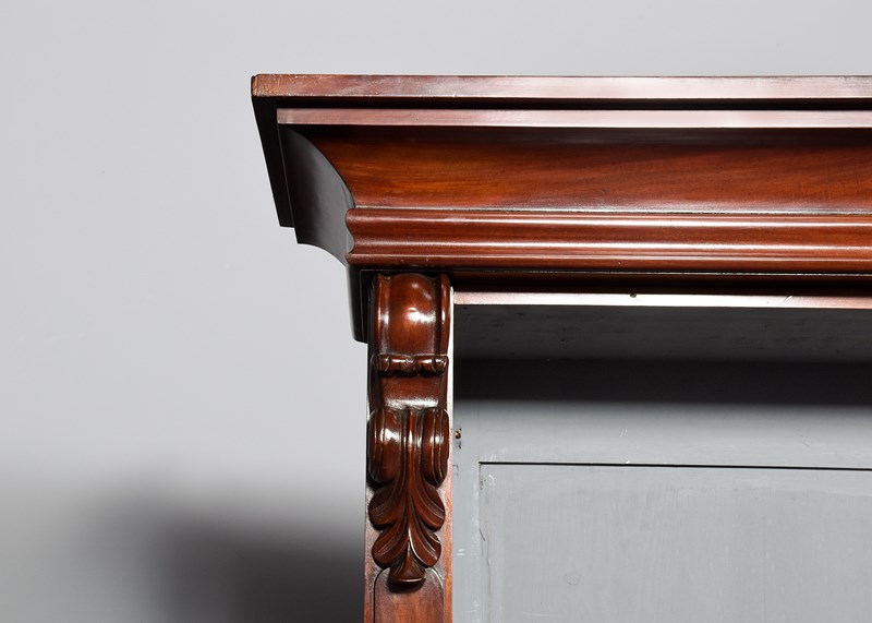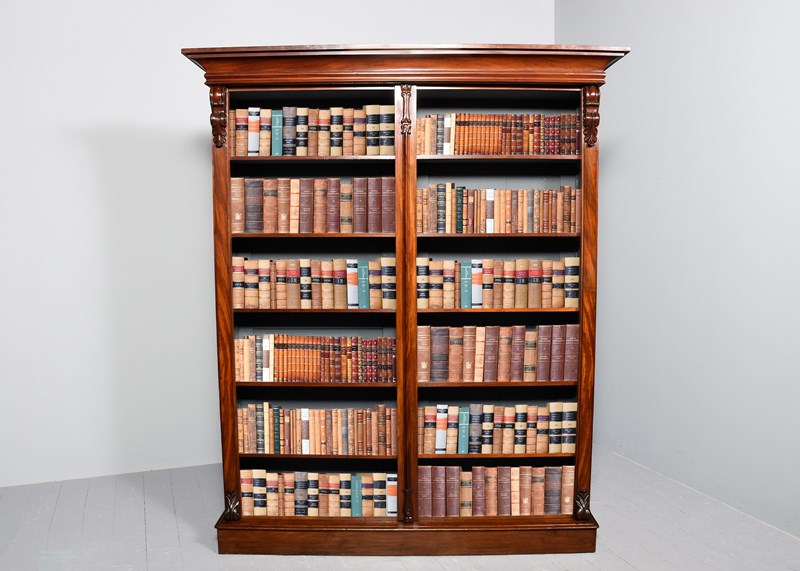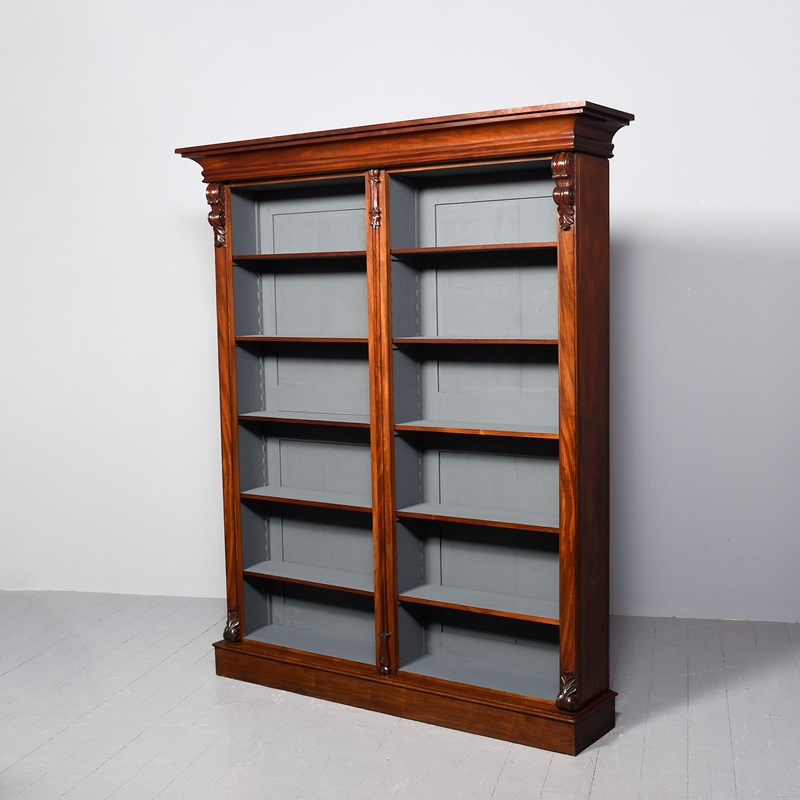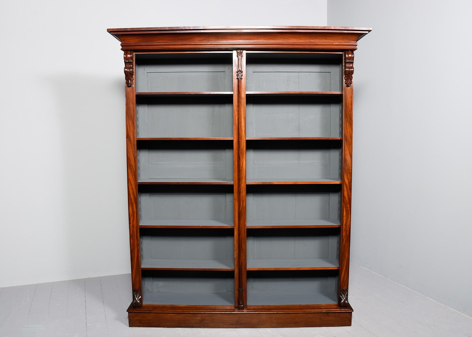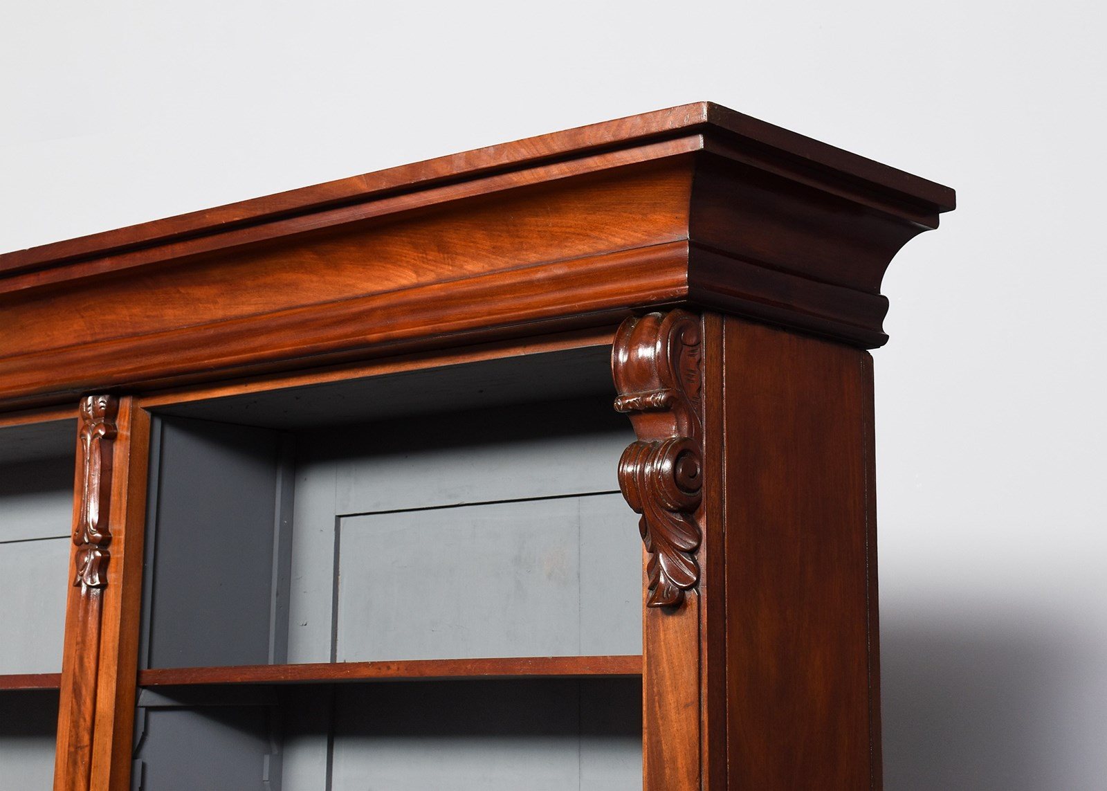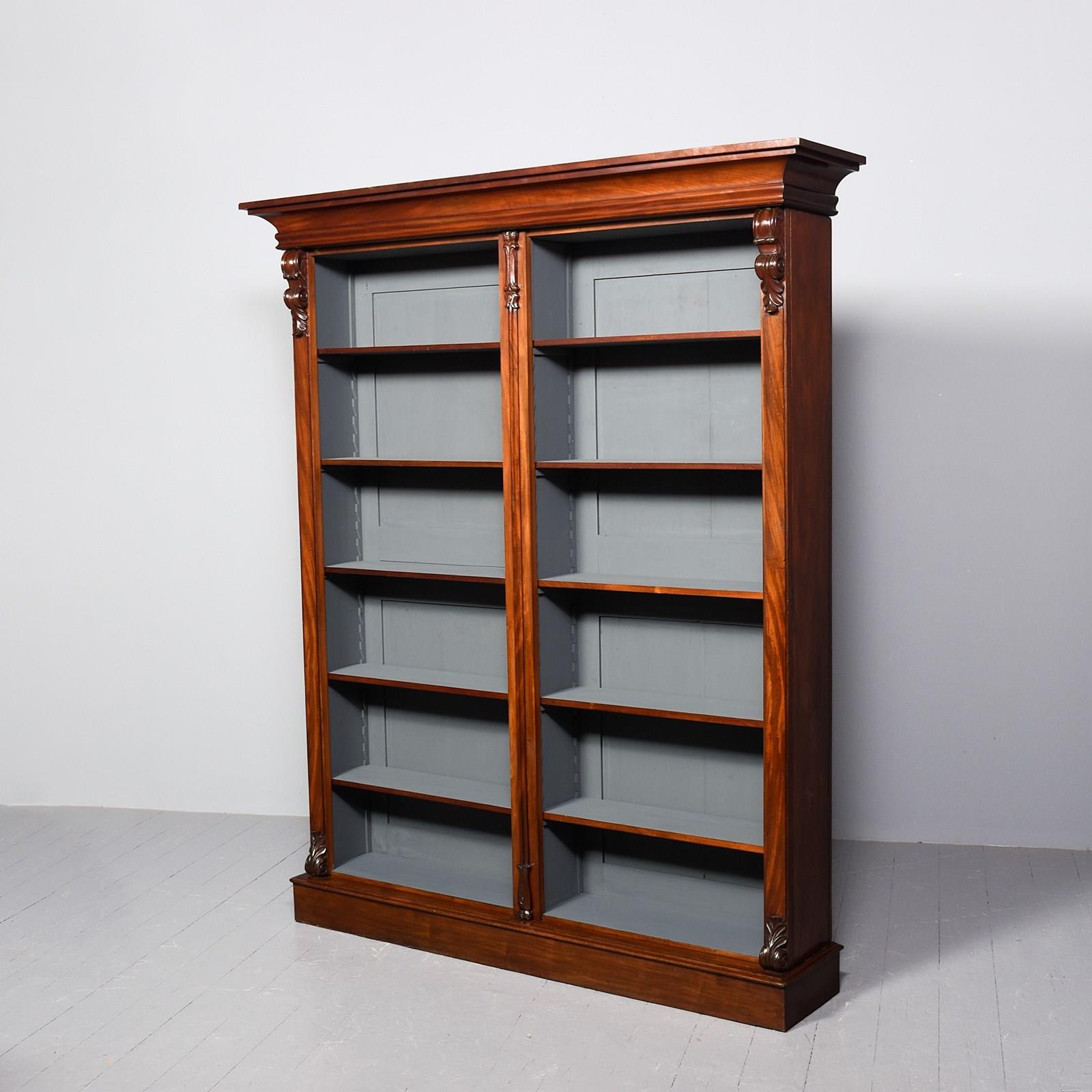 Circa 1860 (with alterations). Tall Victorian two-section mahogany open bookcase, surmounted by classical cavetto moulded cornice, the two bookcases divided and separated by simple columns with carved corbels. Each bookcase with five mahogany-fronted adjustable shelves over a moulded plinth base. Lovely rich colour and patina.
