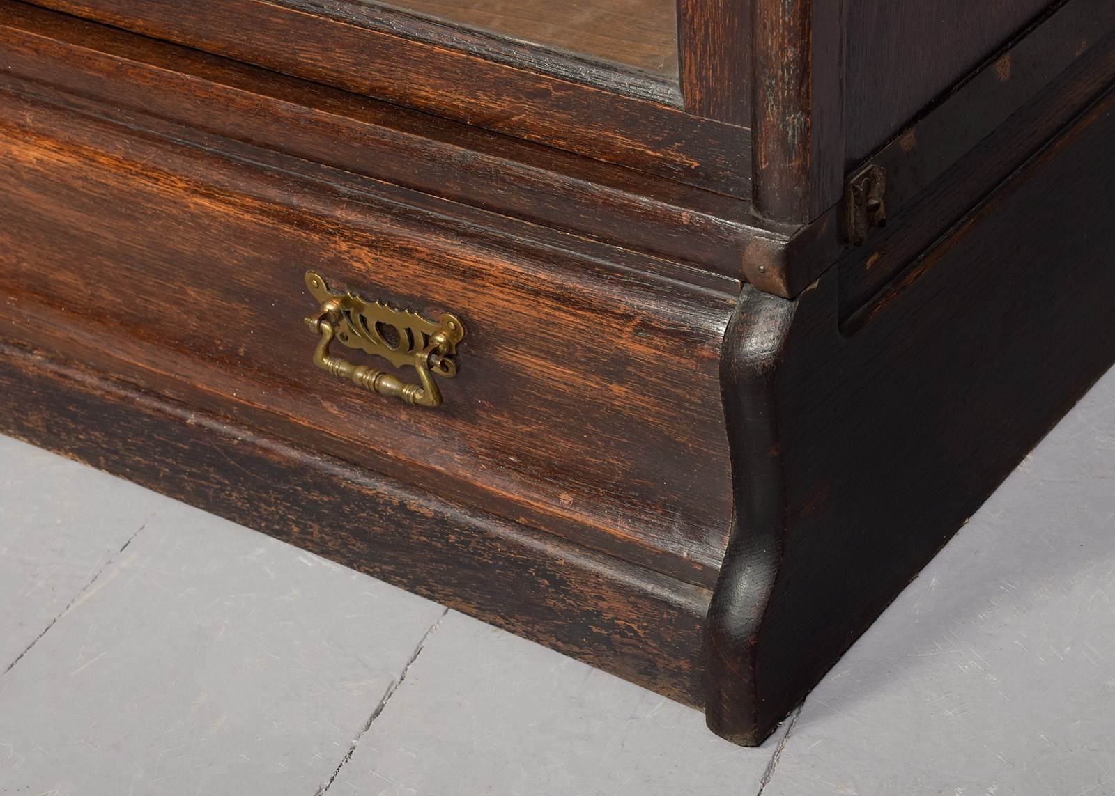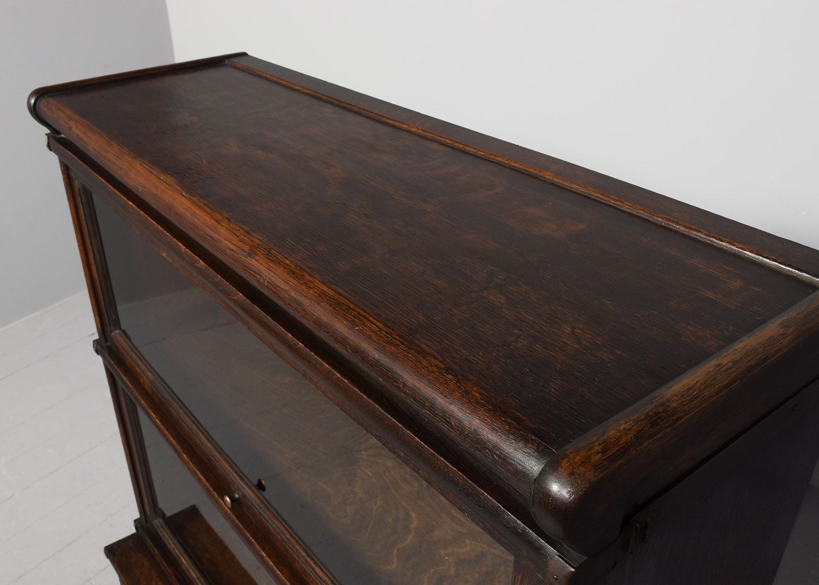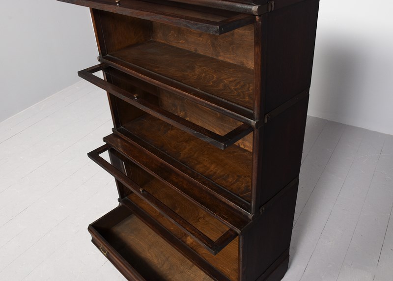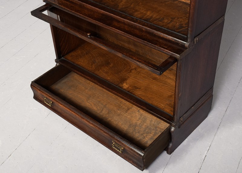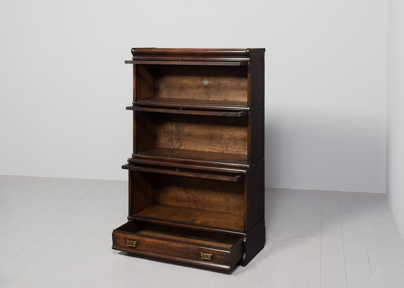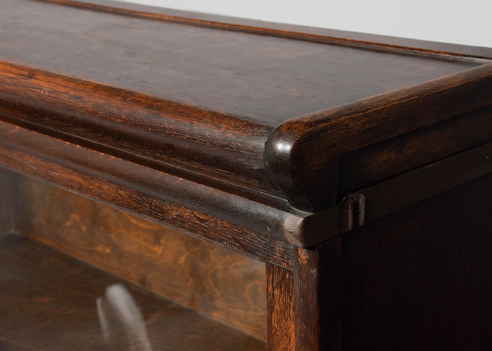 Circa 1920. Three-section Globe Wernicke oak section bookcase. The polished top with a rounded fore-edge over the three glazed bookcase sections, with a deeper section on the base above a drawer with original brass handles. Lovely colour and patina and in excellent condition.