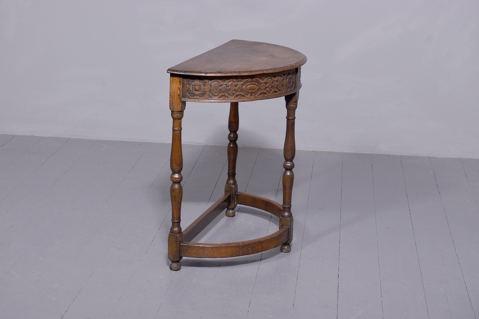 Circa 1900. A Tudor style oak demi lune occasional table, the solid top with a simple moulded fore-edge, frieze with carved classical baroque patterns with beading beneath, supported on three turned legs braced by curved stretchers which follow the form of the top, resting on small bun feet.