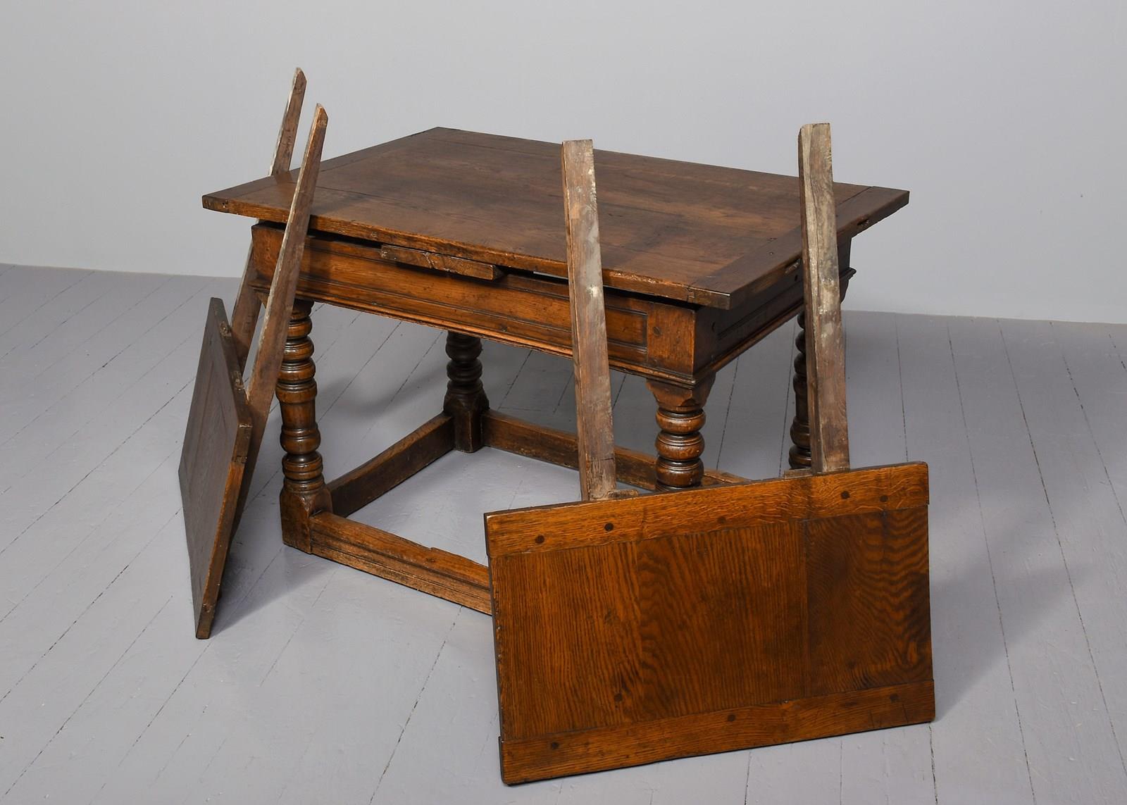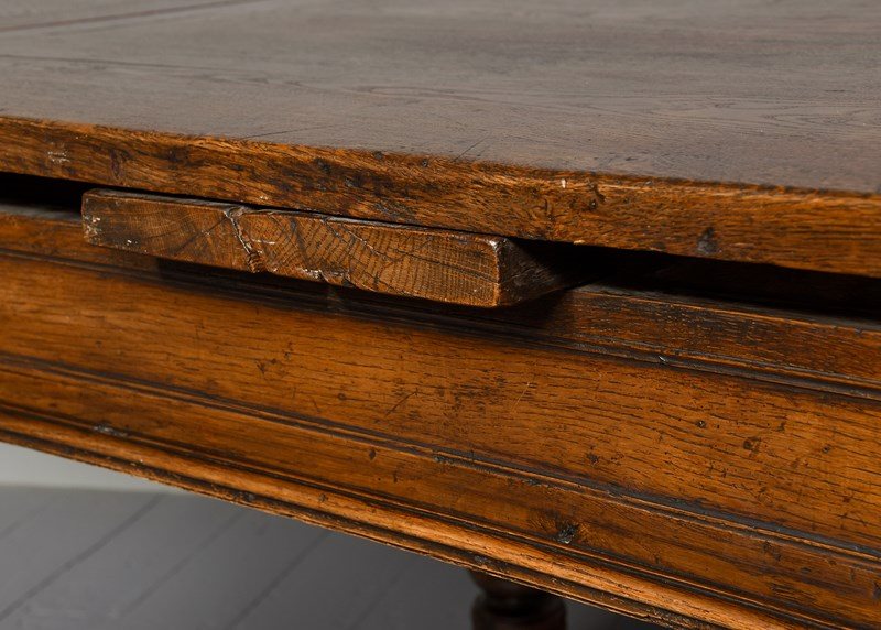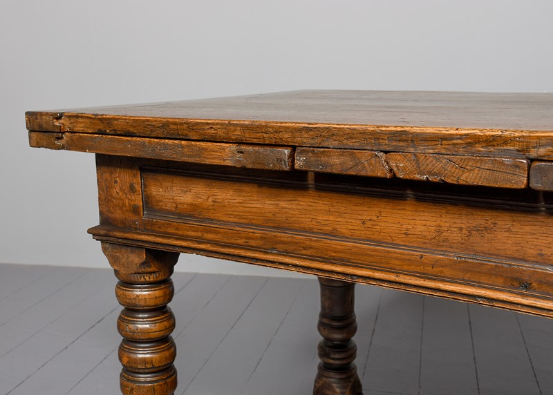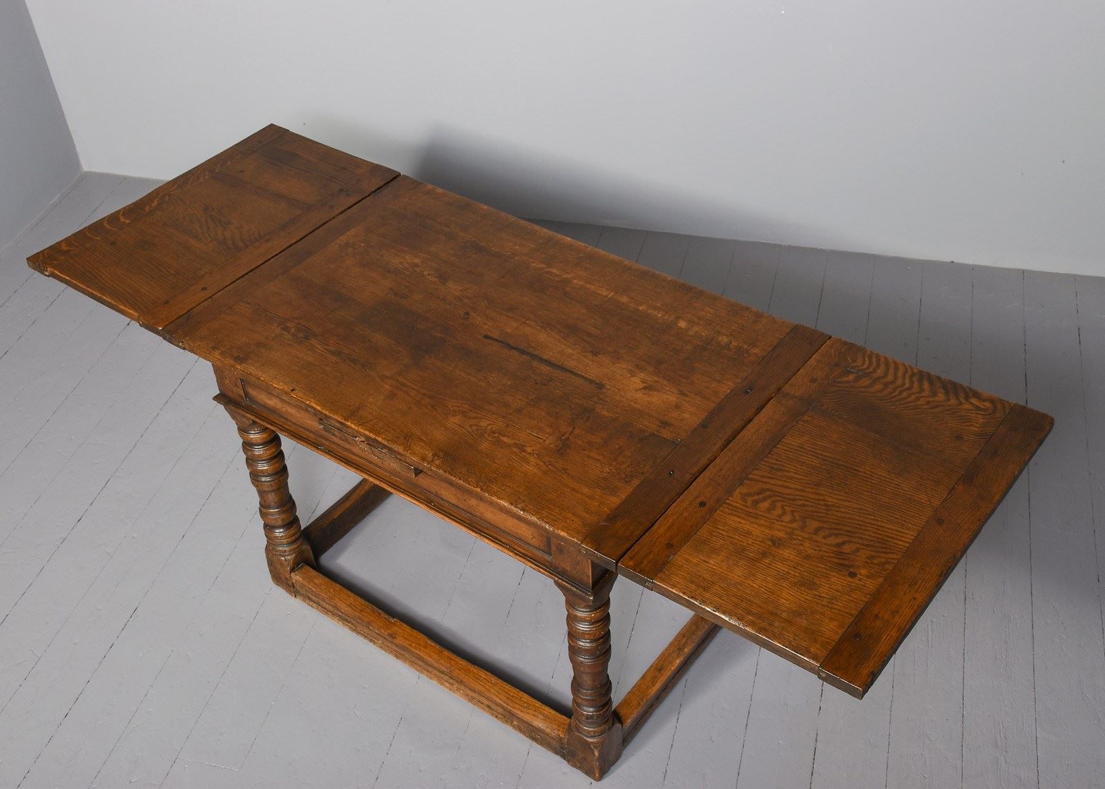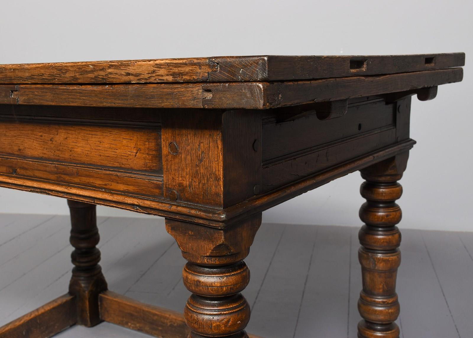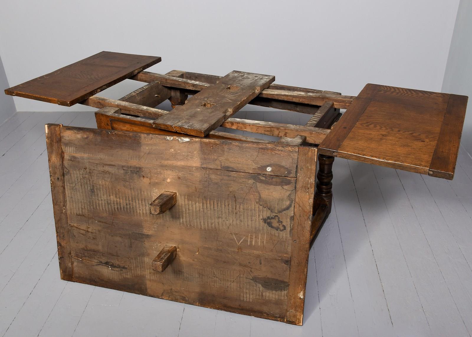 Circa 1860. A Tudor style oak pull out dining table/side table, the top with sections of oak with end pieces held in place by visible peg dowels, beneath the top there are two pull out leaves of similar construction, with a simple panel frieze with large beading to the base, and the table rests on Tudor turned, ring turned legs, all are braced by rustic conforming stretchers, low to the ground. Great colour and style.