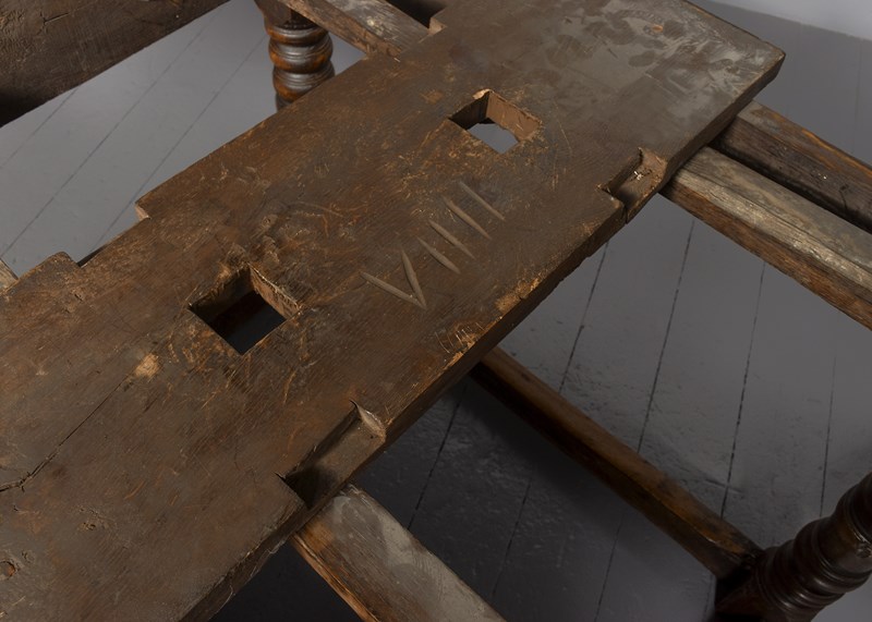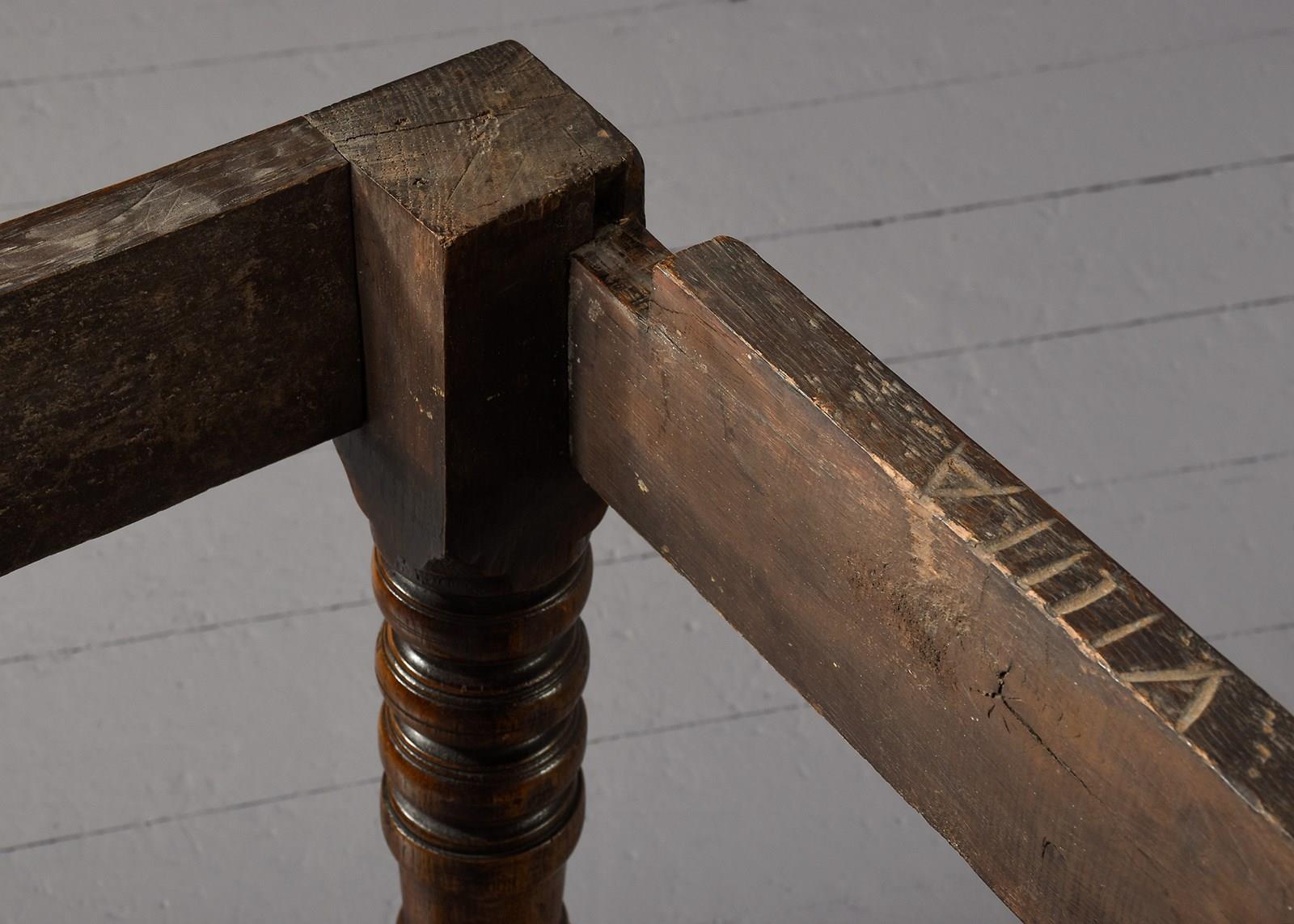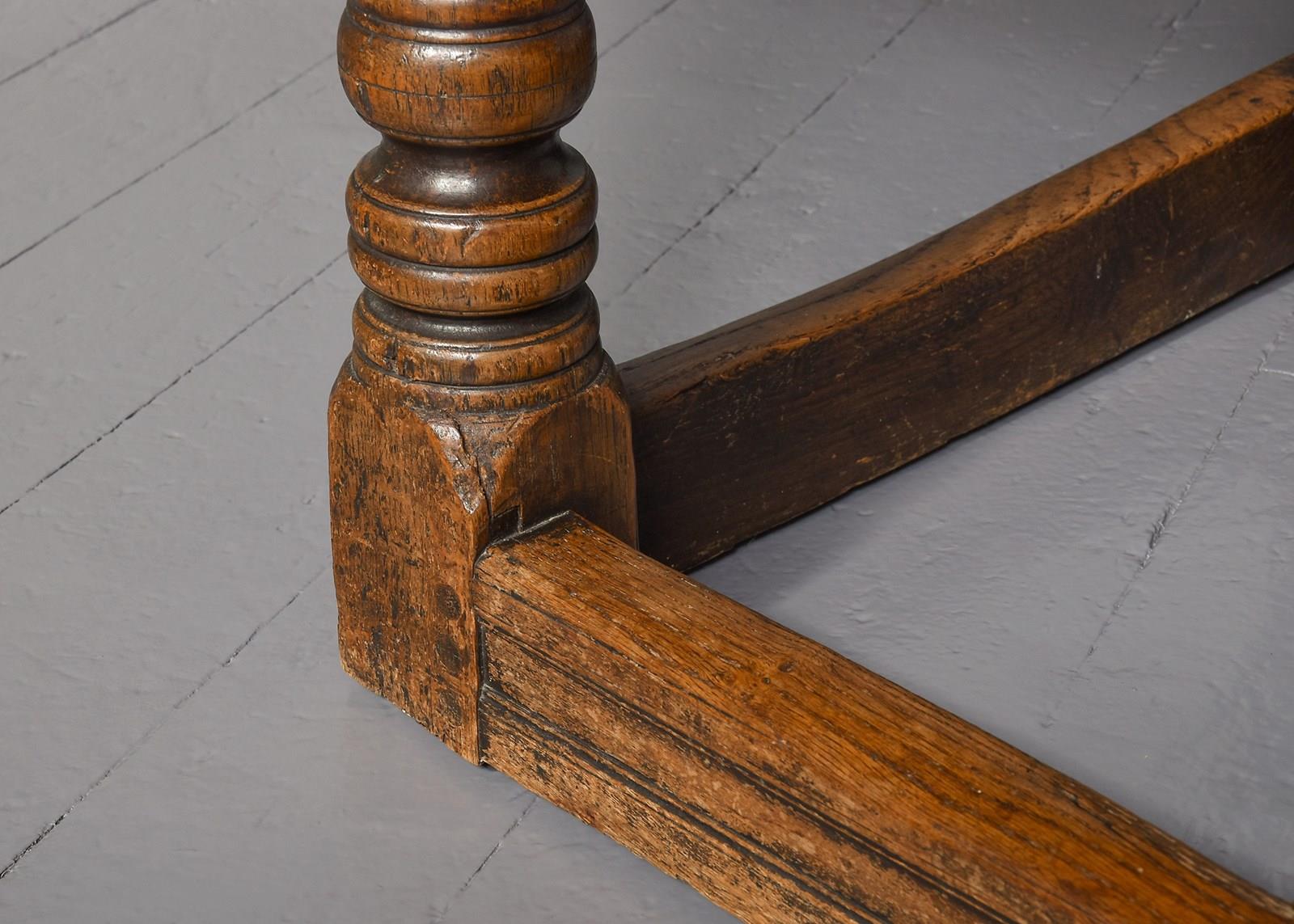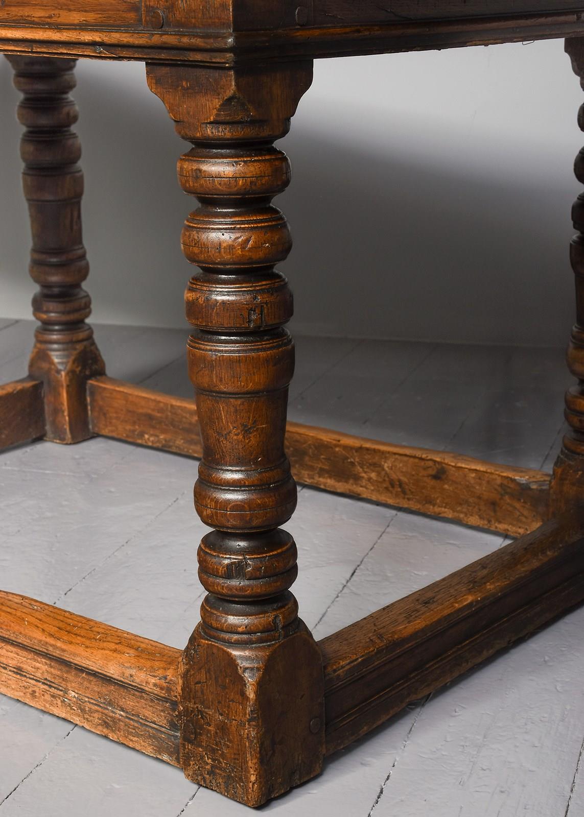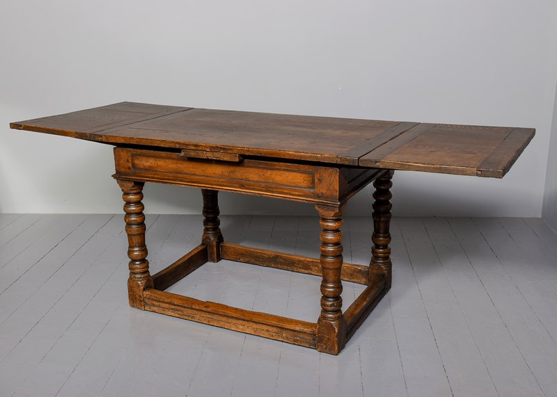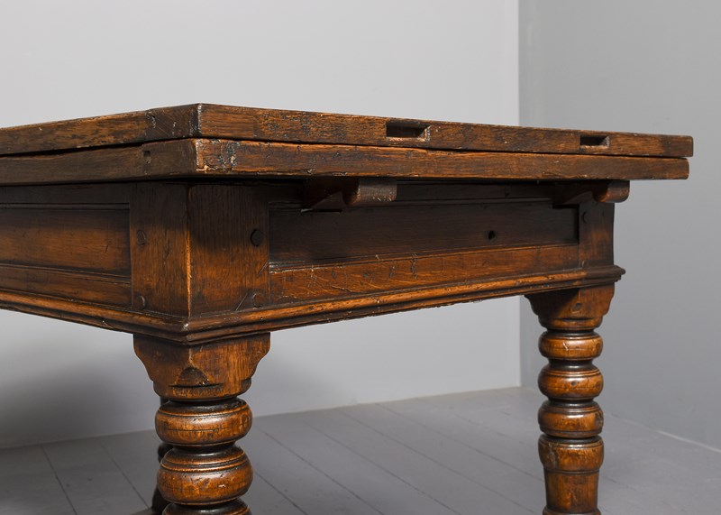 Circa 1860. A Tudor style oak pull out dining table/side table, the top with sections of oak with end pieces held in place by visible peg dowels, beneath the top there are two pull out leaves of similar construction, with a simple panel frieze with large beading to the base, and the table rests on Tudor turned, ring turned legs, all are braced by rustic conforming stretchers, low to the ground. Great colour and style.