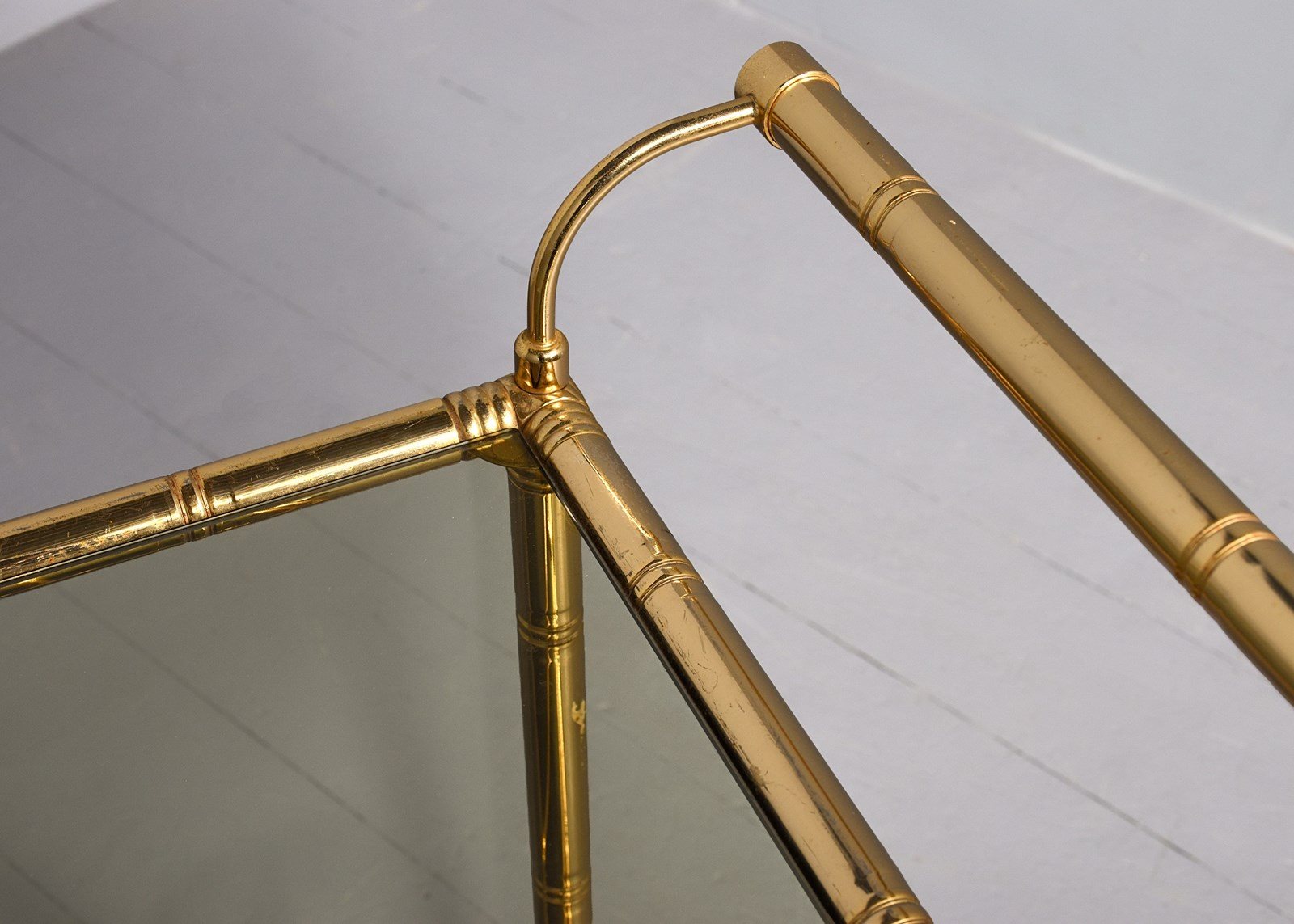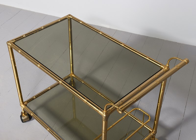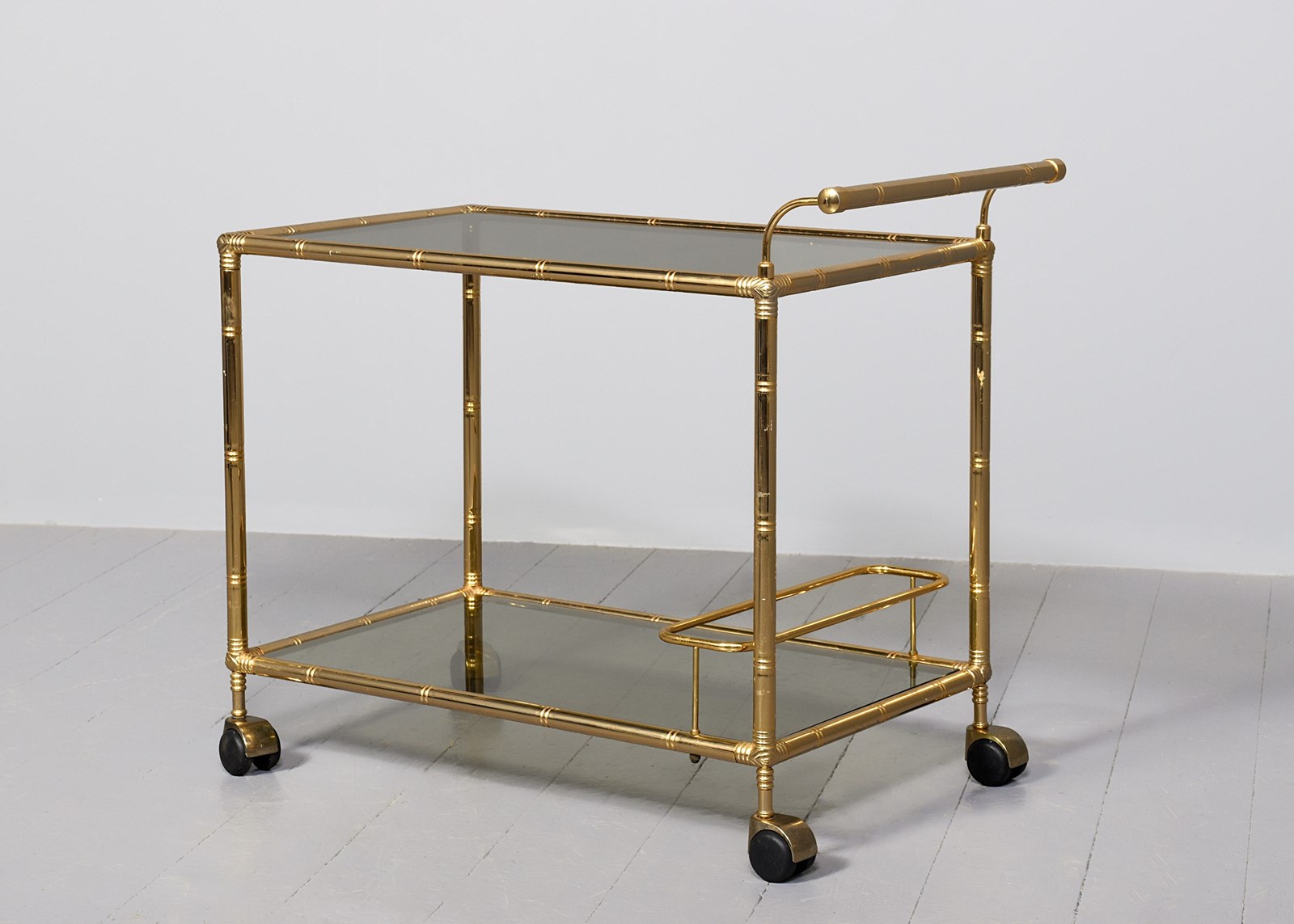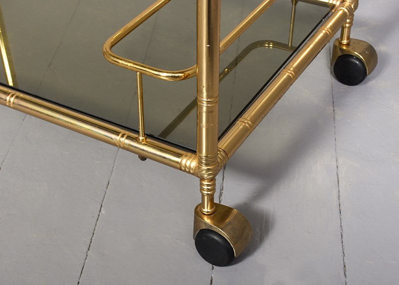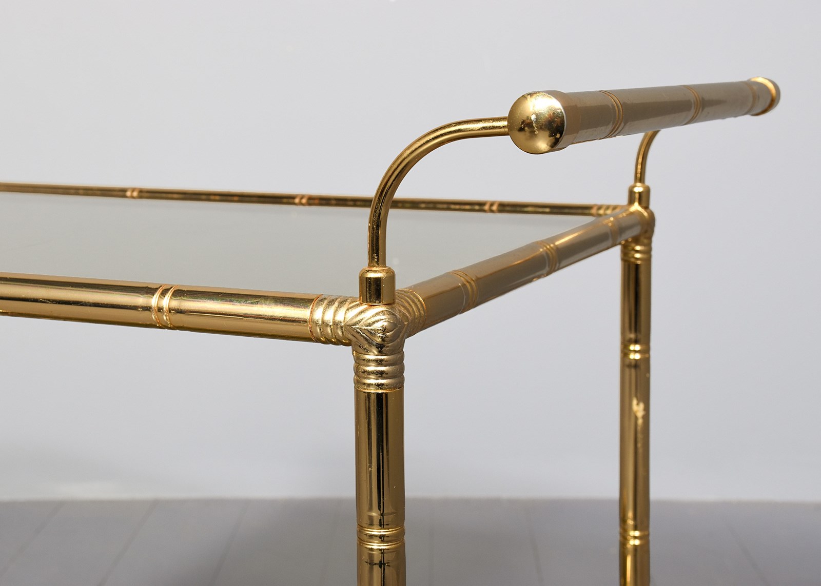 Circa 1990s. A stylish two-tier brass and glass tea trolley, the top section with a raised arm, the brass frame in the form of faux bamboo with two removable glass inserts and a small brass aperture on the bottom for holding bottles in place, resting on four swivel wheels which have brass coverings.