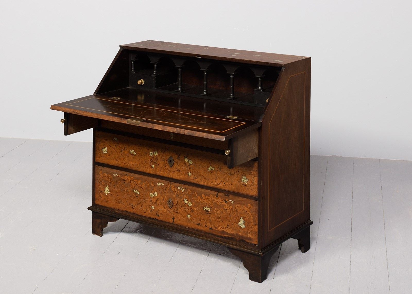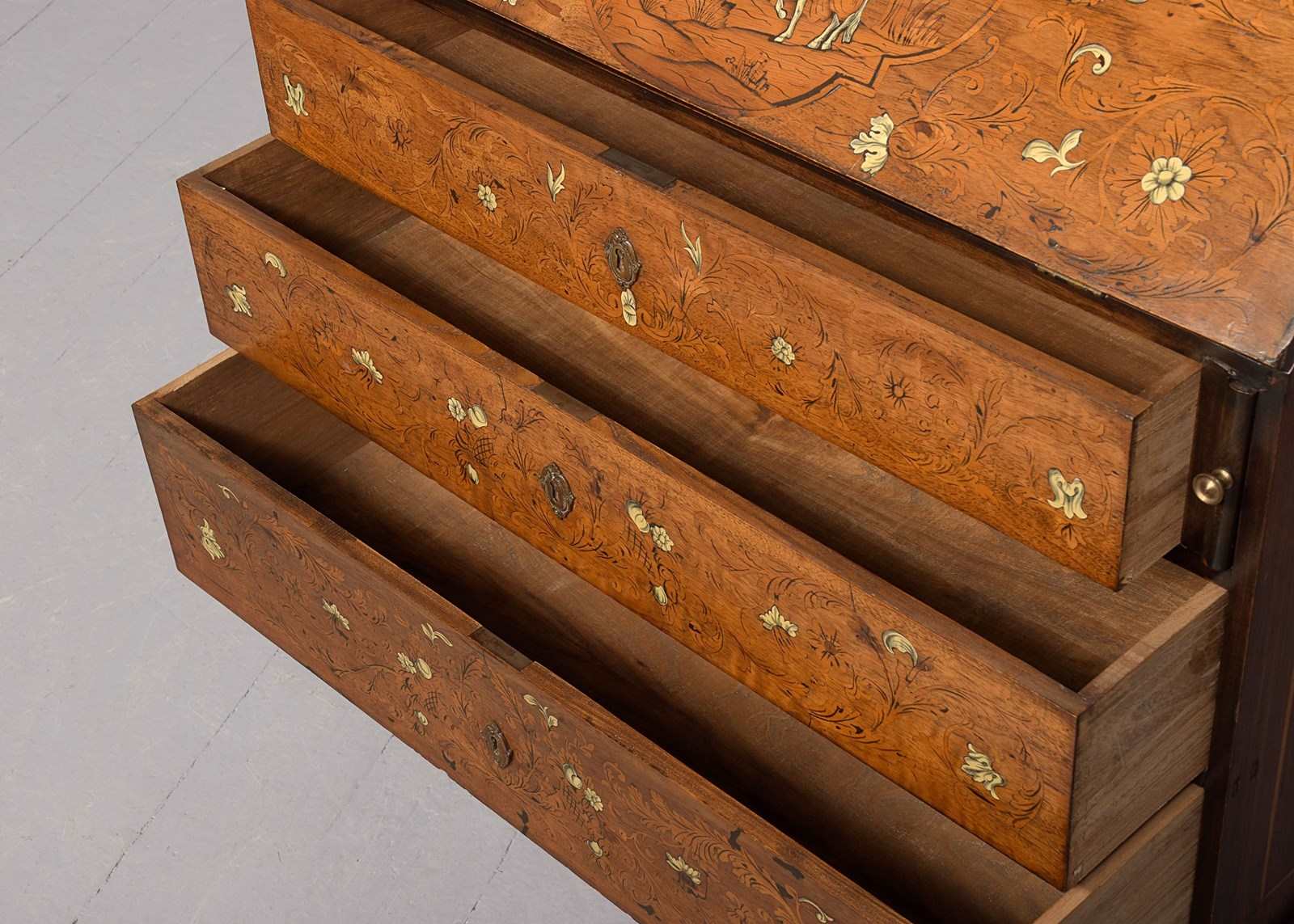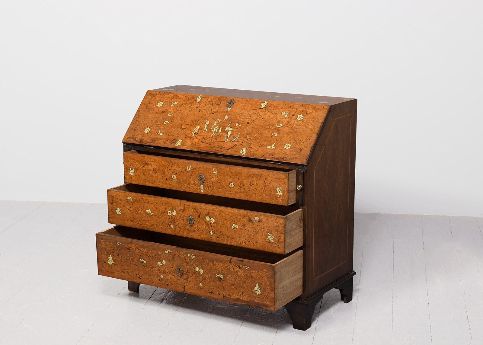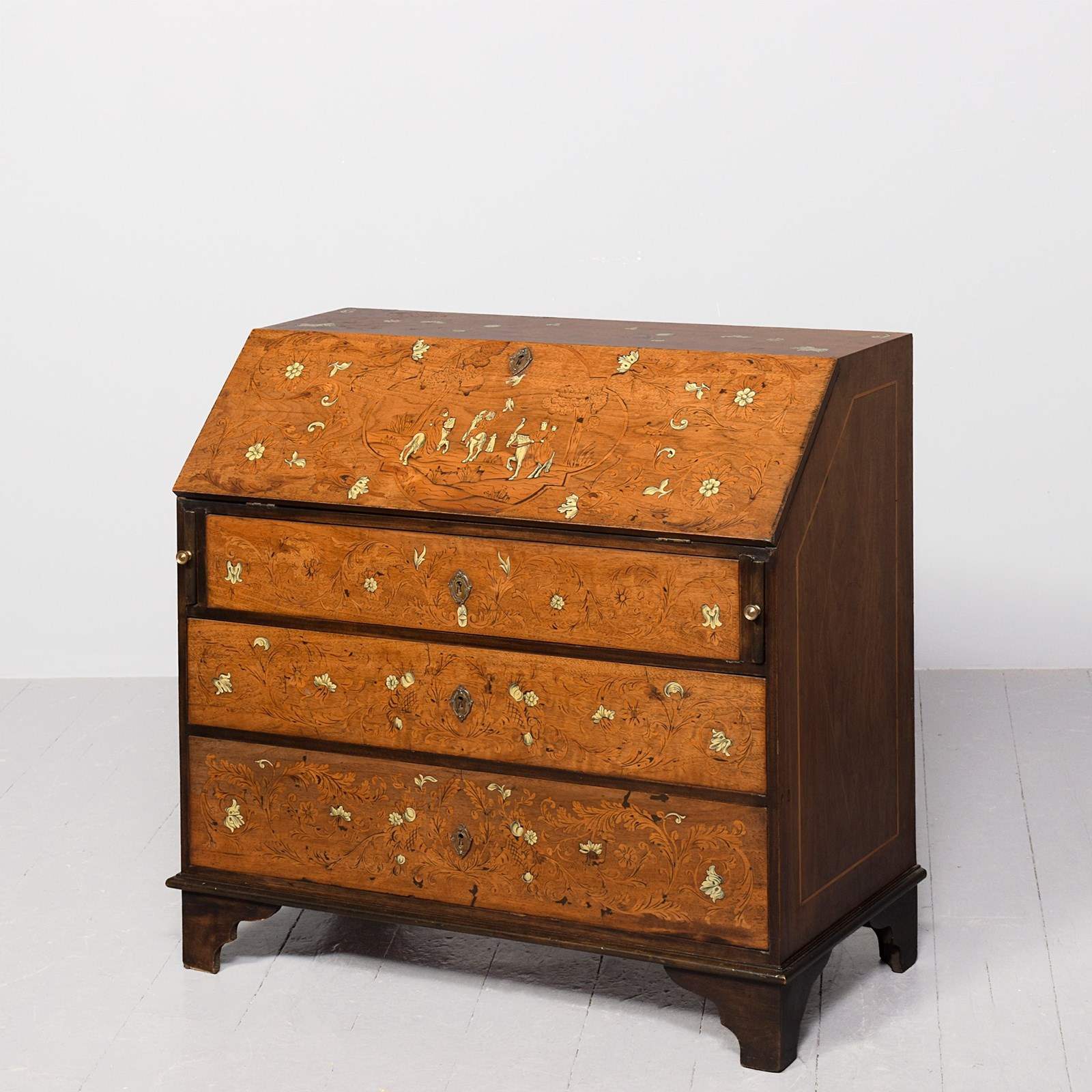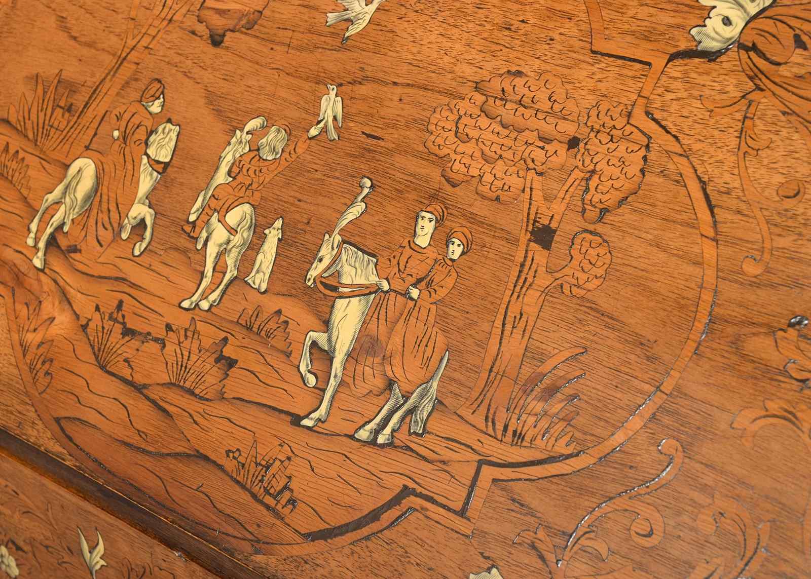 Circa 1820. Unusual Italian marquetry and bone inlaid bureau. The rectangular shaped top wit marquetry depicting a cornucopia and flowers with various inlays and bone, the flap, similar with figures on horses and foliate inlay. The interior with columns and arches and 2 neat sized drawers with fine quality cast brass handles, writing surface with geometric inlay. The graduated drawers to the base have similar marquetry, all standing on bracket feet.