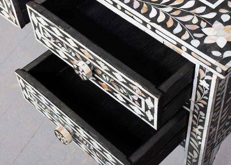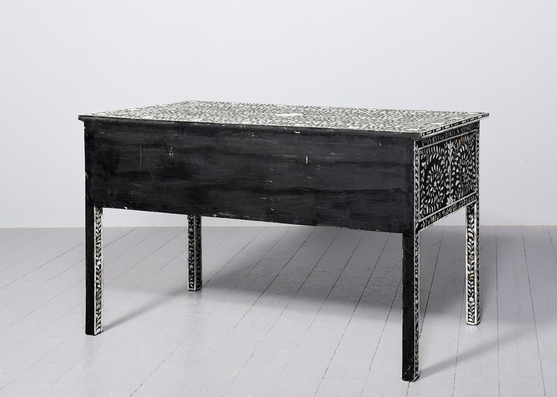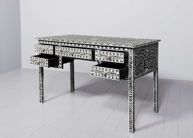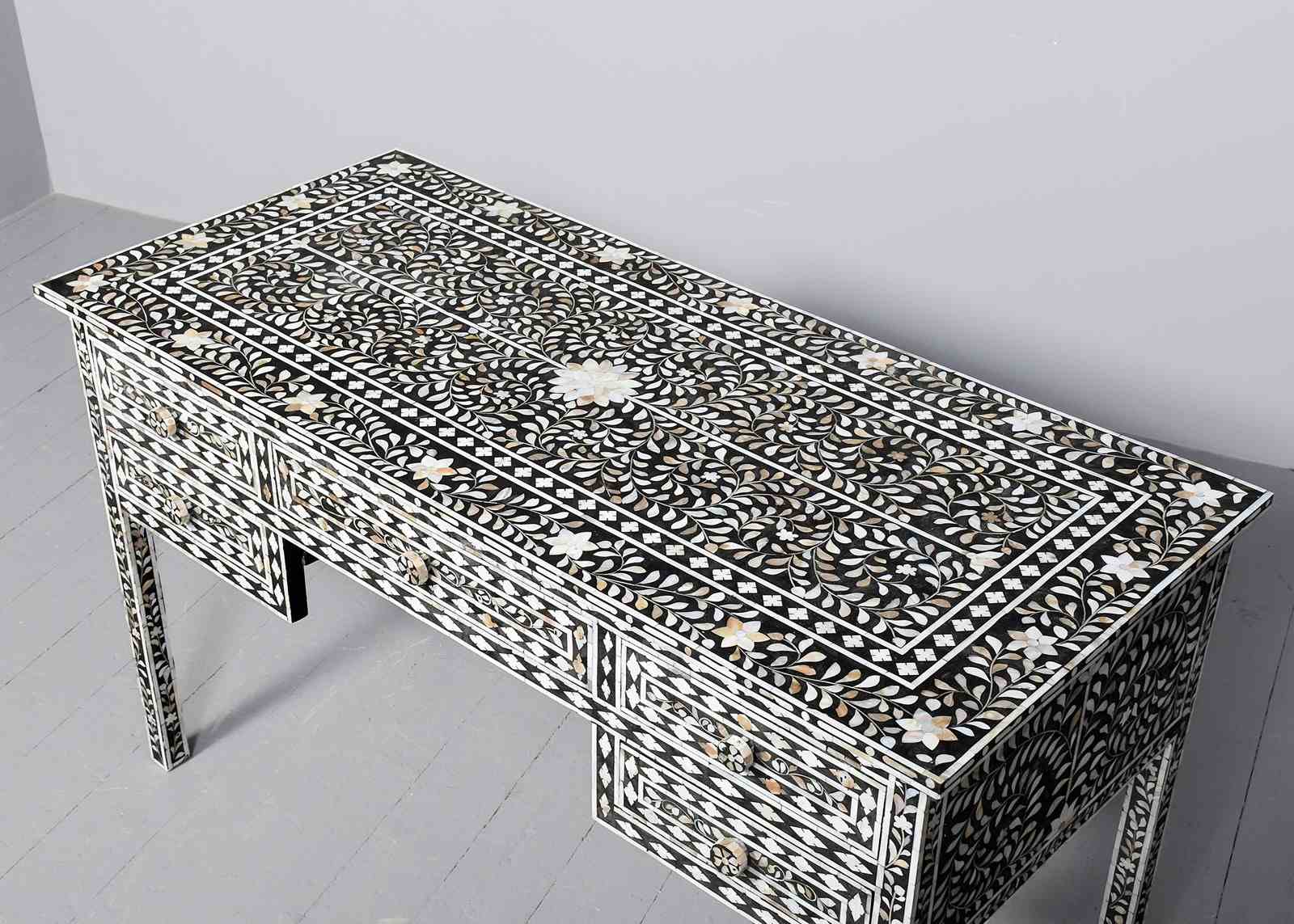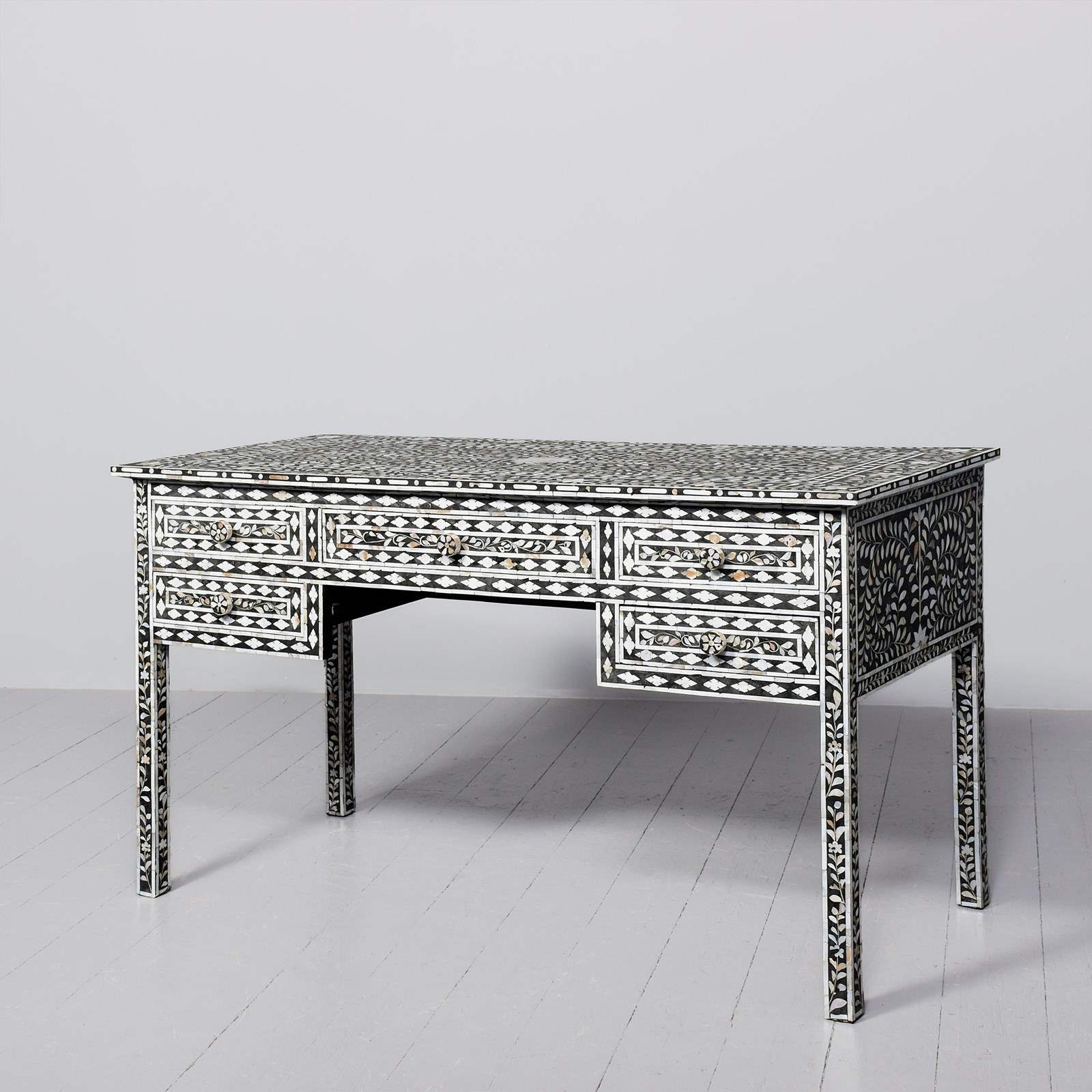 Circa 1990s. A very unusual mother of pearl and ebony inlaid desk, the rectangular top with lovely foliate and geometric patterns in mother of pearl, the front one long drawer flanked by a pair of shorter drawers, all with similar inlay, each with a turned knobs of mother of pearl, the gables with similar inlay, all resting on four square inlaid legs of similar design.