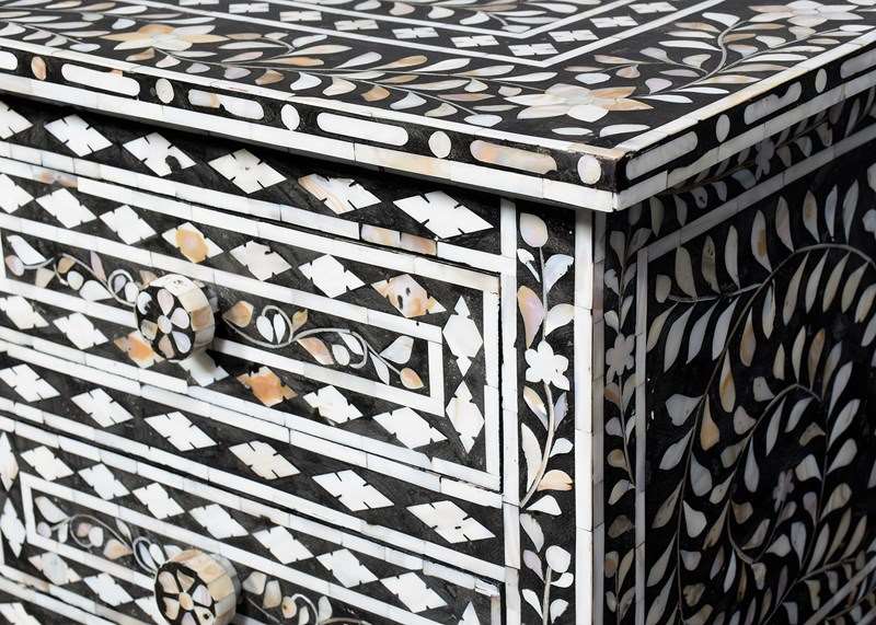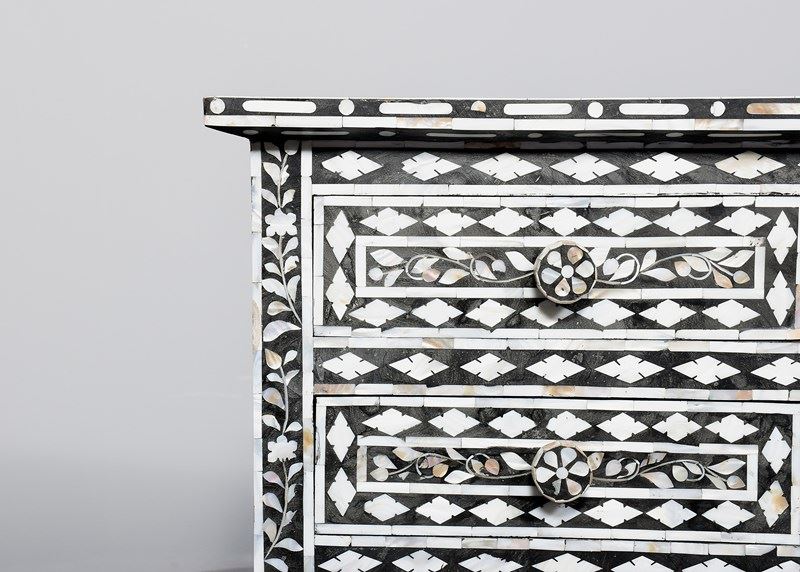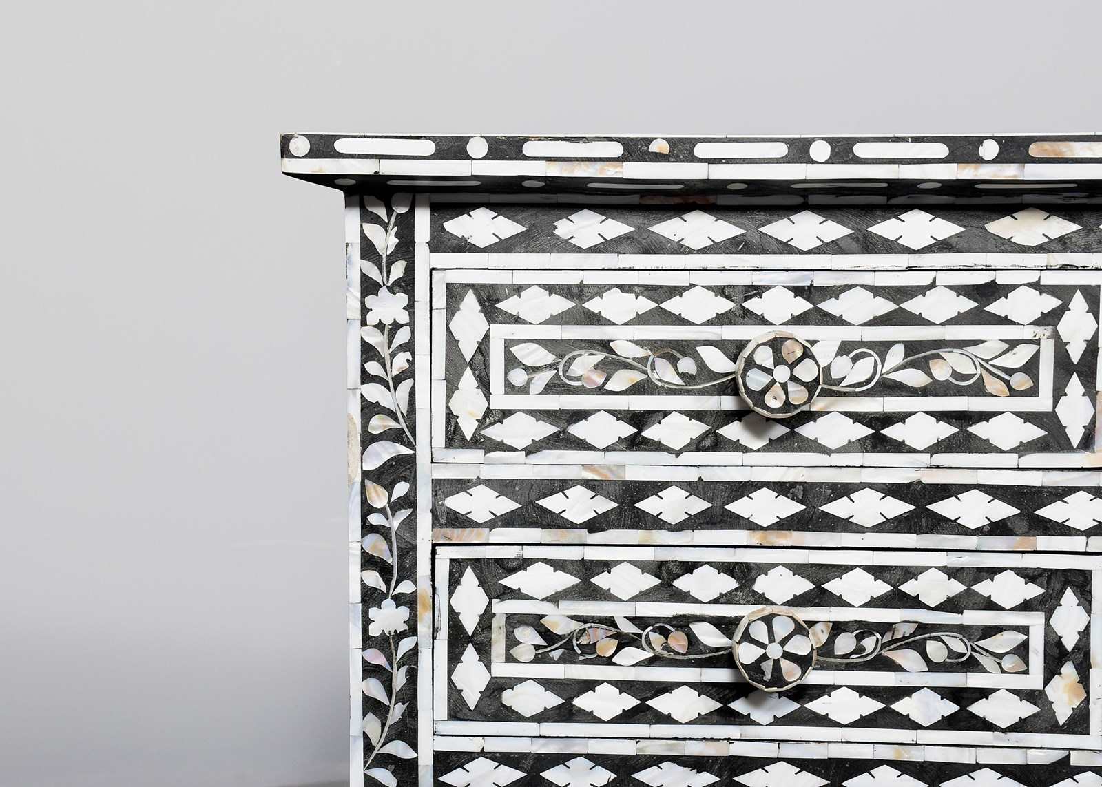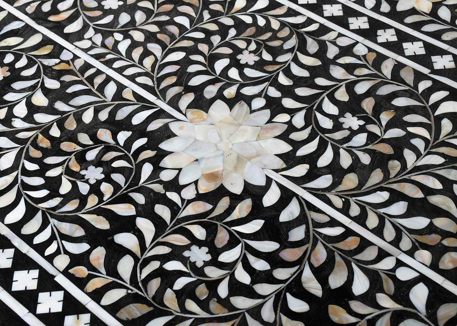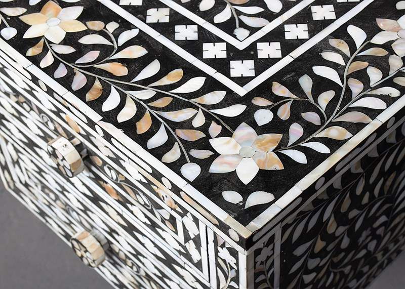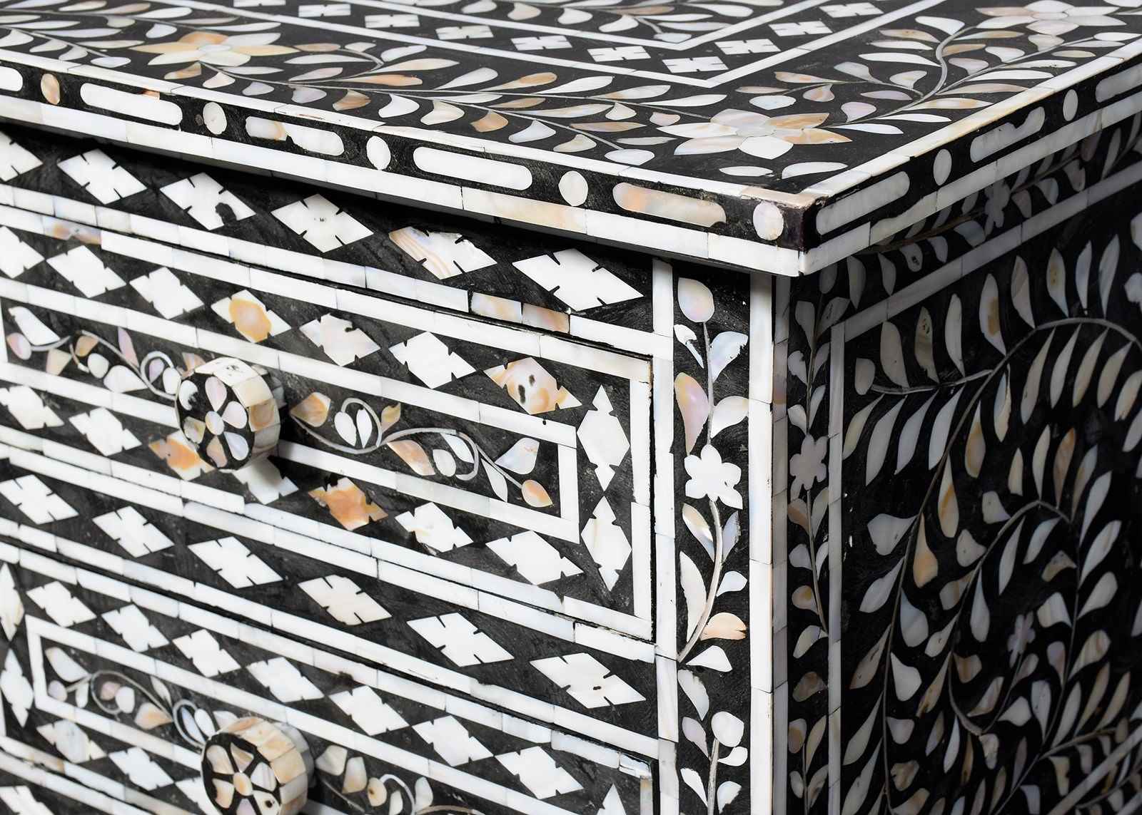 Circa 1990s. A very unusual mother of pearl and ebony inlaid desk, the rectangular top with lovely foliate and geometric patterns in mother of pearl, the front one long drawer flanked by a pair of shorter drawers, all with similar inlay, each with a turned knobs of mother of pearl, the gables with similar inlay, all resting on four square inlaid legs of similar design.