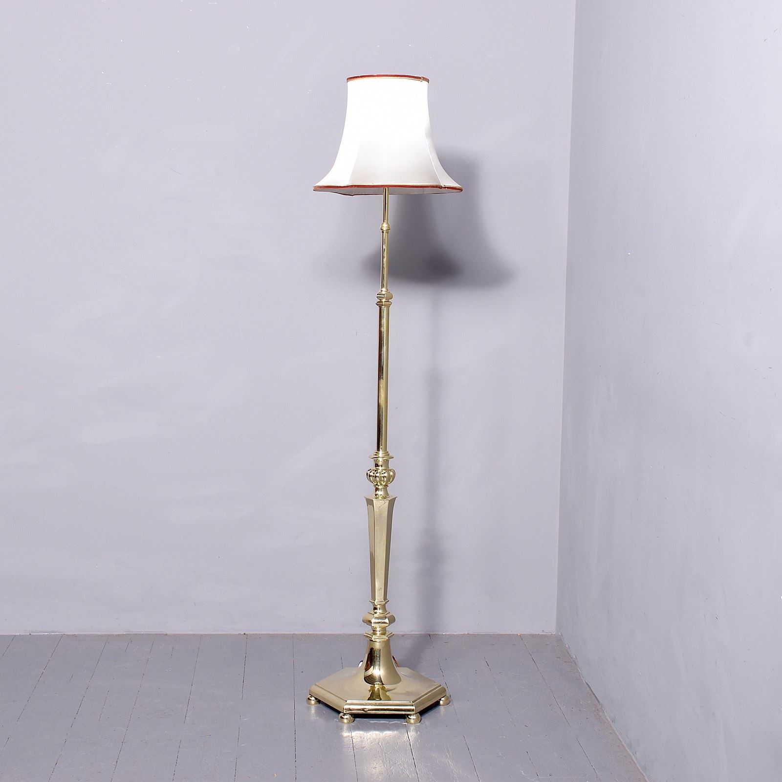 Circa 1890 with alterations. Victorian brass standard lamp now converted to electricity. Supported on a hexagonal base with brass feet, the tapering stem with hexagonal and beaded decorations was recently rewired with silk-covered cord.