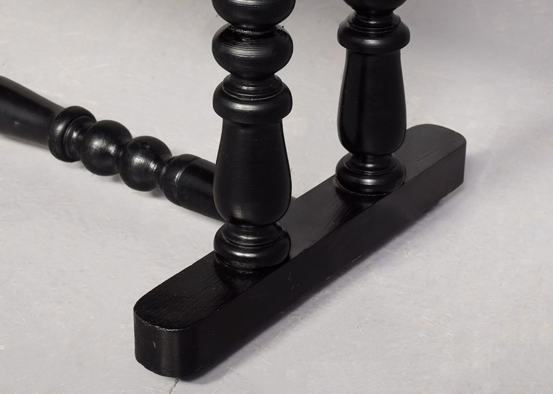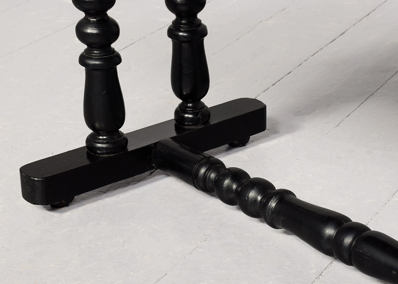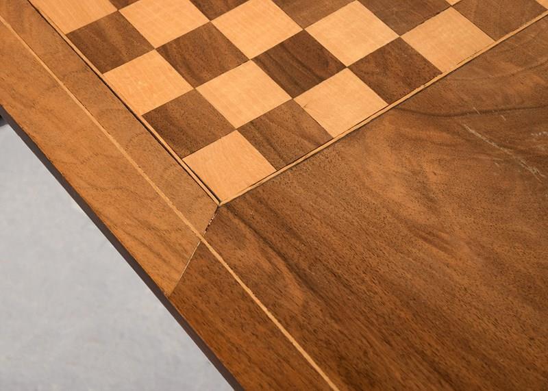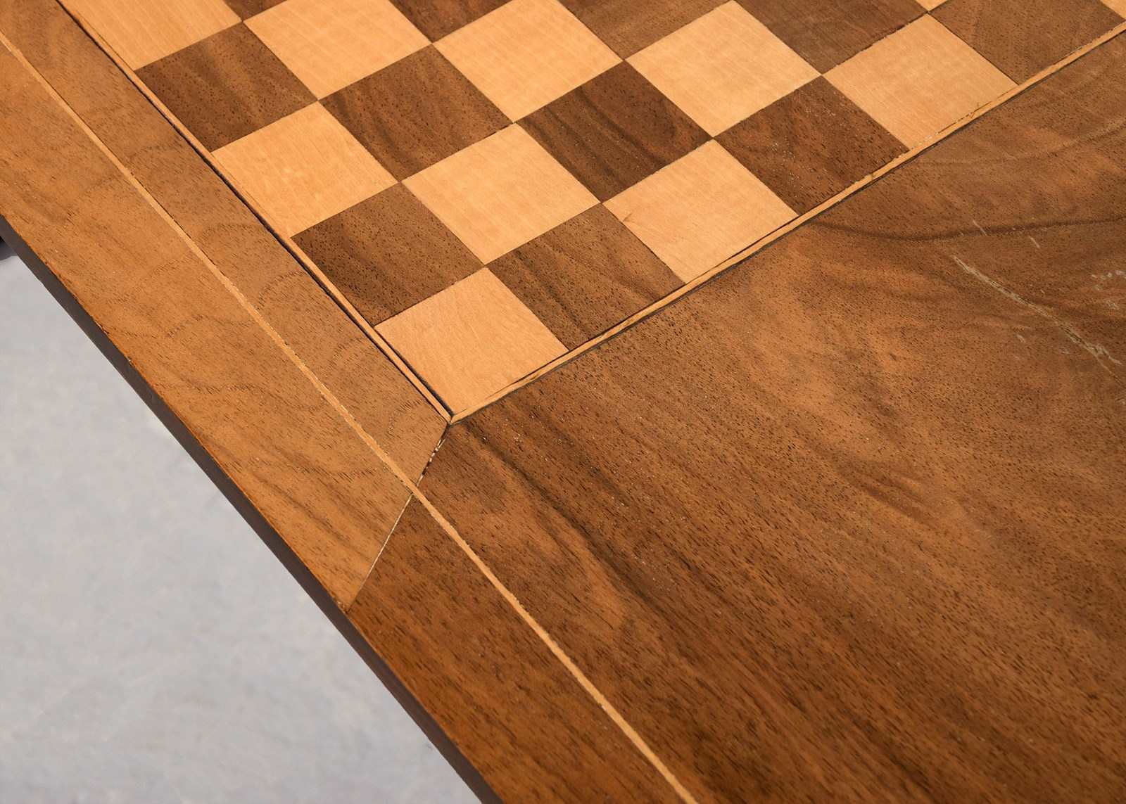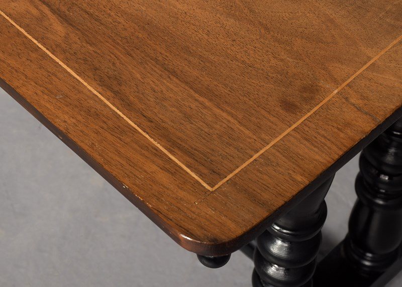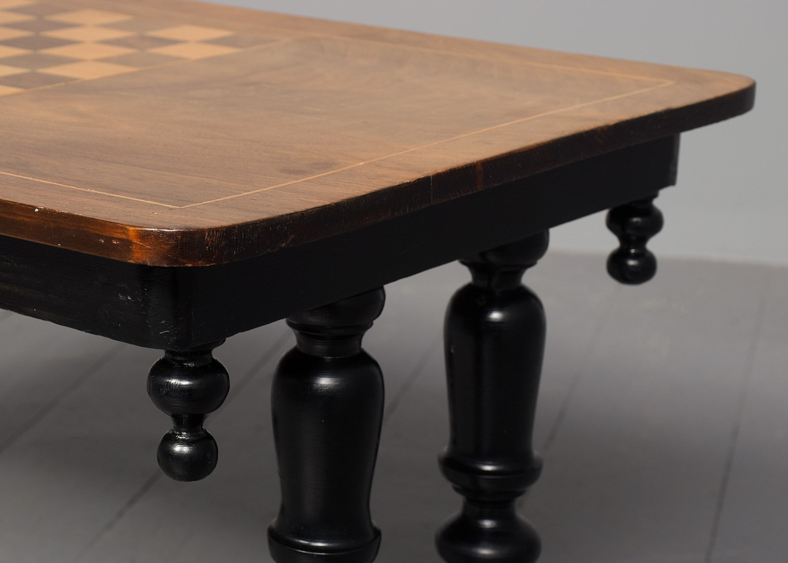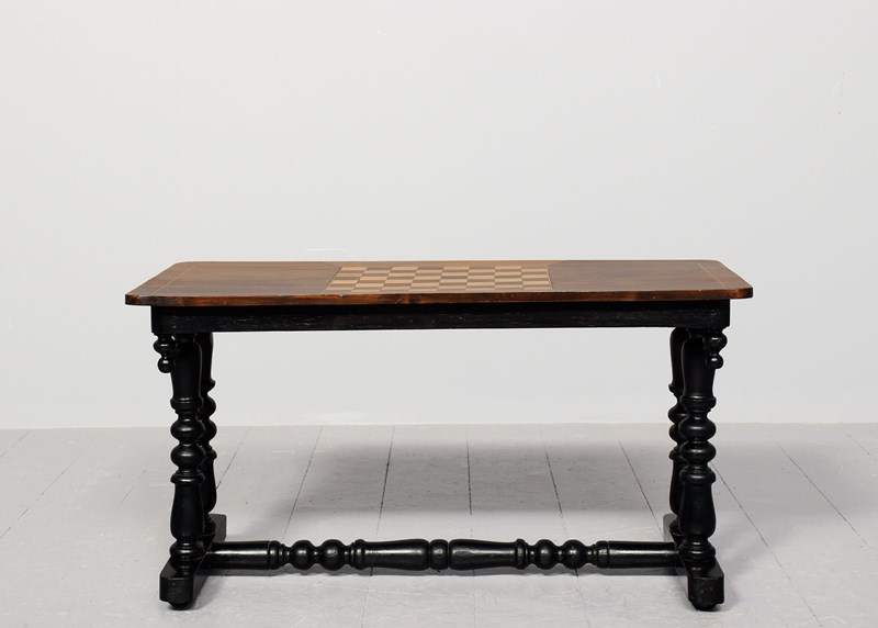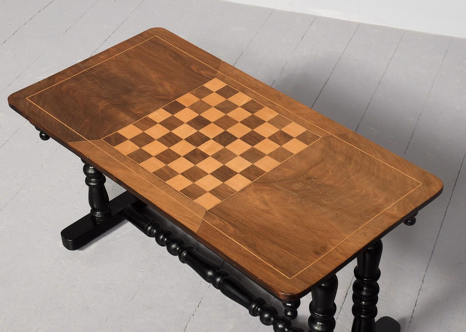 Circa 1870 with adaptations. Victorian figured walnut games table/coffee table. The rectangular top in figured walnut with boxwood inlay and a central chess/draft board. Supported on ebonized bobbin turned legs with platform bases with a bobbin interconnecting stretcher.