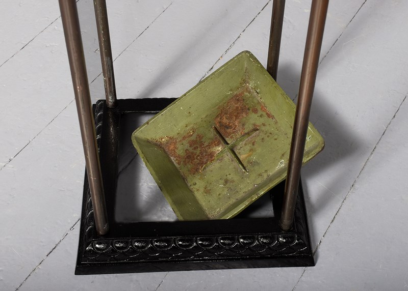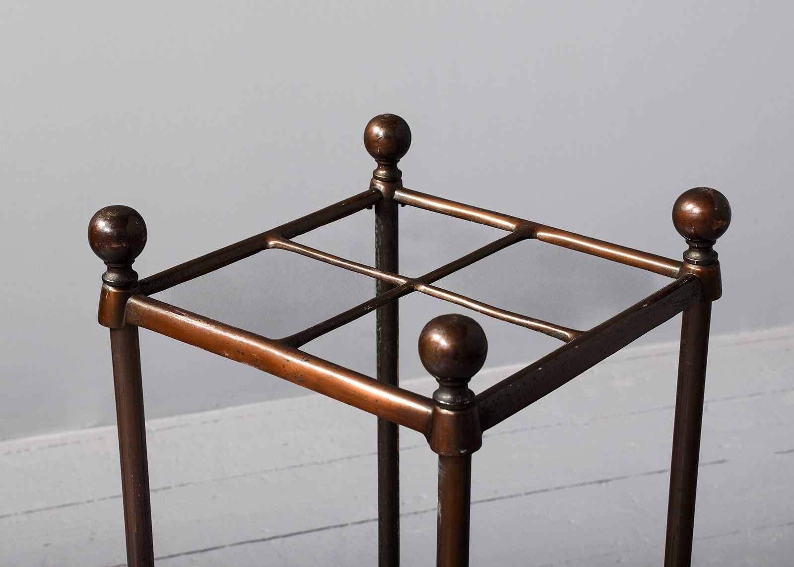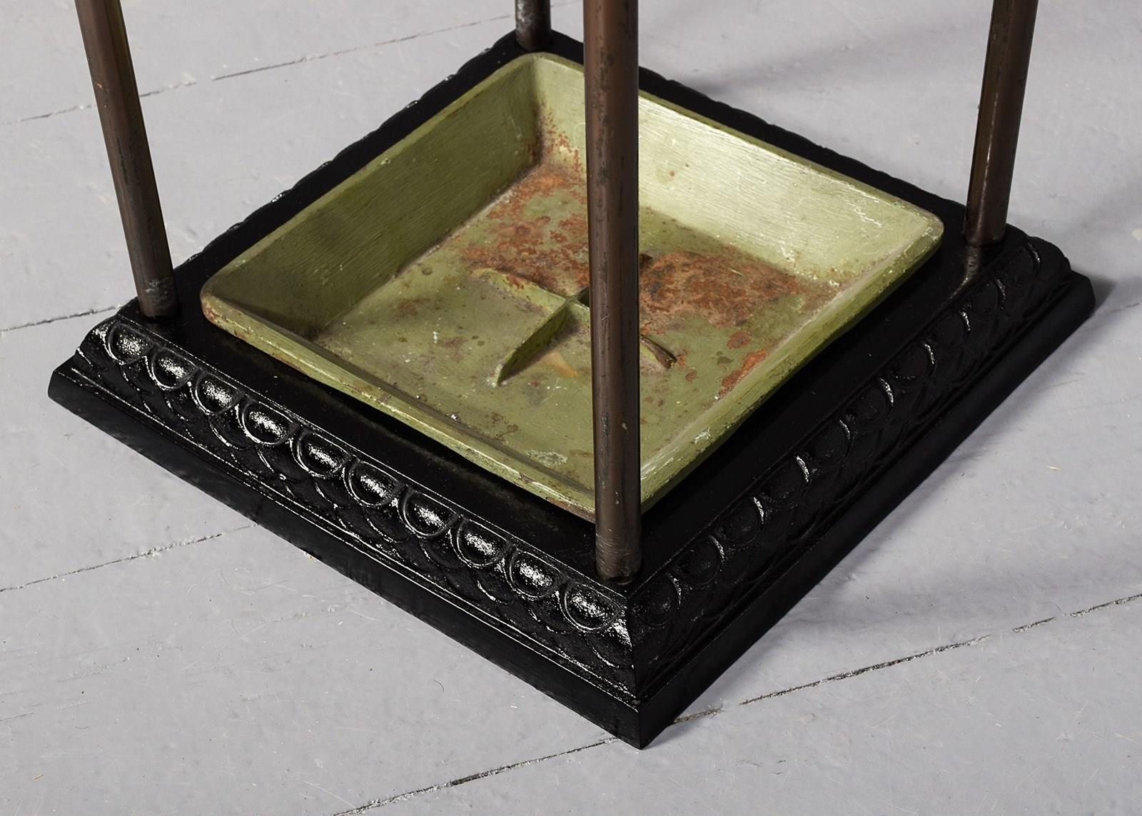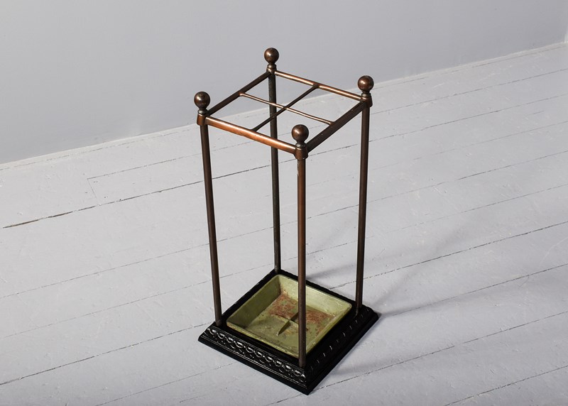 Circa 1870. A mid Victorian oxidised copper four division stick stand, the corners surmounted with circular finials, the circular uprights fixed into a cast iron base with an elegant pattern on the face with a lift-out cast-iron drip tray, clean, sturdy and functional.