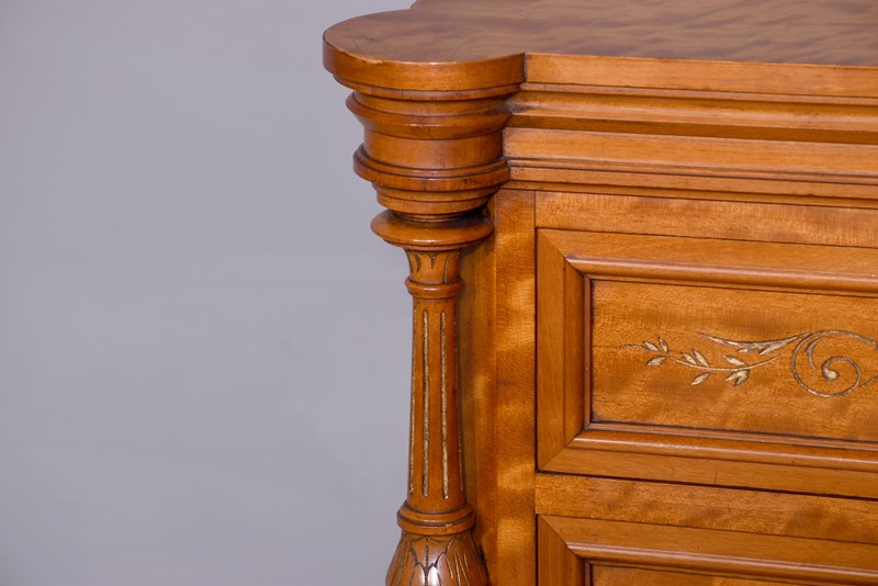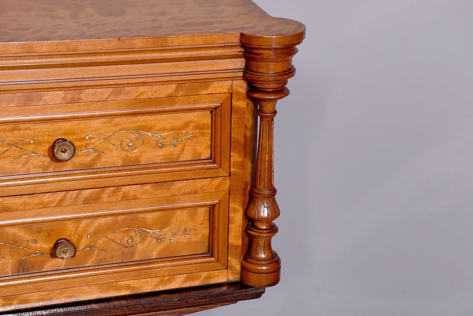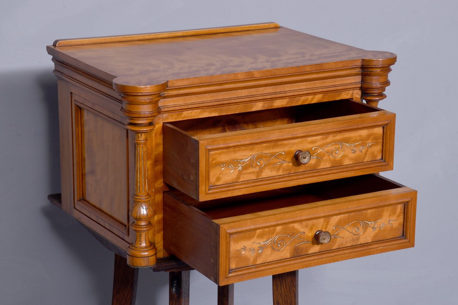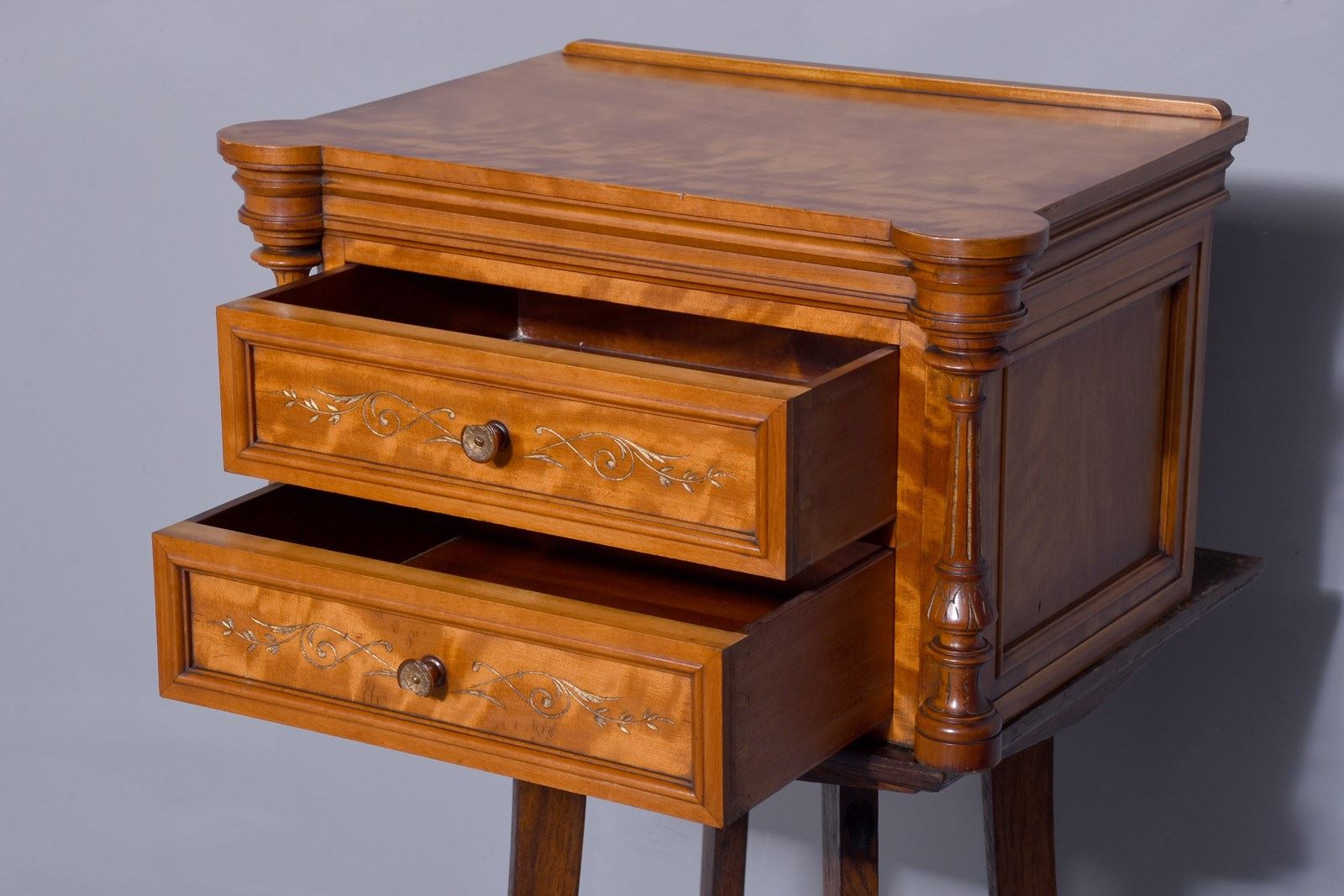Circa 1880 adapted. Victorian Satinwood Jewellery Drawers The top with outward protruding corners and fluted pillars flanking the two drawers with gilded engraved fronts and turned knobs