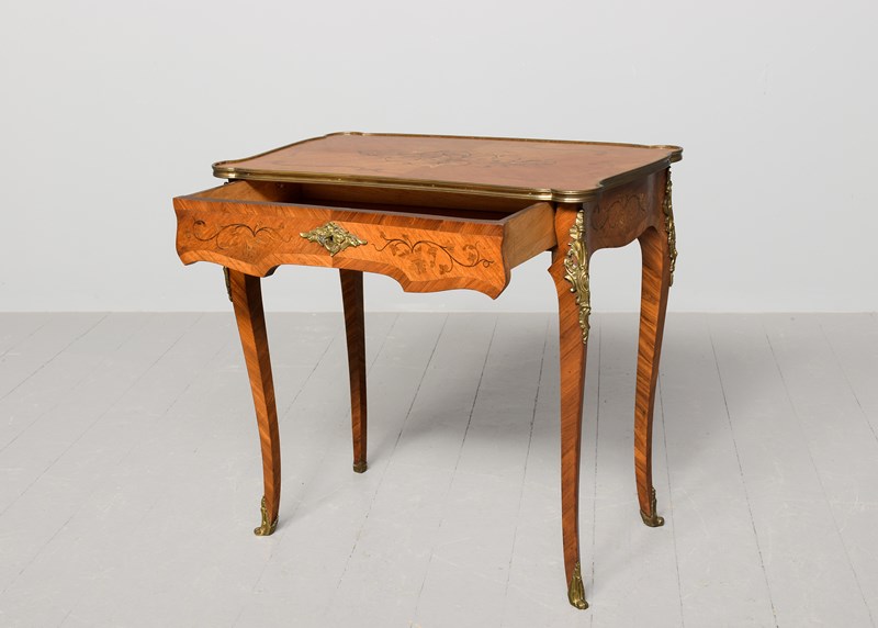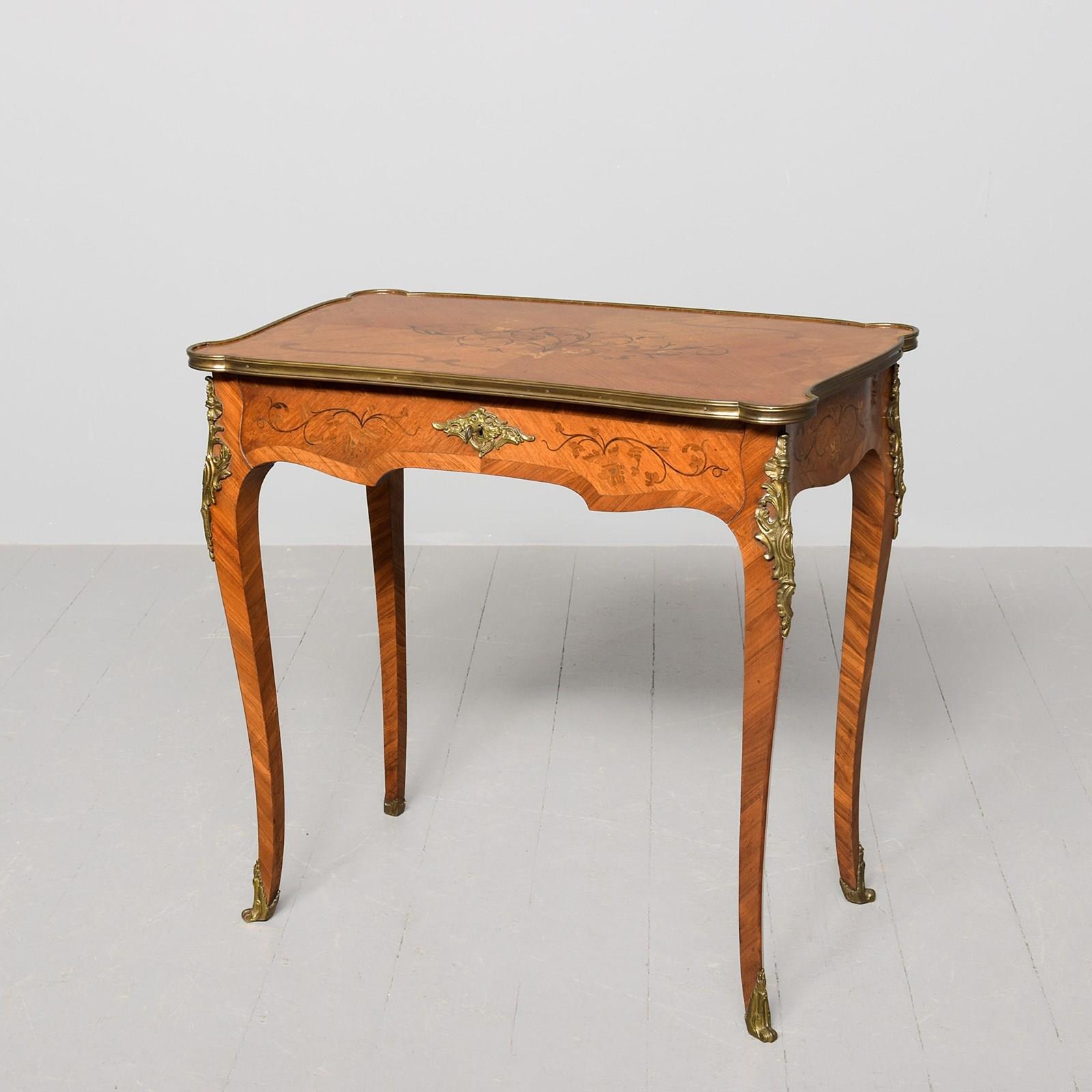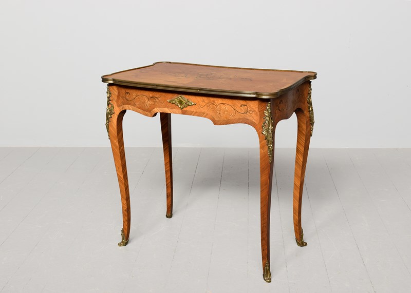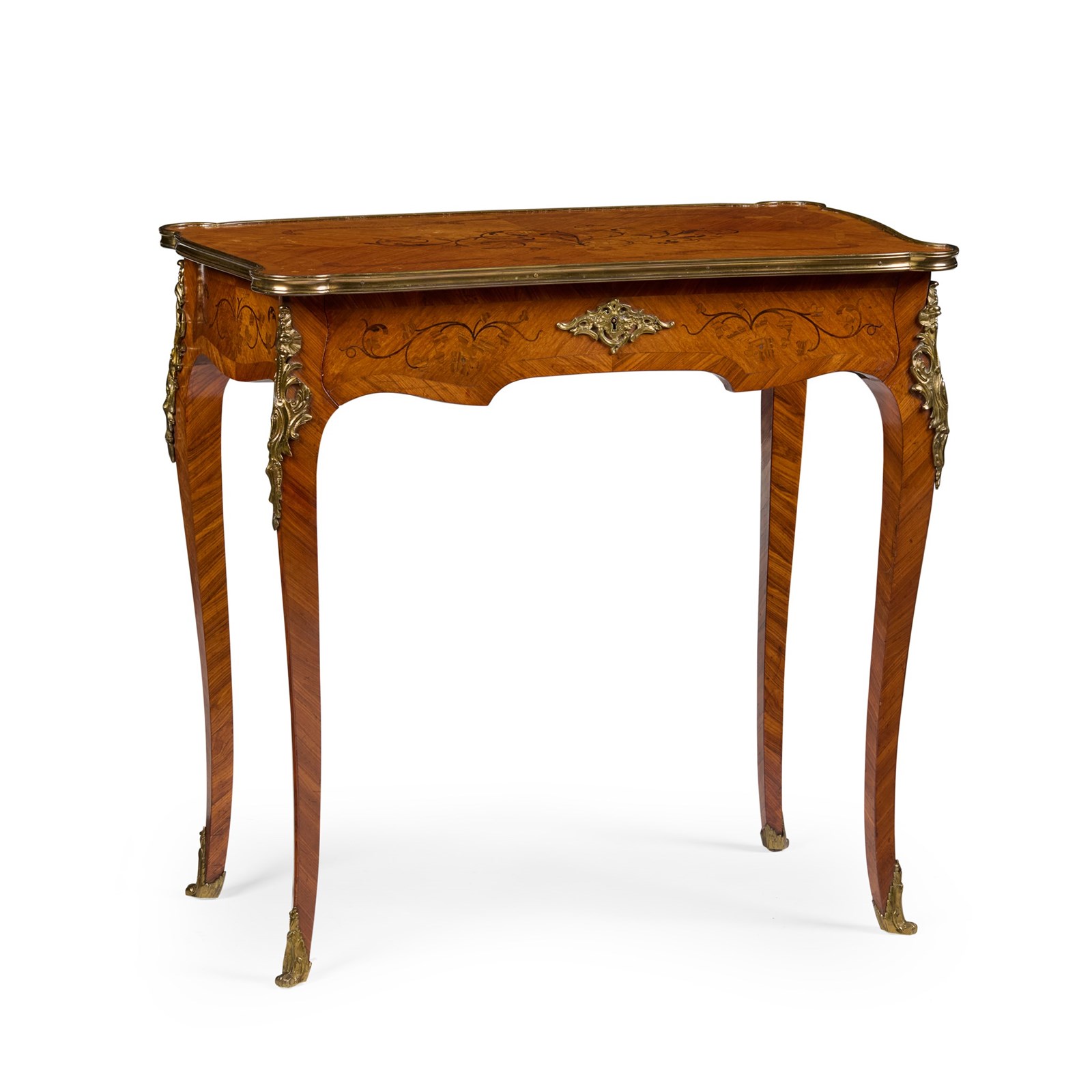 Circa 1860, A Victorian satinwood, kingwood, marquetry and gilt-mounted occasional table in the Louis XV style, the shaped brass-banded rectangular top crossbanded and quarter-veneered with scroll and foliate inlay, above a long frieze drawer, raised on elegant cabriole legs with gilt metal mounts