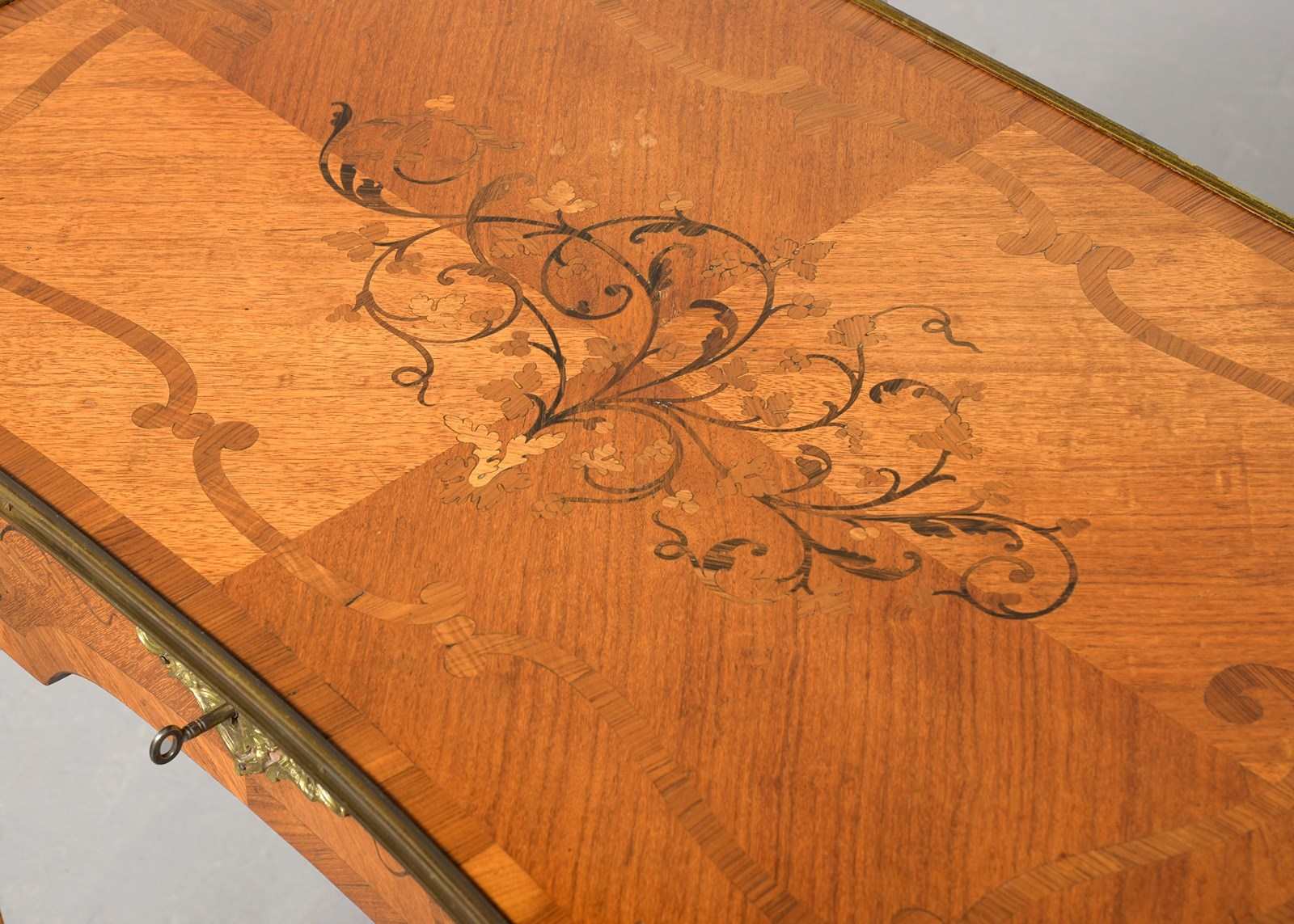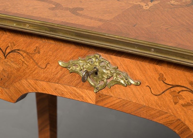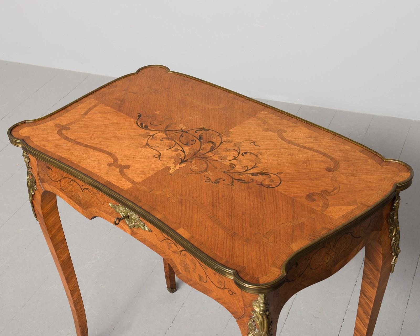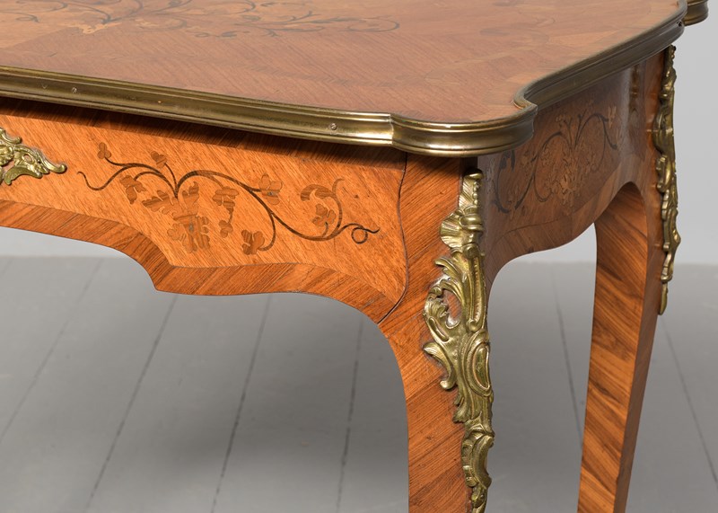 Circa 1860, A Victorian satinwood, kingwood, marquetry and gilt-mounted occasional table in the Louis XV style, the shaped brass-banded rectangular top crossbanded and quarter-veneered with scroll and foliate inlay, above a long frieze drawer, raised on elegant cabriole legs with gilt metal mounts