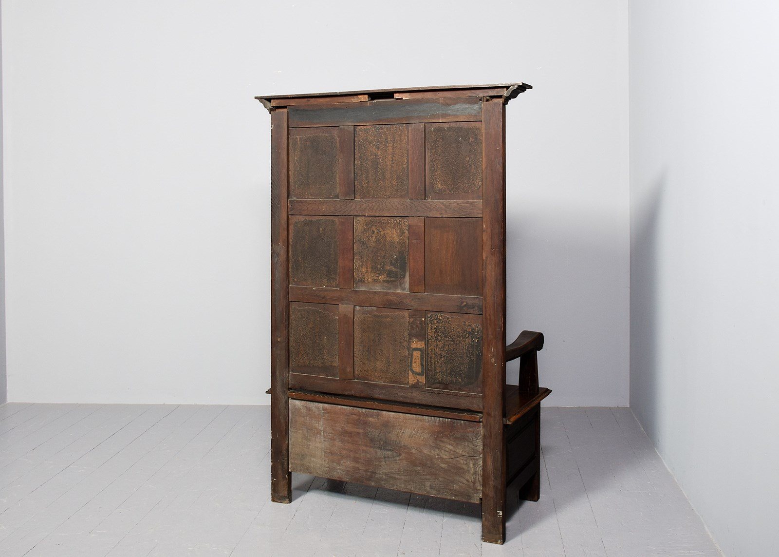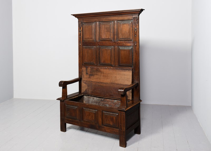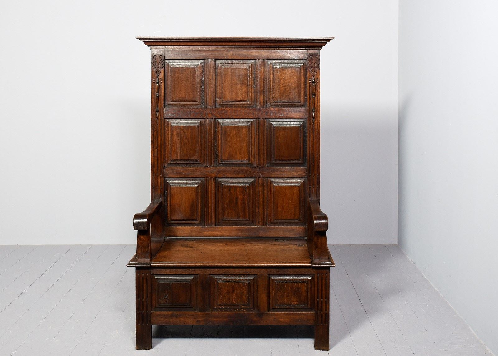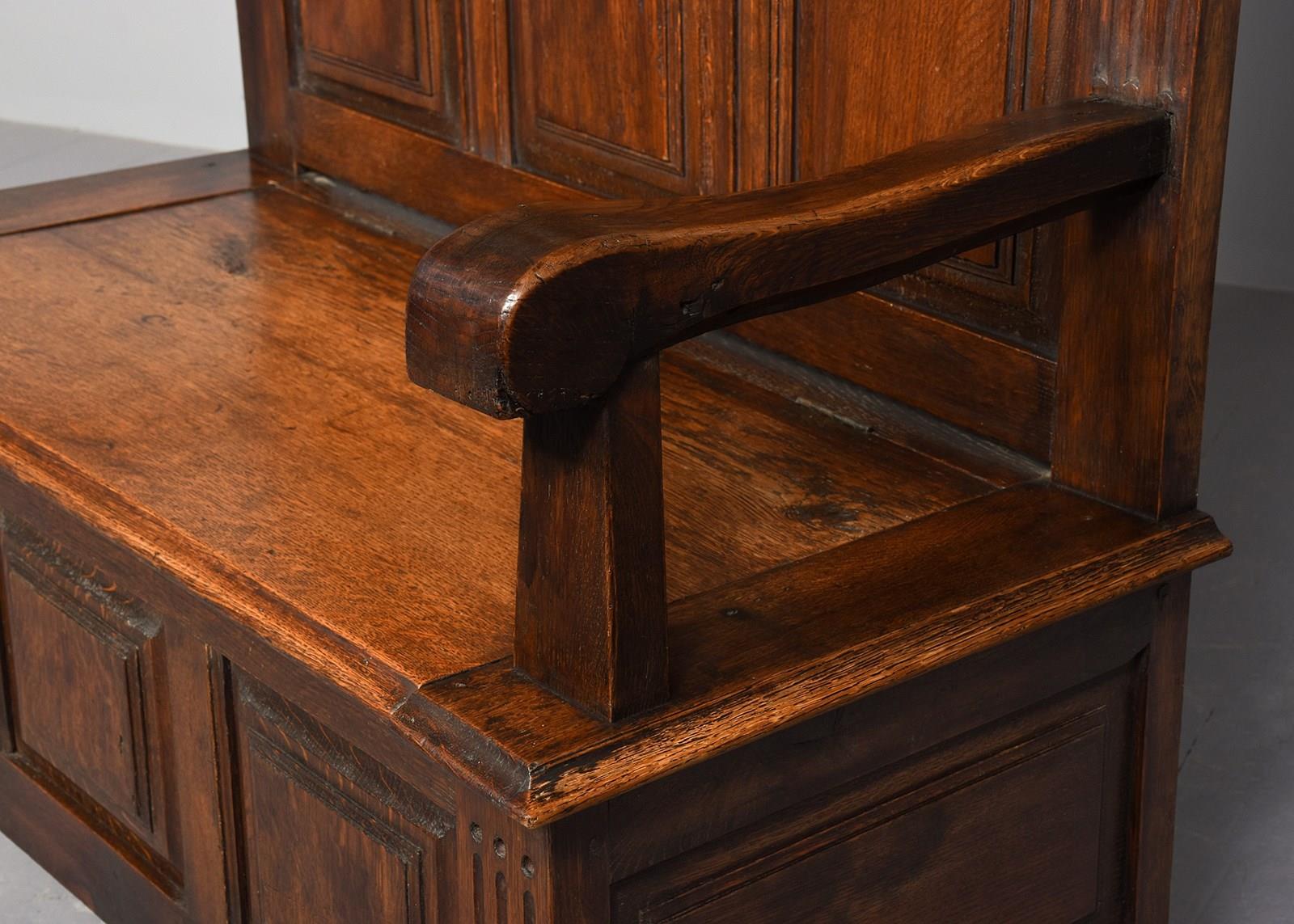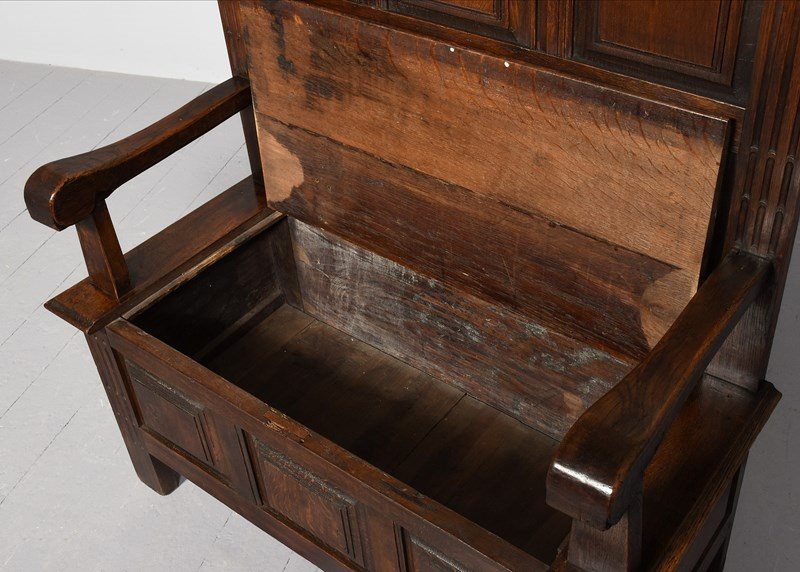 Victorian Tall Panelled-Oak Hall Settle, With Storage