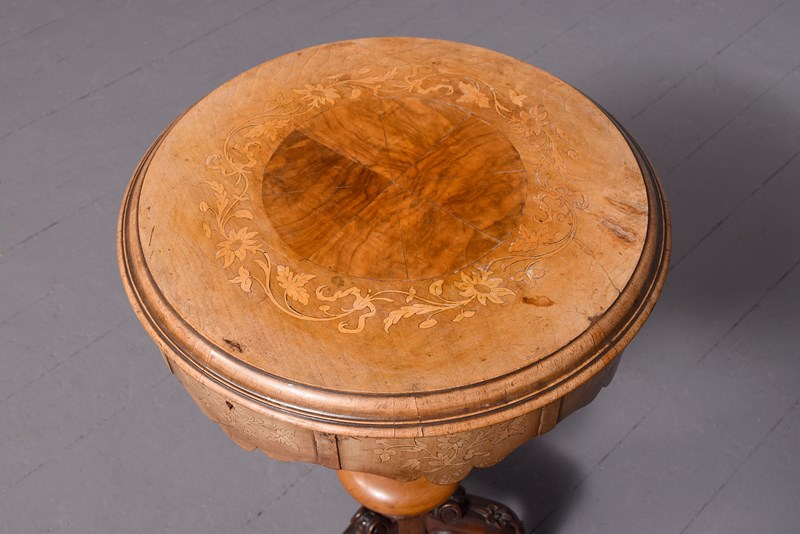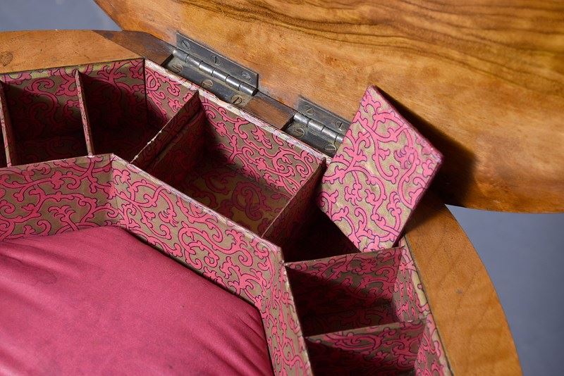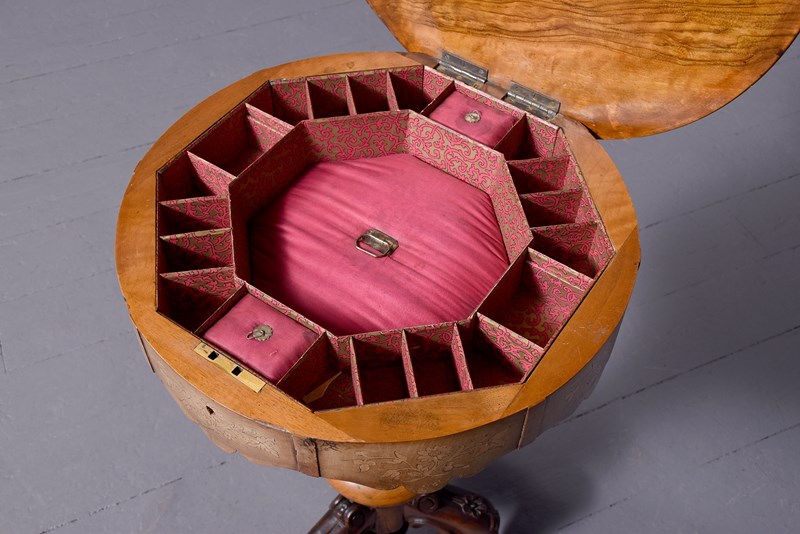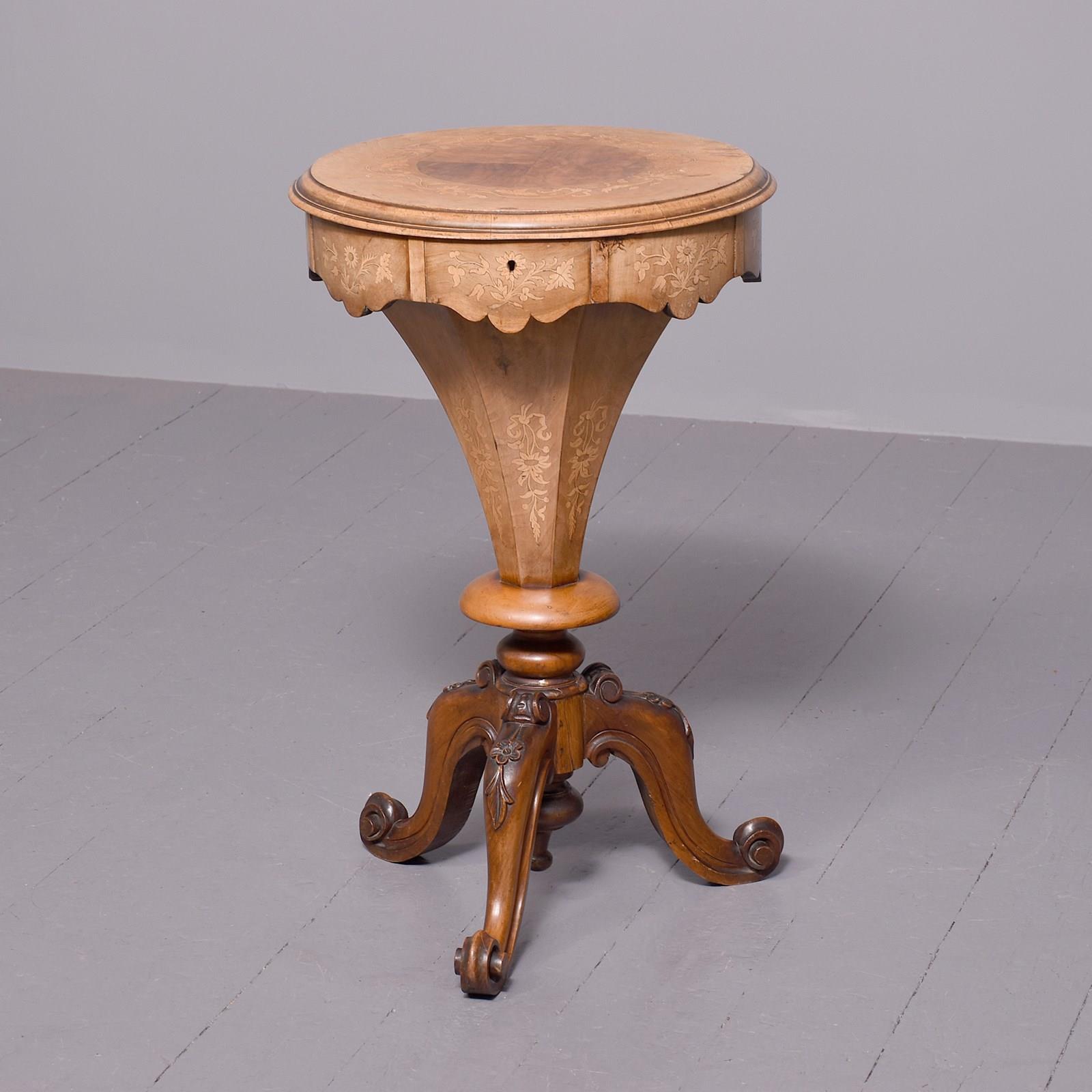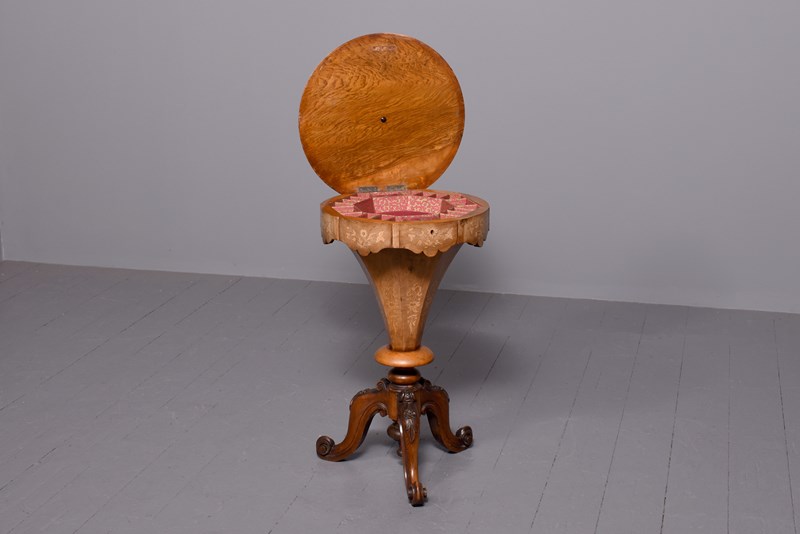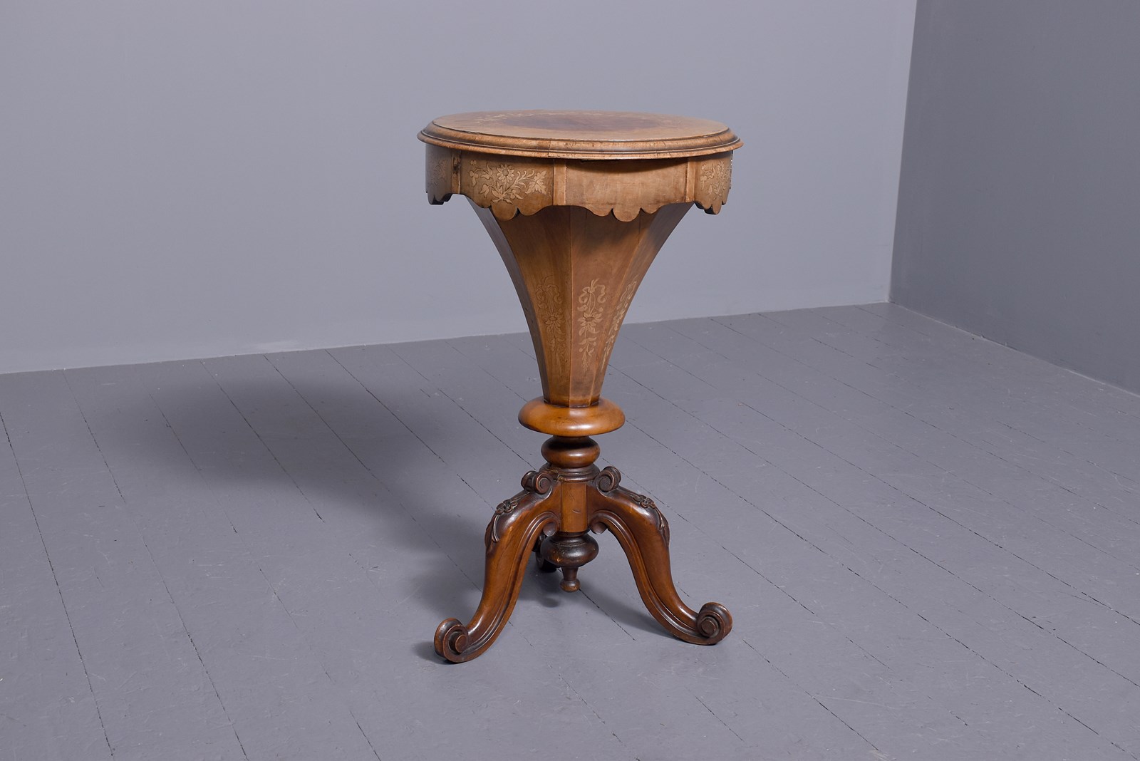 Circa 1860, a mid-Victorian burr walnut and inlaid trumpet-shaped work table, the circular t marquetry top with segmented burr walnut to the centre and elegant moulded fore-edge the top is hinged, open and revealed a well fitted interior with various compartments, with a lift out centre section which follows the form of the conical base, with a shaped inlaid frieze, the circular base issuing three elegant cabriole legs with foliate carving on the knees and scrolling on the top , finished in a well curled foot, with a massive downward facing finial in the centre.