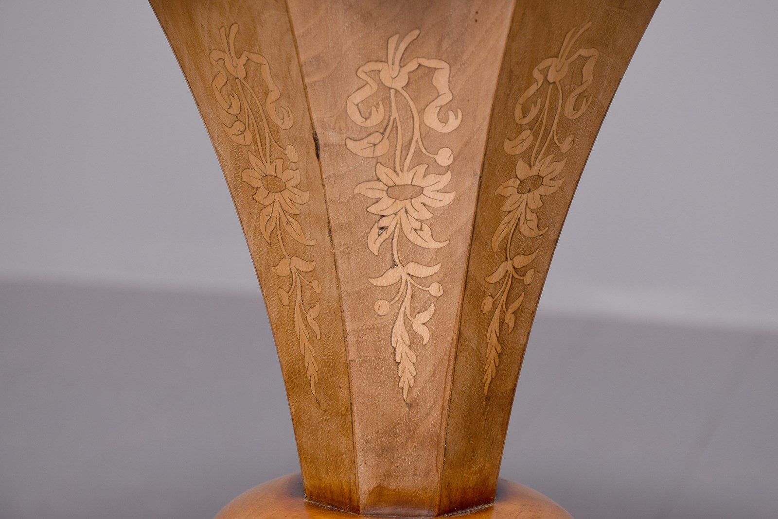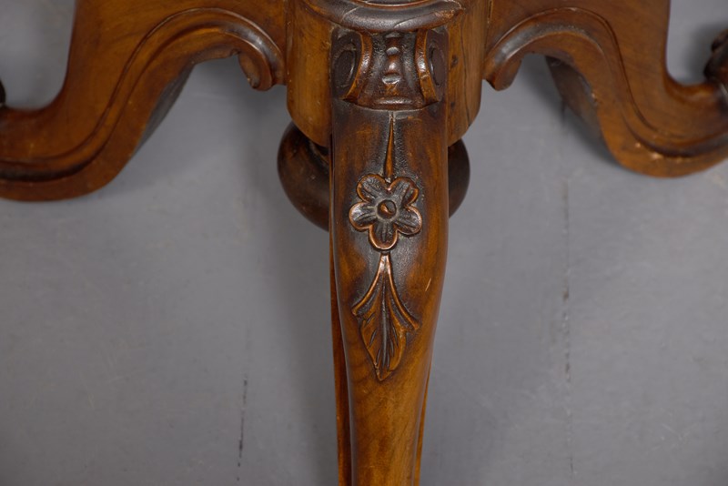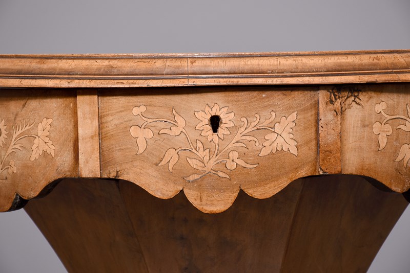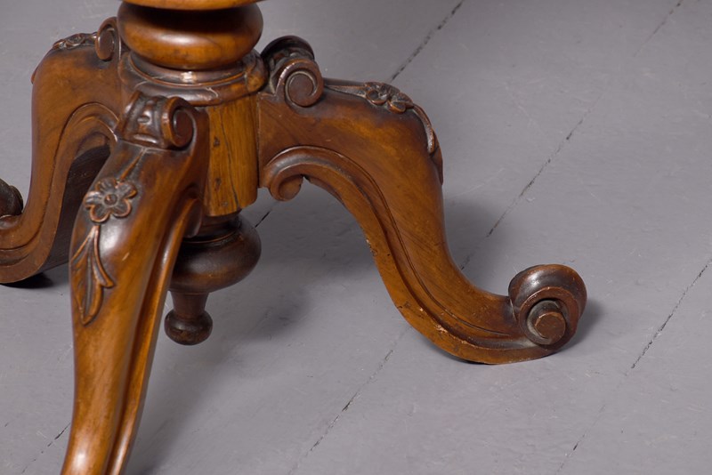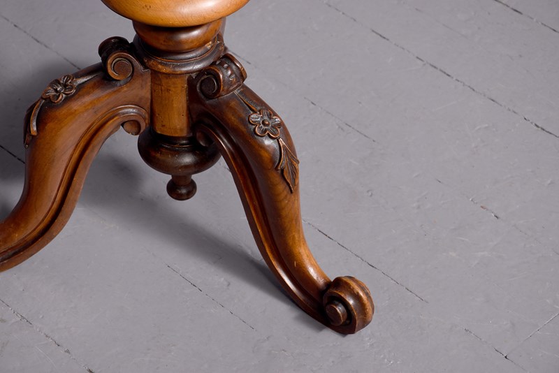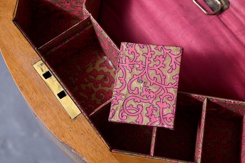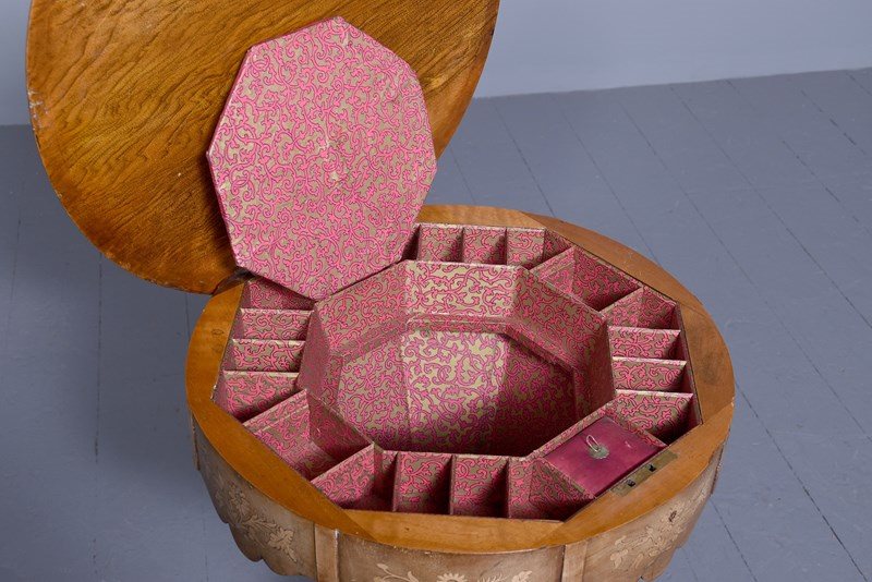 Circa 1860, a mid-Victorian burr walnut and inlaid trumpet-shaped work table, the circular t marquetry top with segmented burr walnut to the centre and elegant moulded fore-edge the top is hinged, open and revealed a well fitted interior with various compartments, with a lift out centre section which follows the form of the conical base, with a shaped inlaid frieze, the circular base issuing three elegant cabriole legs with foliate carving on the knees and scrolling on the top , finished in a well curled foot, with a massive downward facing finial in the centre.
