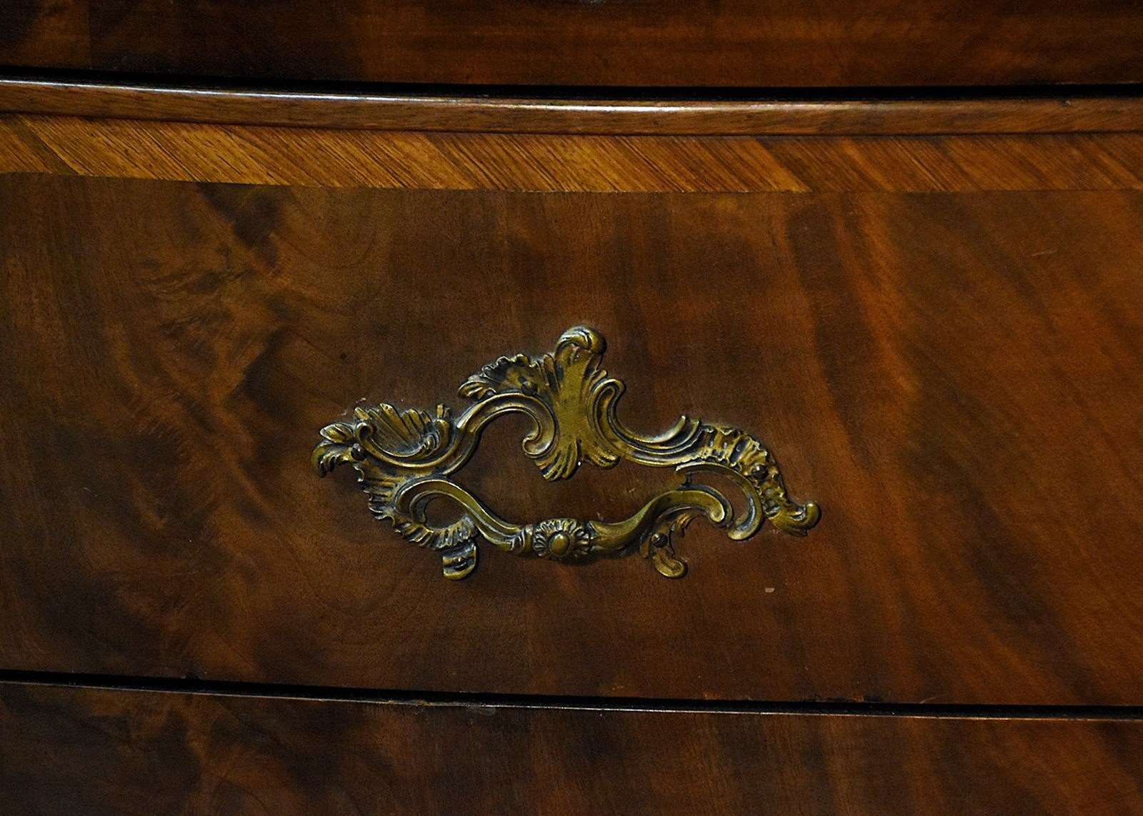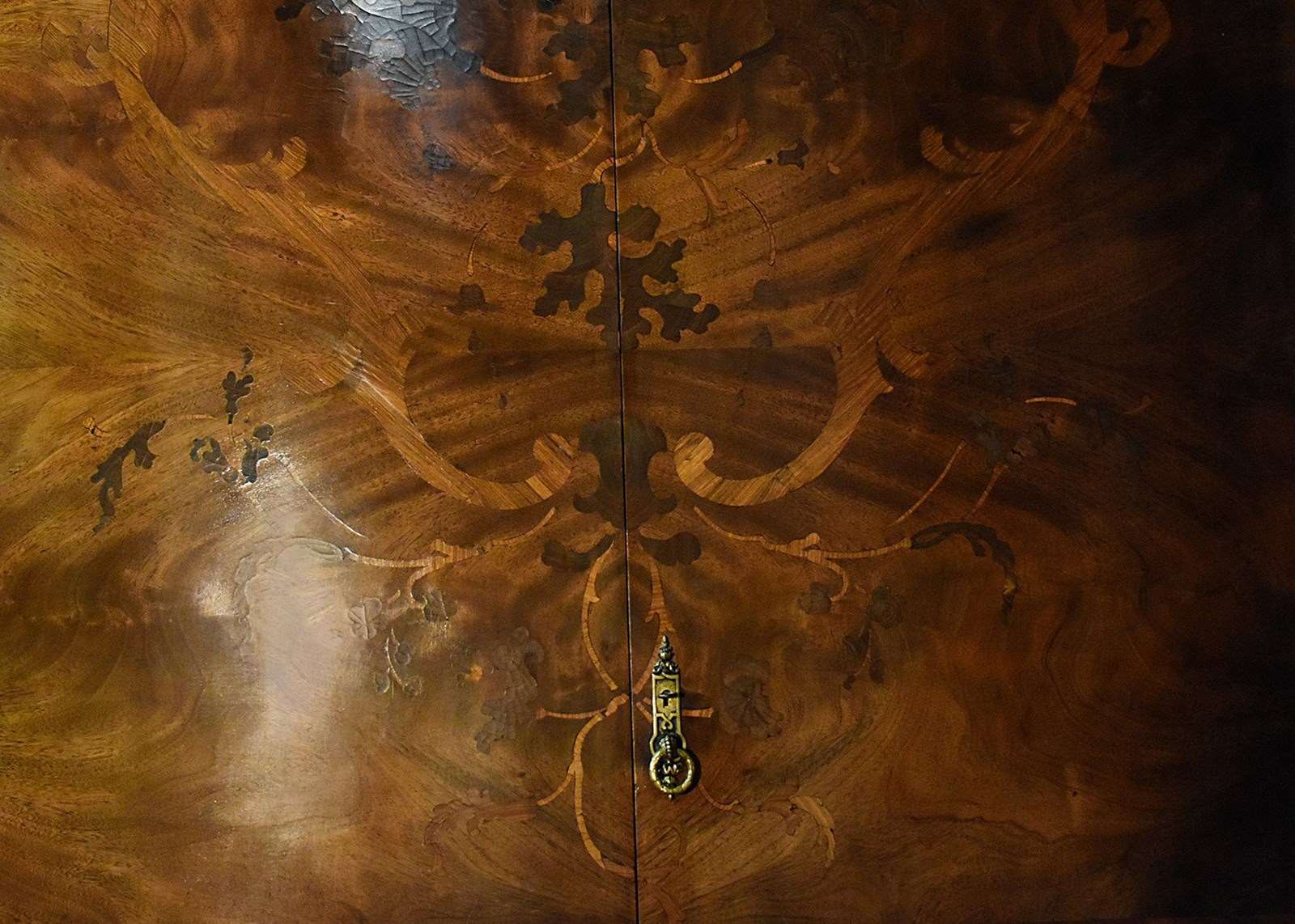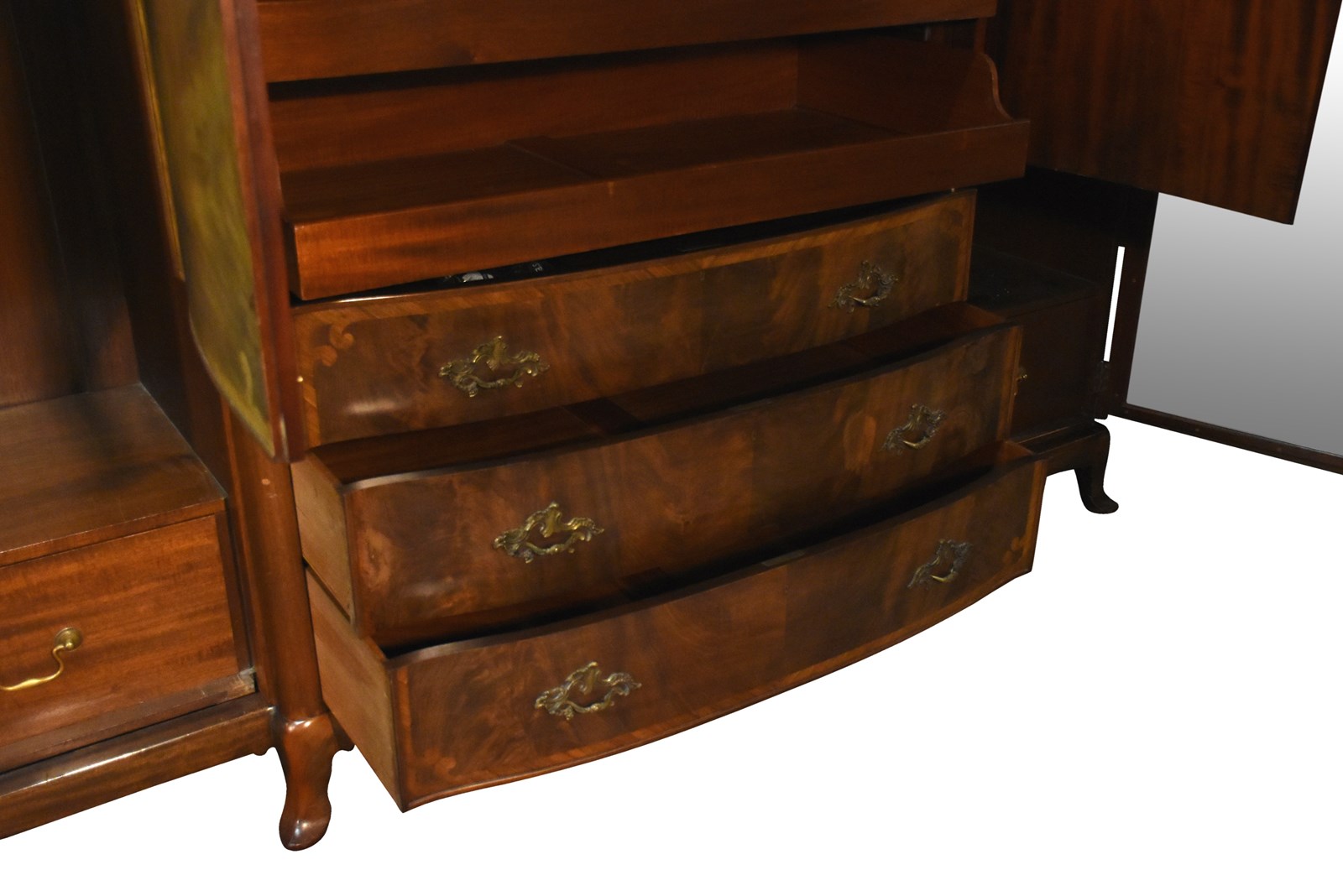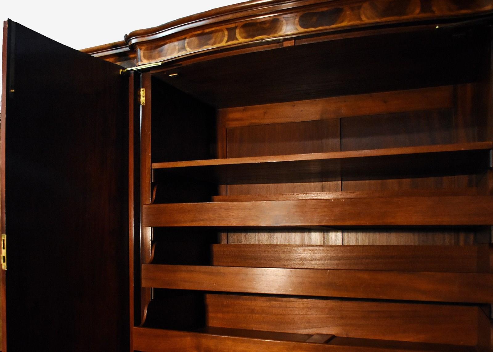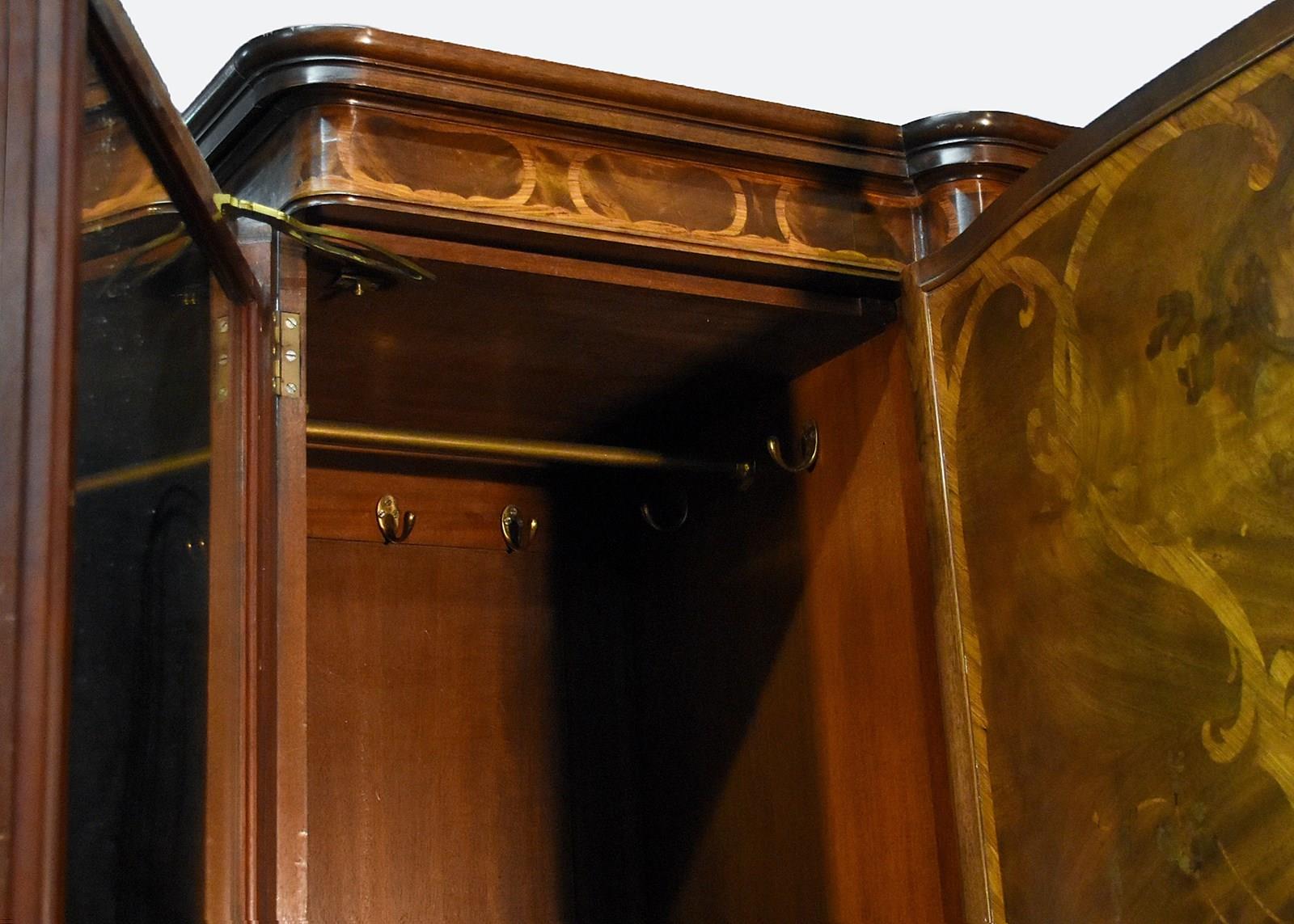 Circa 1900, an exhibition quality walnut wardrobe by Whytock & Reid of Edinburgh, of serpentine breakfront outline with an elegant stylish moulded cornice above a pair of doors with strap work and foliate inlay, opening to sliding trays, above three long drawers with elegant hardware, flanked by long cupboards with hanging spaces and a base drawer with mirror-backed doors, all resting on an elegant base with a shaped apron, raised on classic ‘Sir Robert Lorimer’ feet finishing with an elegant pad foot.