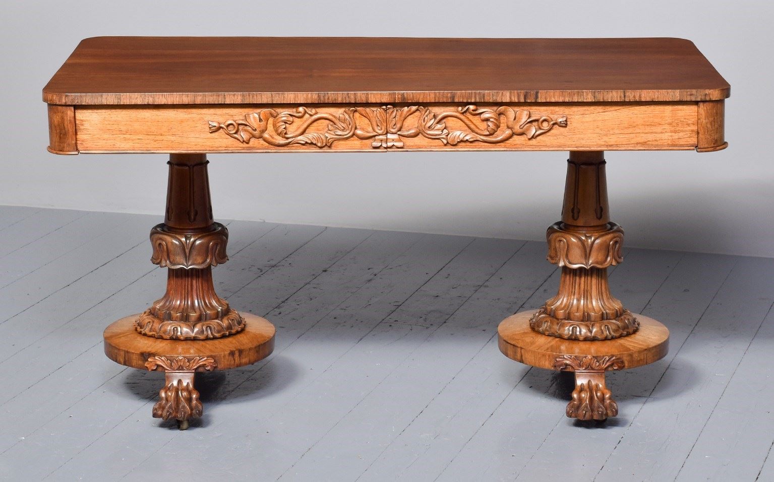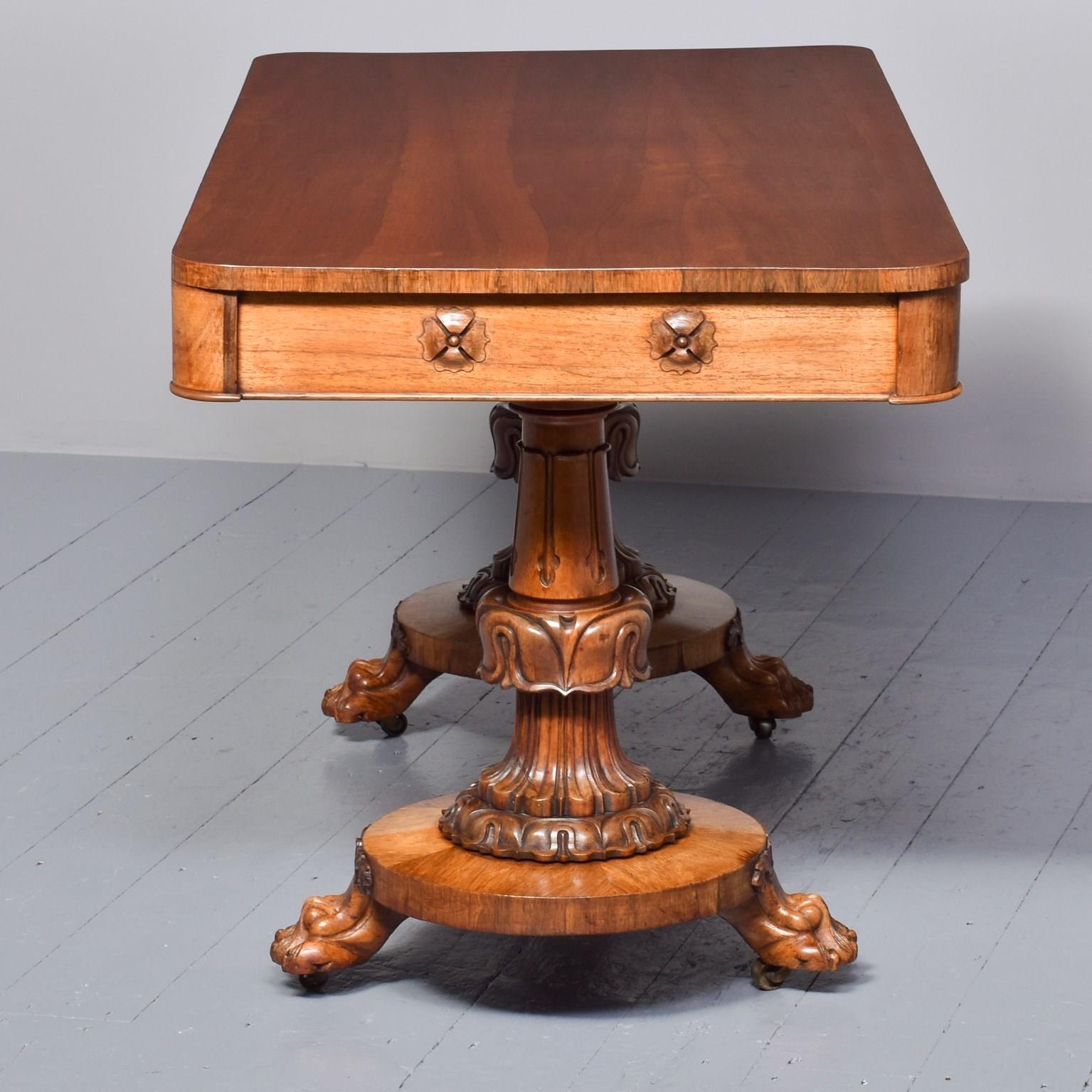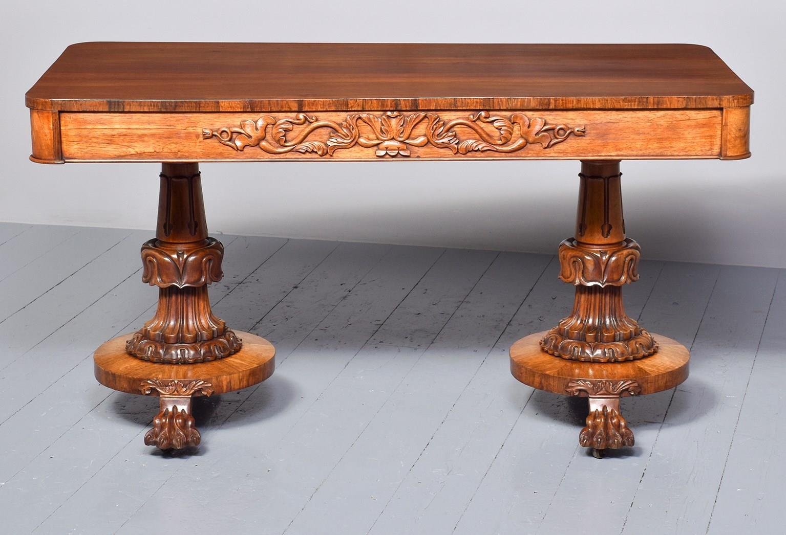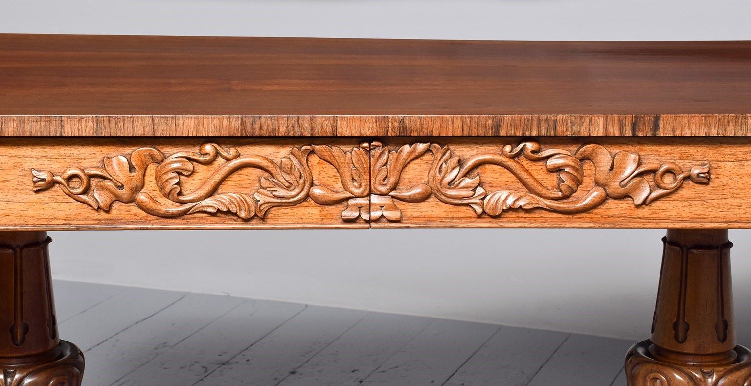 Circa 1830. Exceptional quality William IV freestanding rosewood library table. The rectangular top in figured Brazilian rosewood with cross banded fore-edges above two frieze drawers with relief foliate carvings and cedar drawer linings. The sides and the back with matching foliate carvings. All supported on two exceptional acanthus-carved, turned legs on circular platforms with further foliate carving over deeply carved lion claw feet with hidden brass casters.