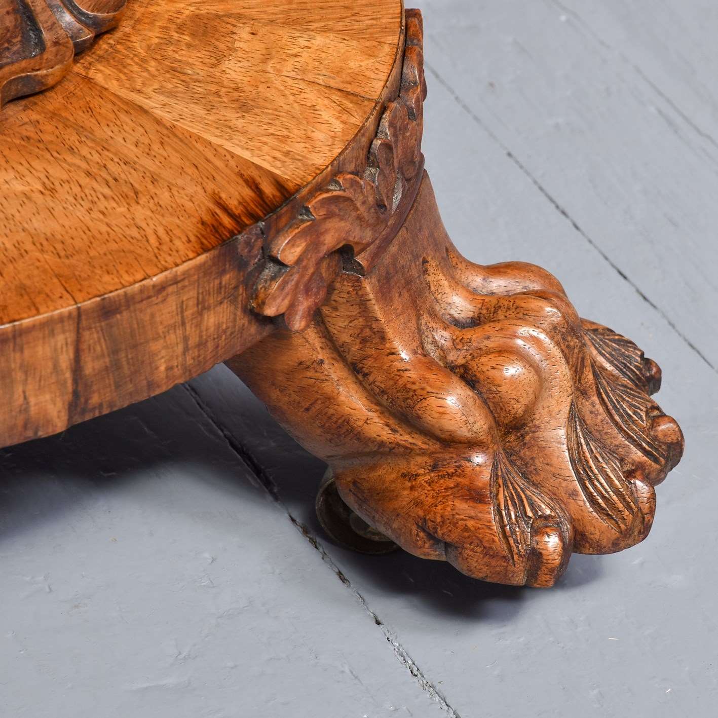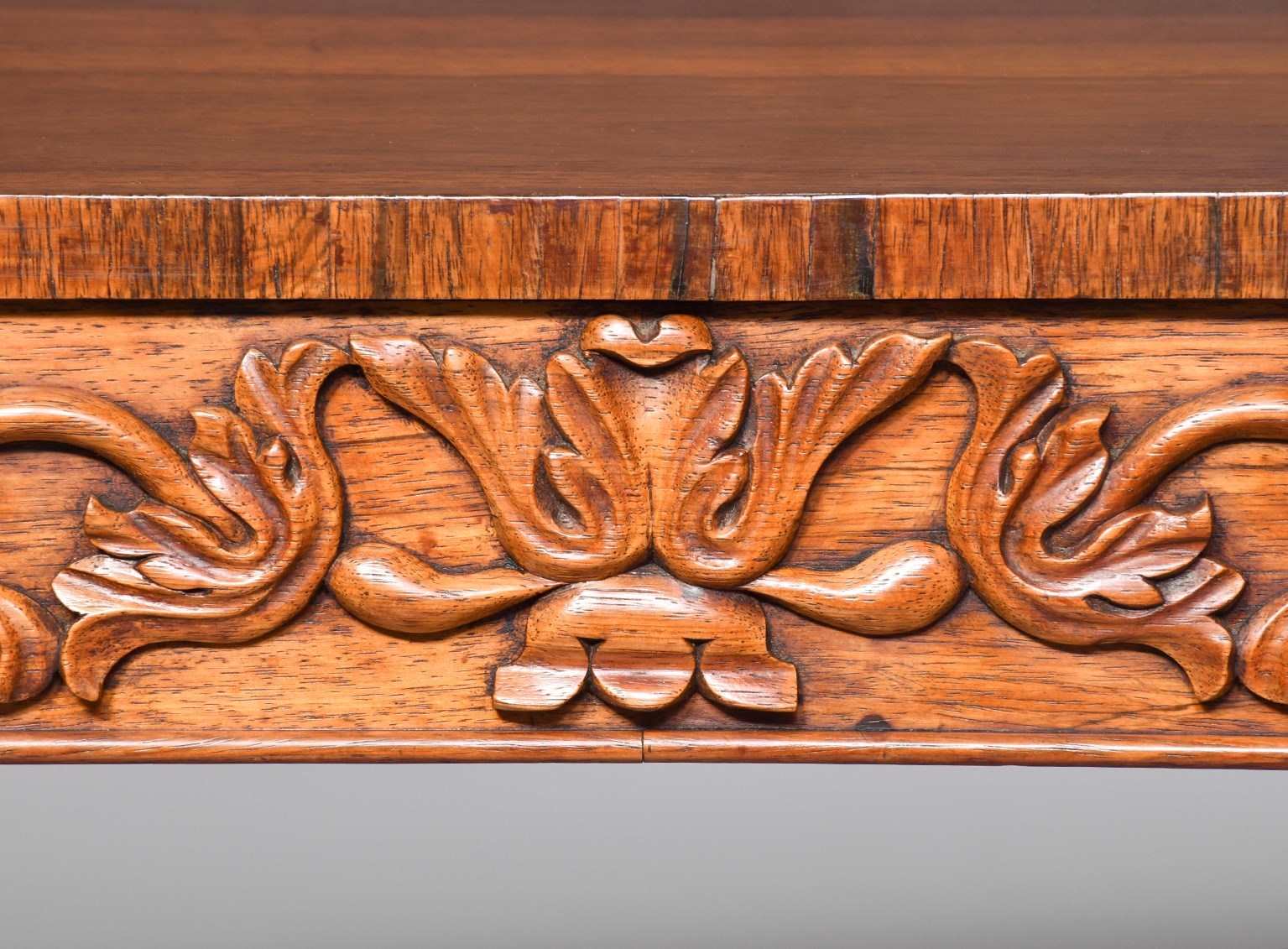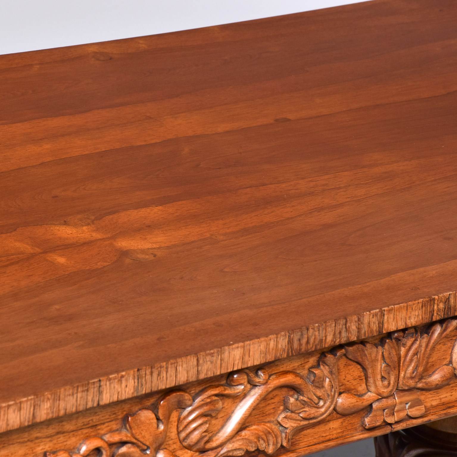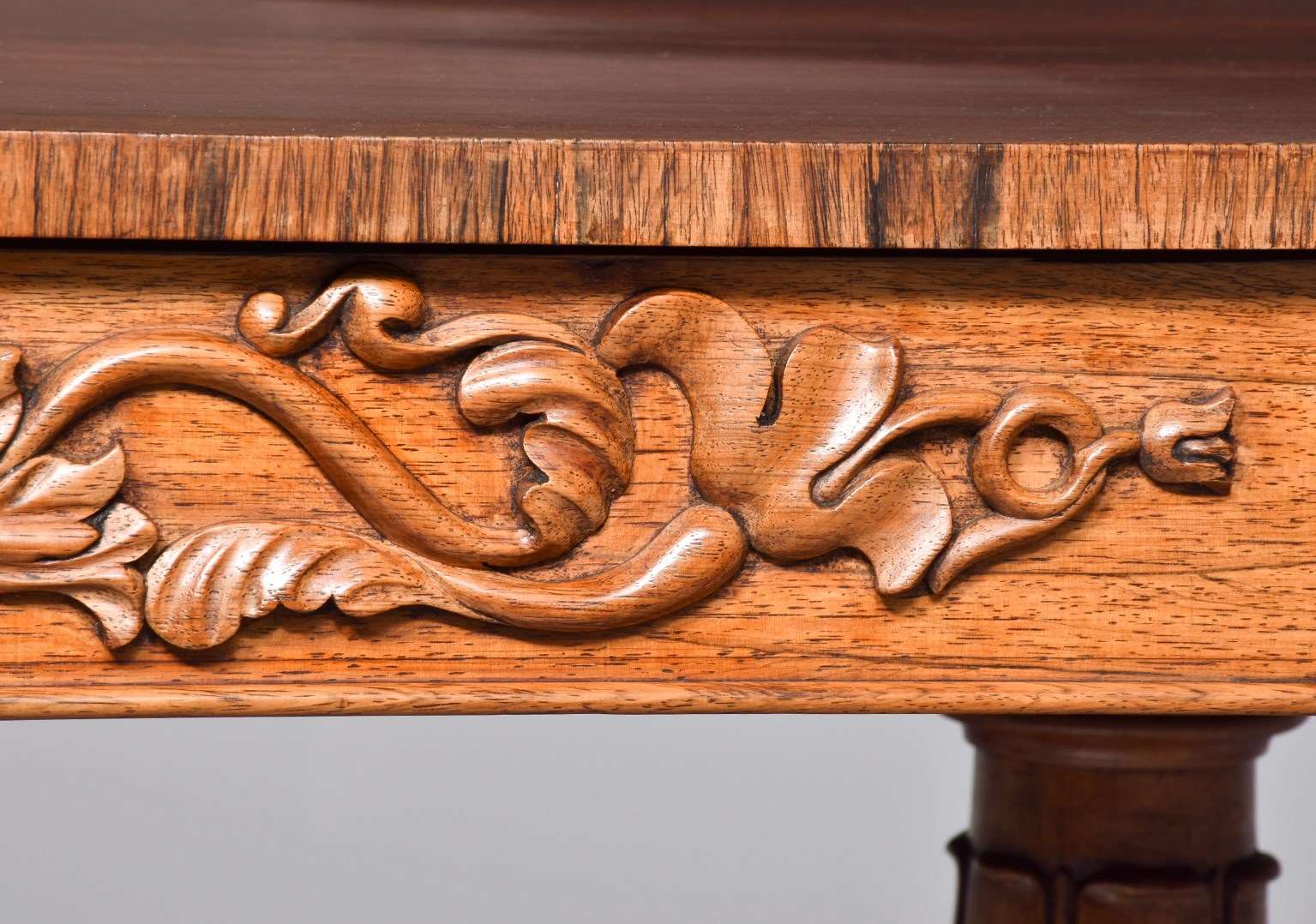 Circa 1830. Exceptional quality William IV freestanding rosewood library table. The rectangular top in figured Brazilian rosewood with cross banded fore-edges above two frieze drawers with relief foliate carvings and cedar drawer linings. The sides and the back with matching foliate carvings. All supported on two exceptional acanthus-carved, turned legs on circular platforms with further foliate carving over deeply carved lion claw feet with hidden brass casters.