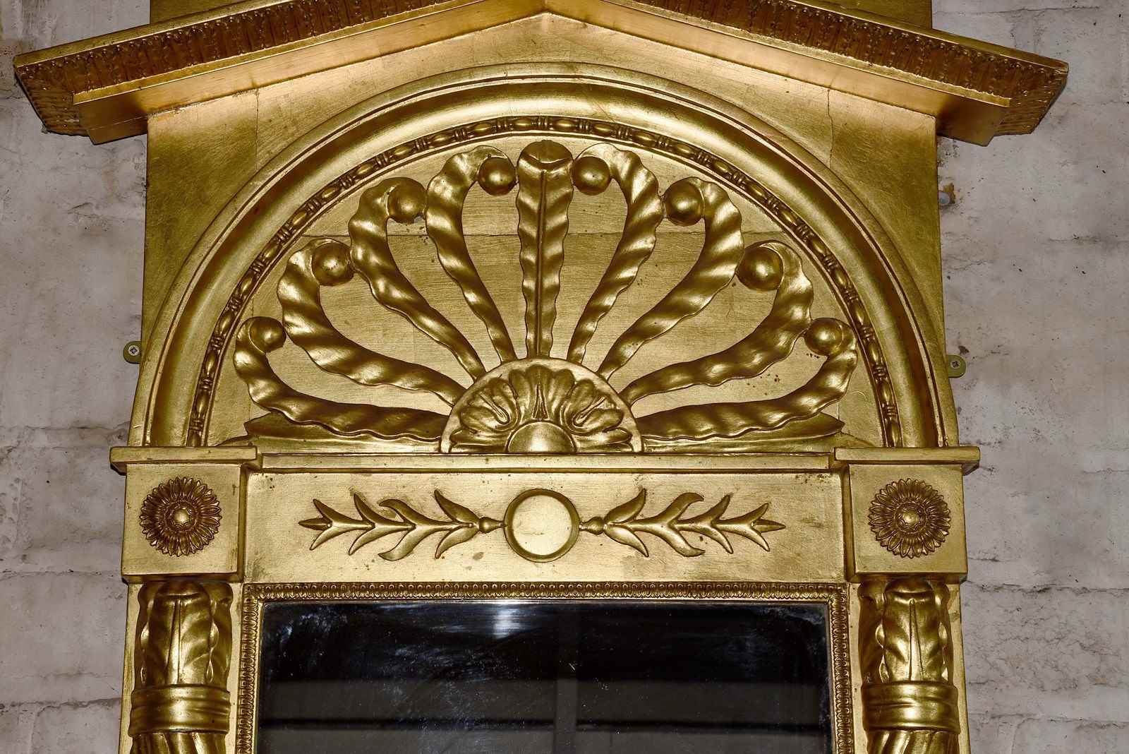 Circa 1830, unusual carved and gilded William IV mirror. With a carved and gilded architectural pediment above an arc section with a sunburst design. The 2 mirror plates are between William IV pilasters with acanthus leaves to the top, central foliate carving above a single shelf with a gilded apron.