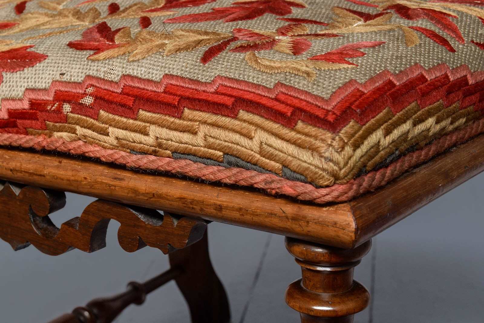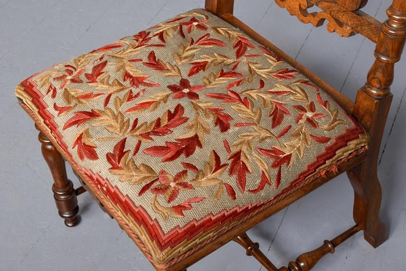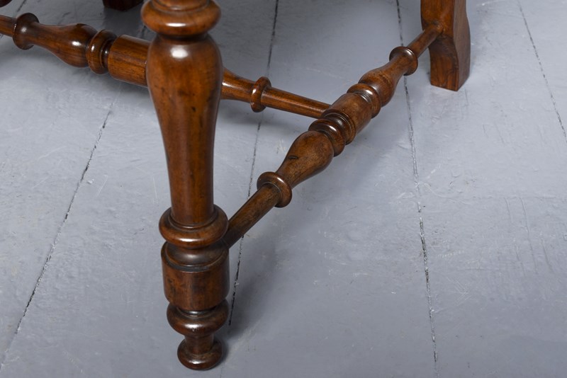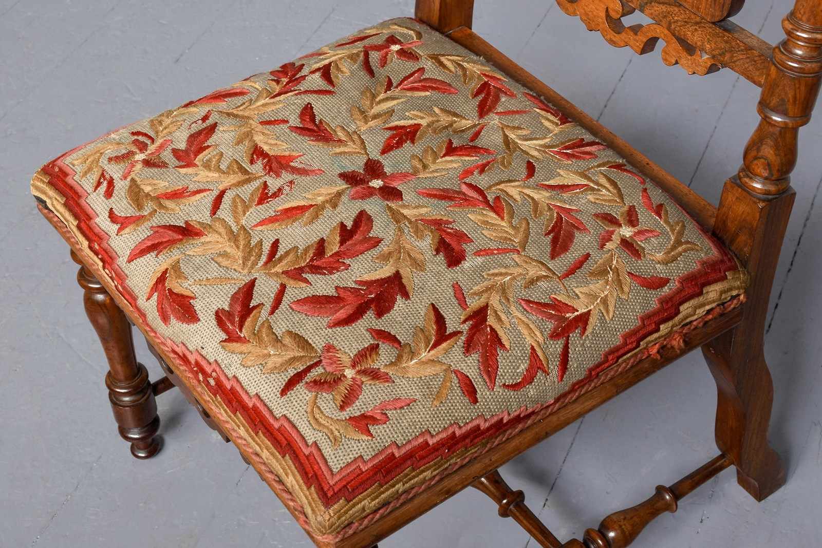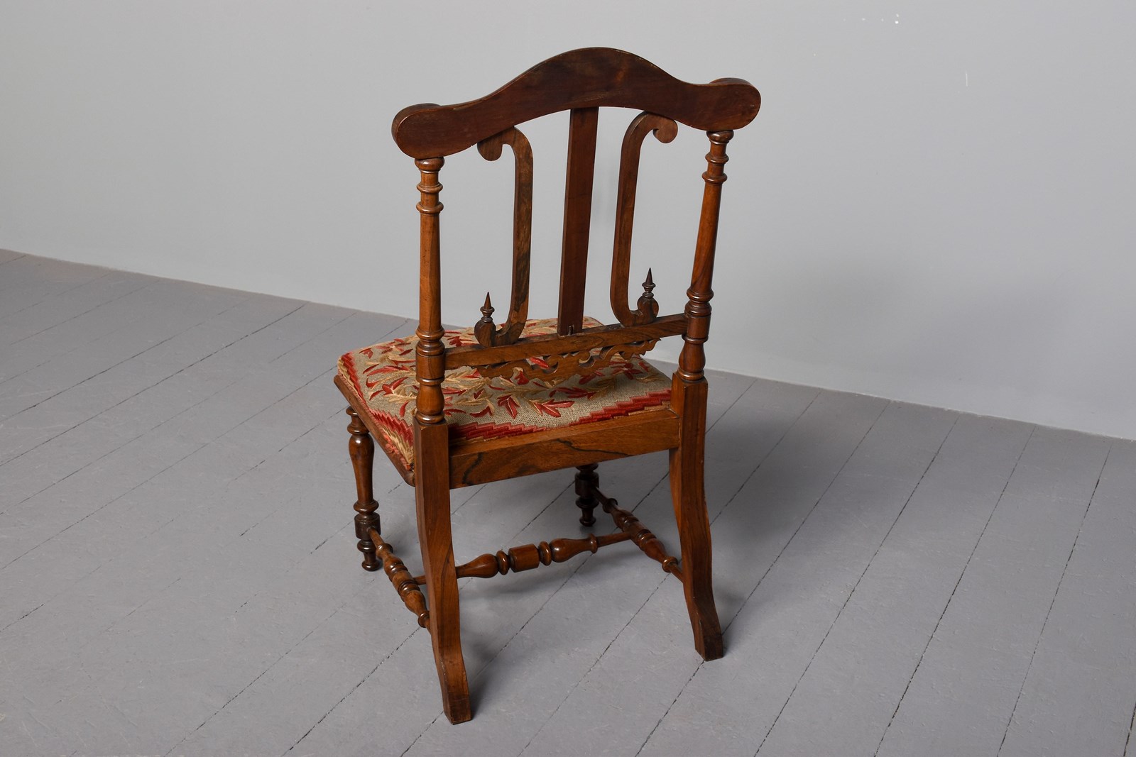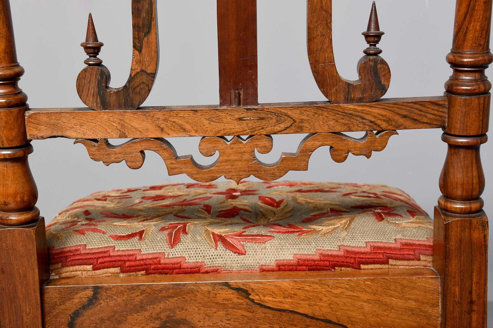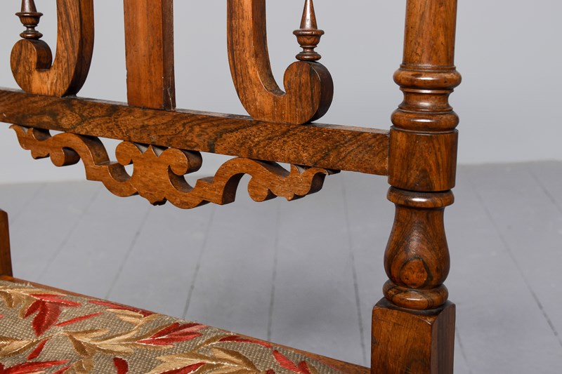 Circa 1830. A good William IV rosewood framed side chair, the shaped cresting rail with scrolling on the end supported by two turned and tapering uprights, the back with a simple splat flanked two shaped ones with elegant finials, with a pierced frieze beneath. The stuff over seat with interesting red and gold needle point, held in place by cord, with curved seat rail, back legs are square and wavy, front legs are turned and ring turned, all of the legs braced by elegant turned stretchers, with great colour and patination.