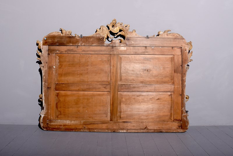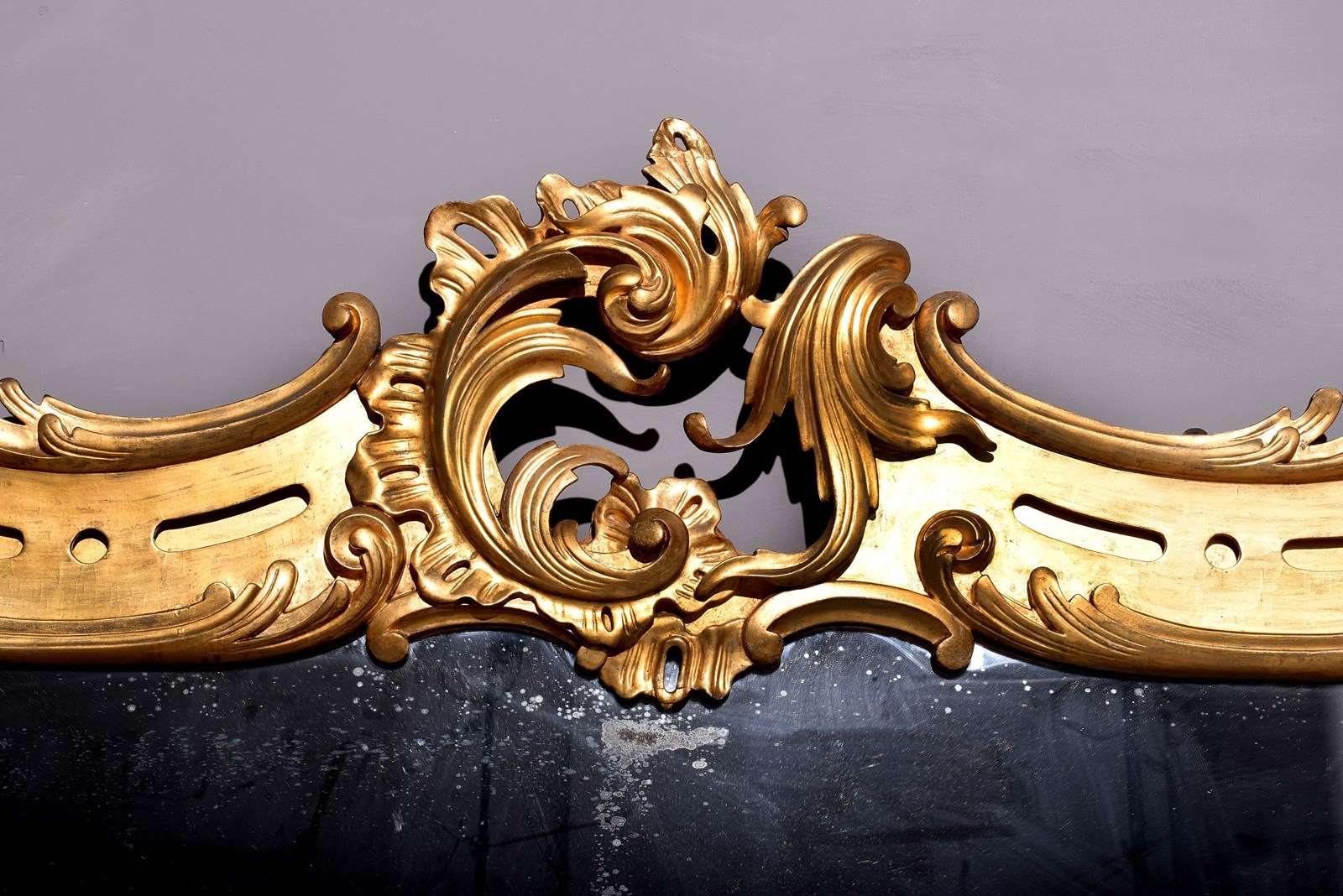 Circa 1830. A quality Willian IV carved and gilded wood over mantle mirror, the pierced scrolling top with foliate carving with extended C and S scrolls, with shaped sides with the original gilding, in excellent condition with the gold leaf overlaps visible, the base with a flat fore-edge with scrolling and carved sides similar to the top, retaining its original mirror with foxing towards the bottom right hand side