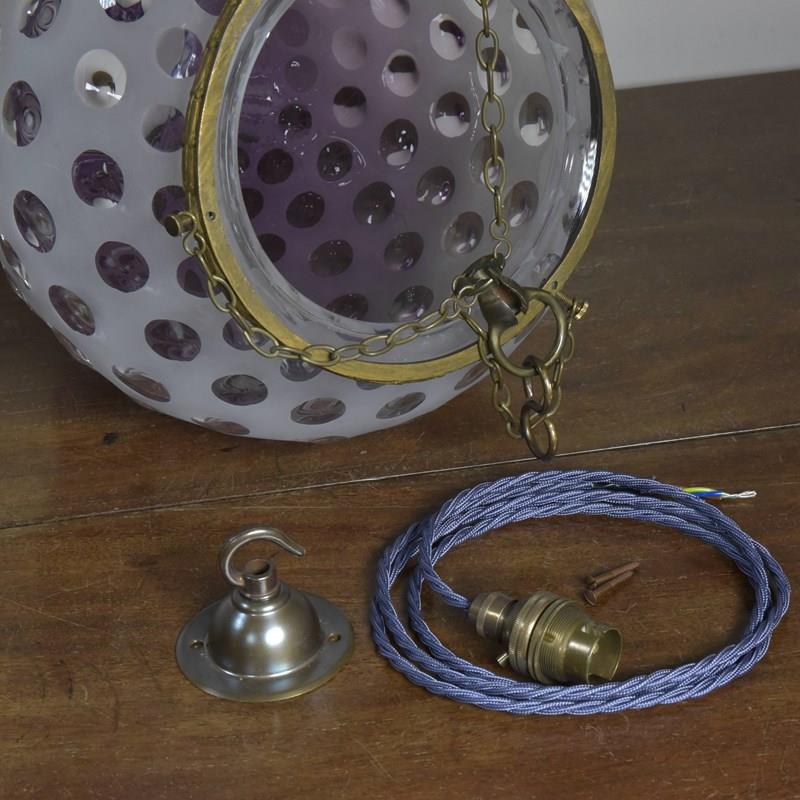 Wired with 1.5m fabric flex, patinated brass cordgrip / BC lampholder. Supplied with patinated brass hooked ceiling plate, earth and fixing screws.