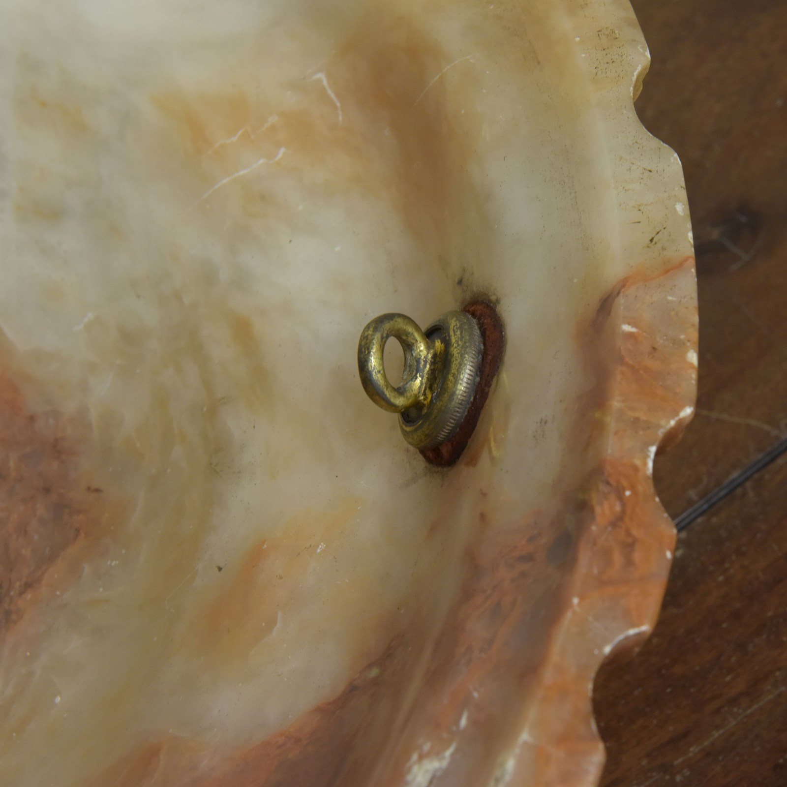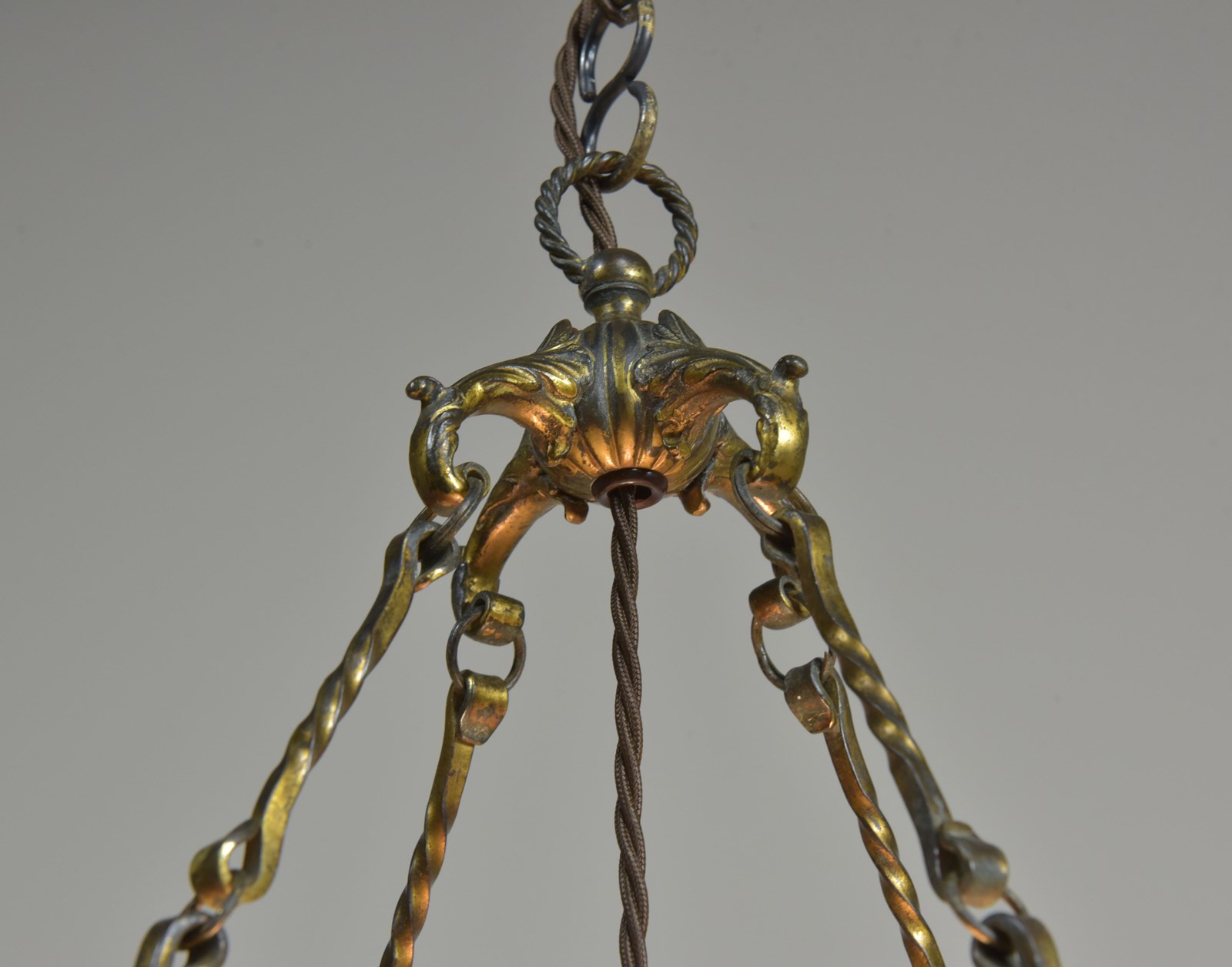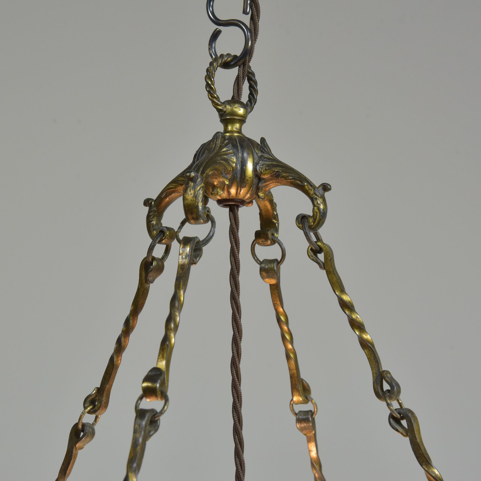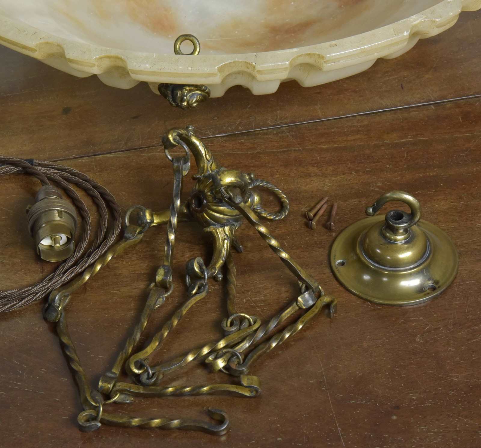 Wired with 1.5m fabric flex, patinated brass cordgrip / BC lampholder. Supplied with a good antique hooked ceiling plate and vintage patinated brass slotted screws. See image to show all parts supplied.