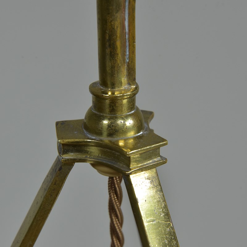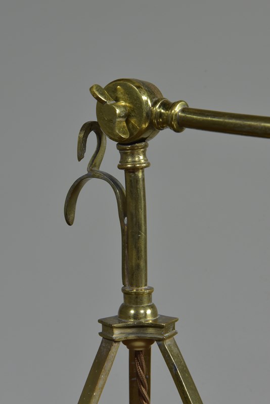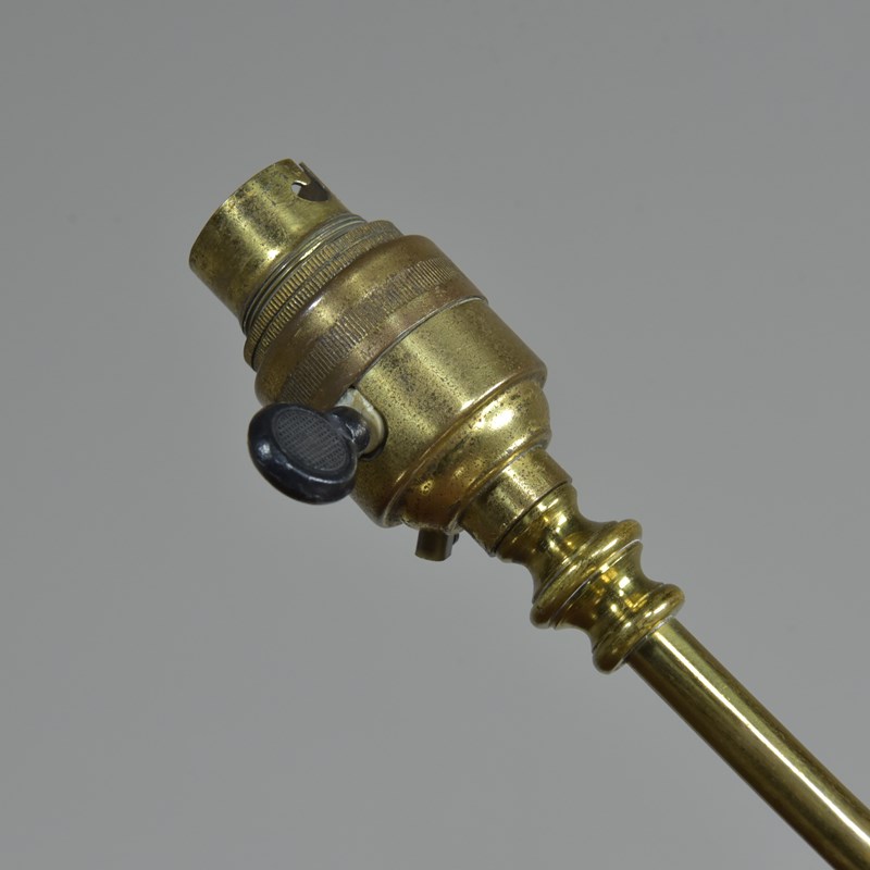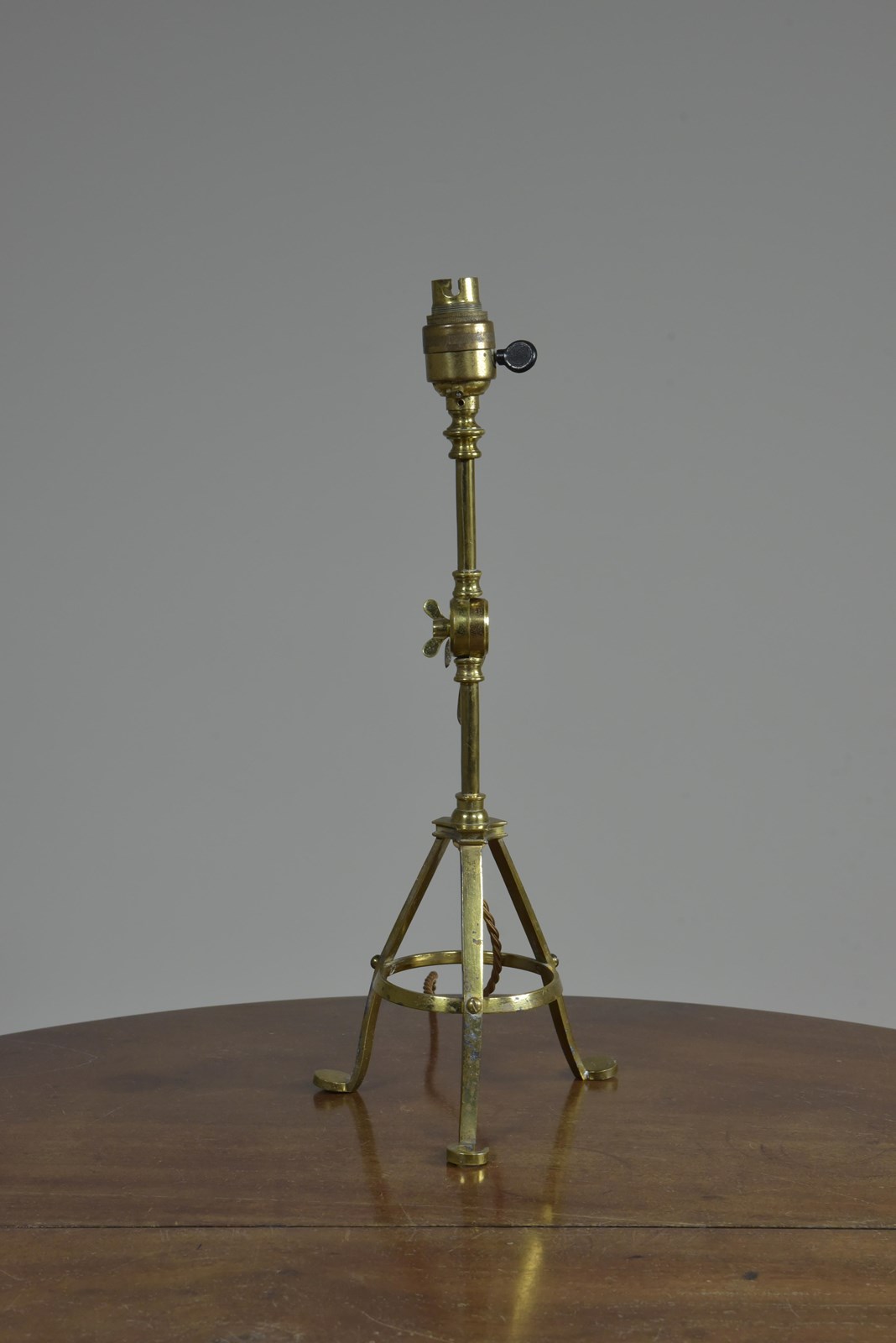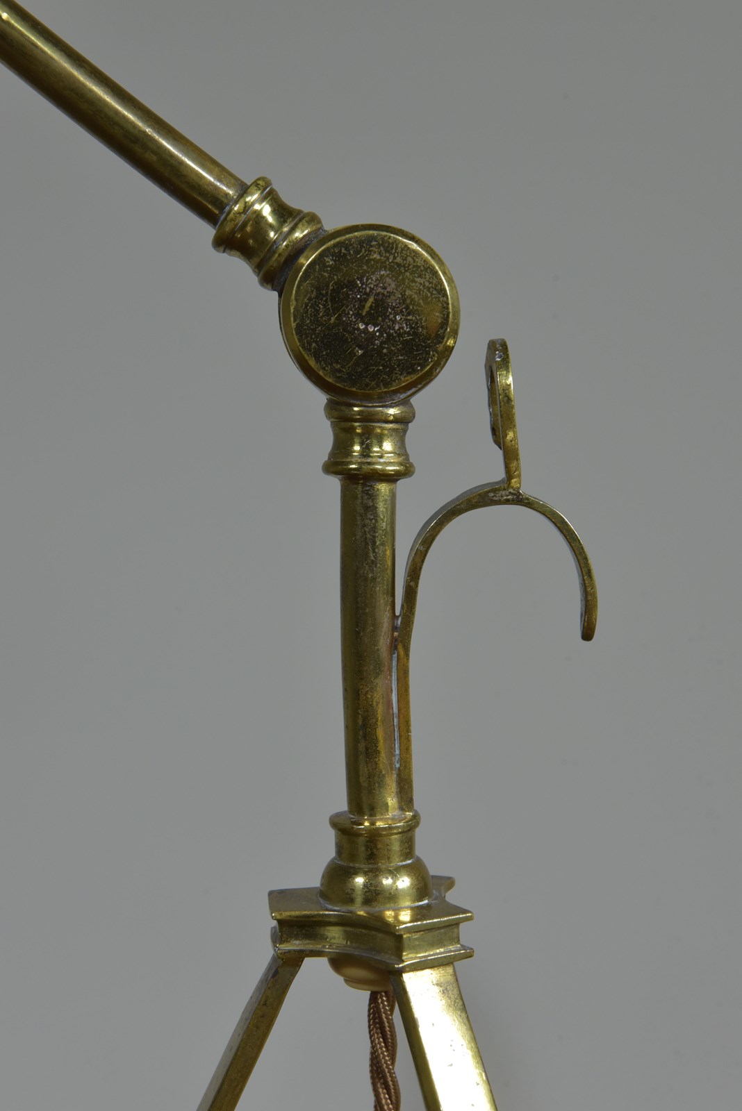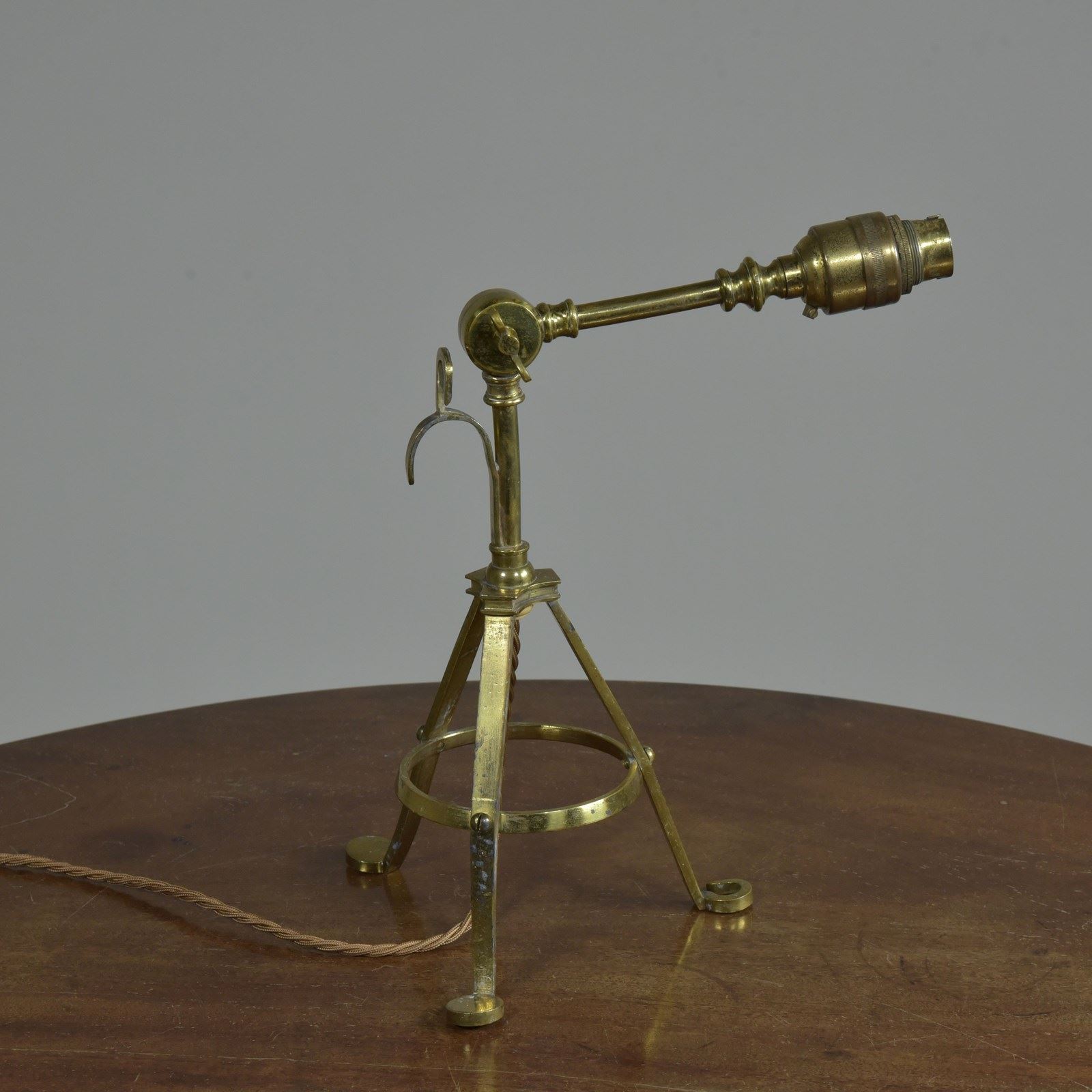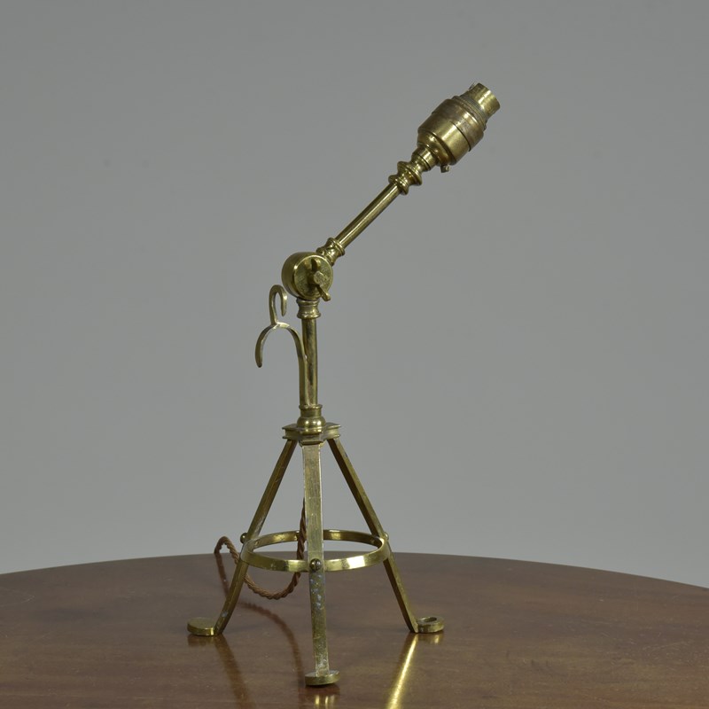 An antique gilt brass tripod / pullman table / wall lamp with articulated lampholder arm. English, early 20th century.