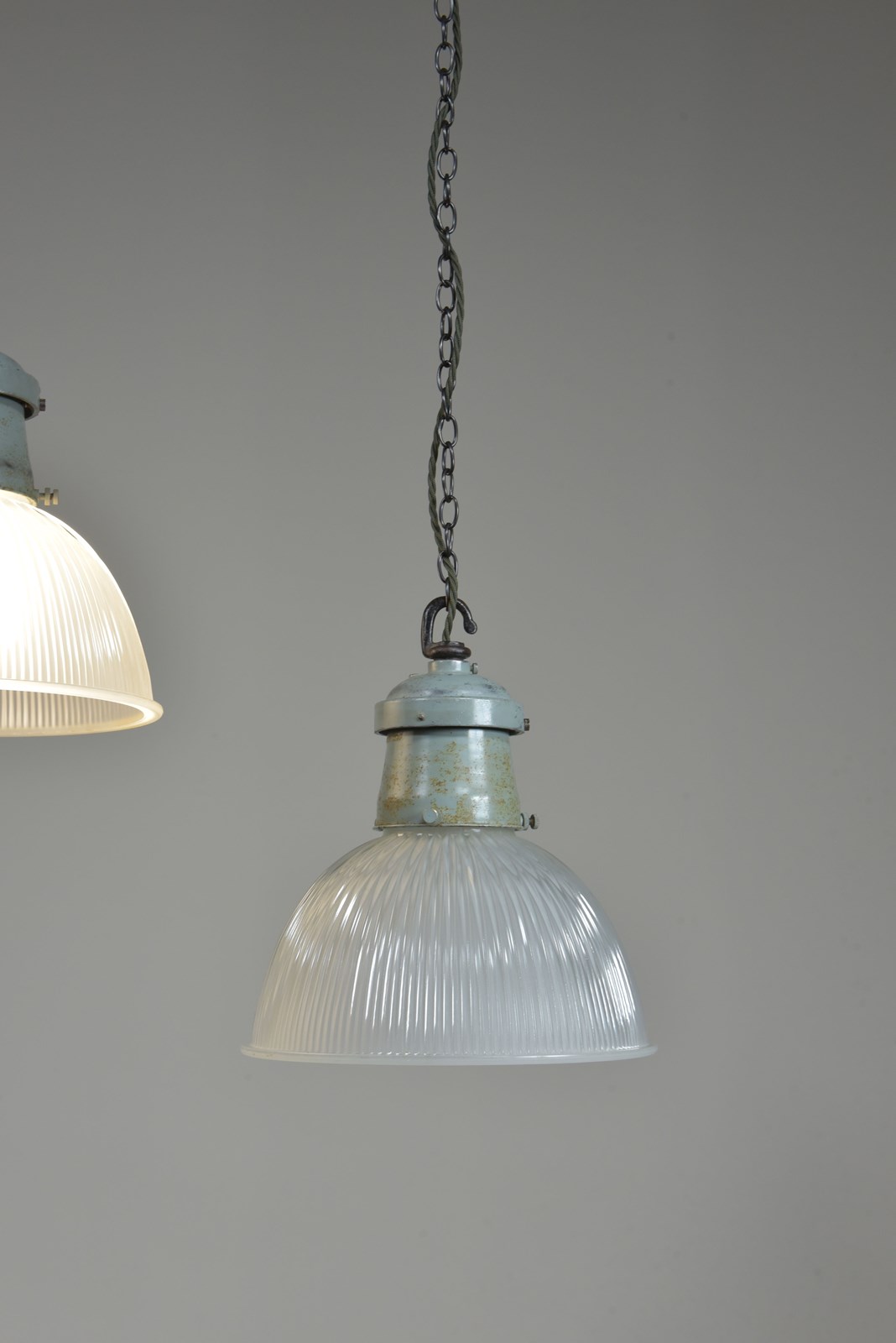 Rewired with 1.5m fabric flex, original porcelain ES lampholders (perfect condition). Each supplied with 1meter black jack chain (galvanised if preferred), original hooked ceiling plate (including vintage slotted roundhead black japanned screws).