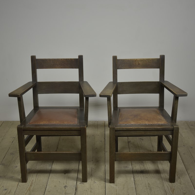 A pair of antique Mission style armchairs by R. J. Horner & Co., New York. c1900. Made of quality oak (mortice and tenon construction) in original stained finish with cushioned leather seats. In fine sturdy condition. Label to one of the chairs reads; " R.J.HORNER & CO., Furniture Makers AND IMPORTERS, 61, 63, & 65 West 23rd St., New York."