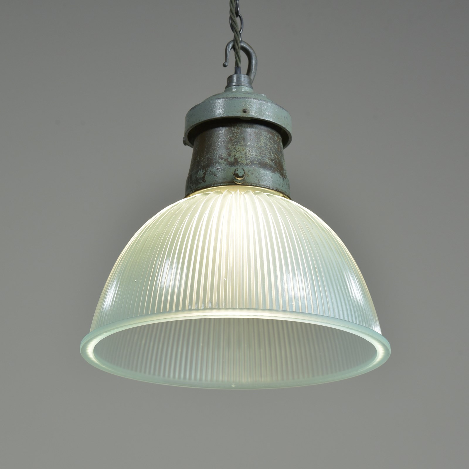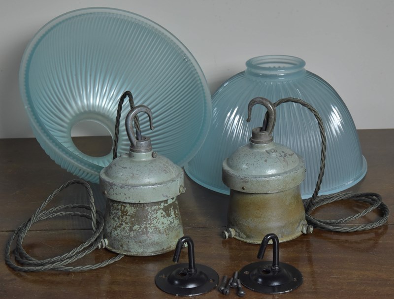 A pair of Holophane prismatic glass shade lights with their original cast aluminium / spun steel galleries and hook. English approx 1930s.