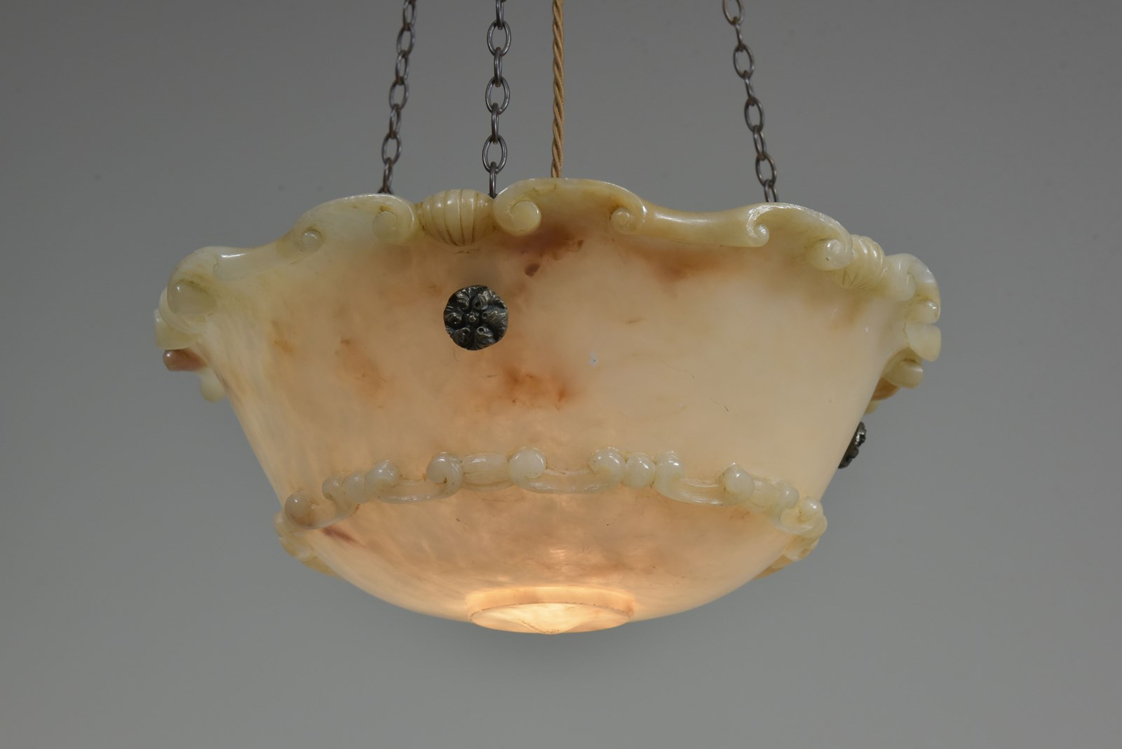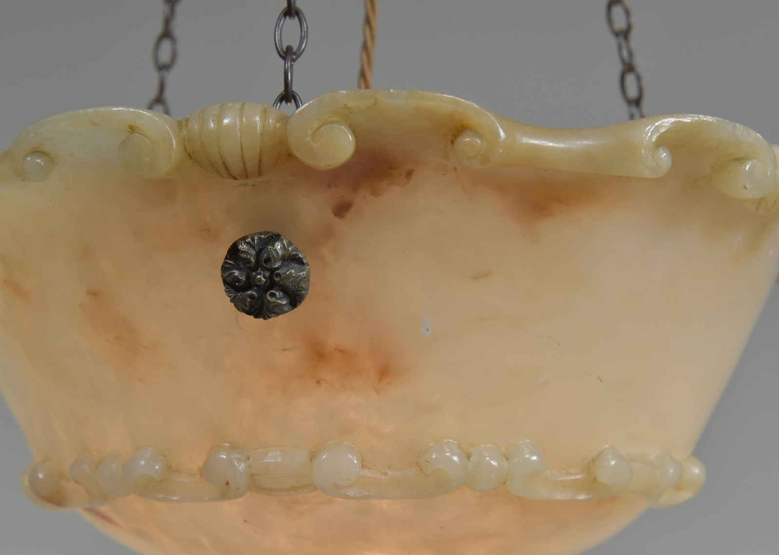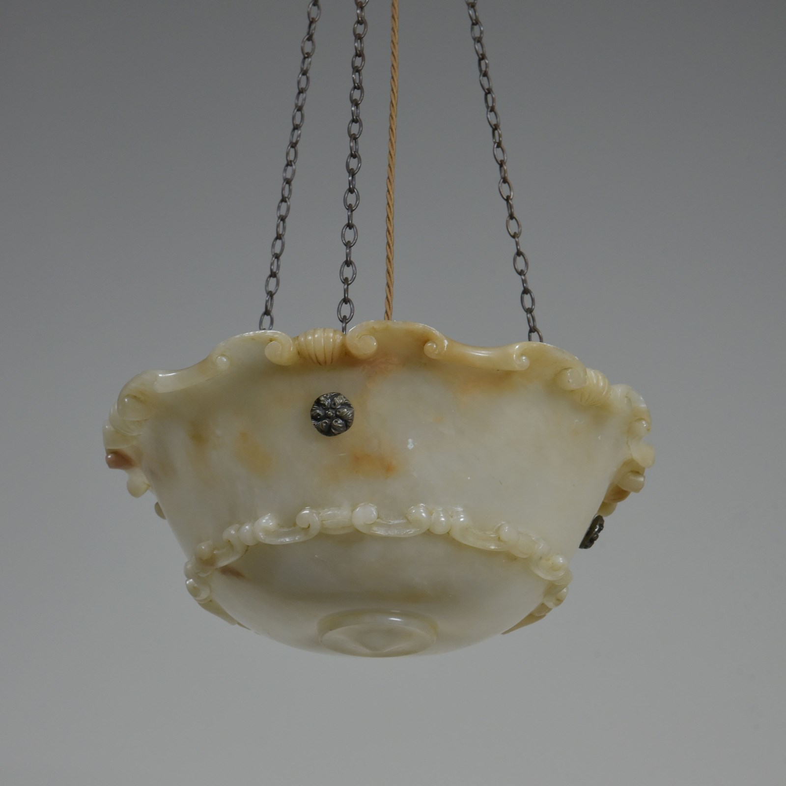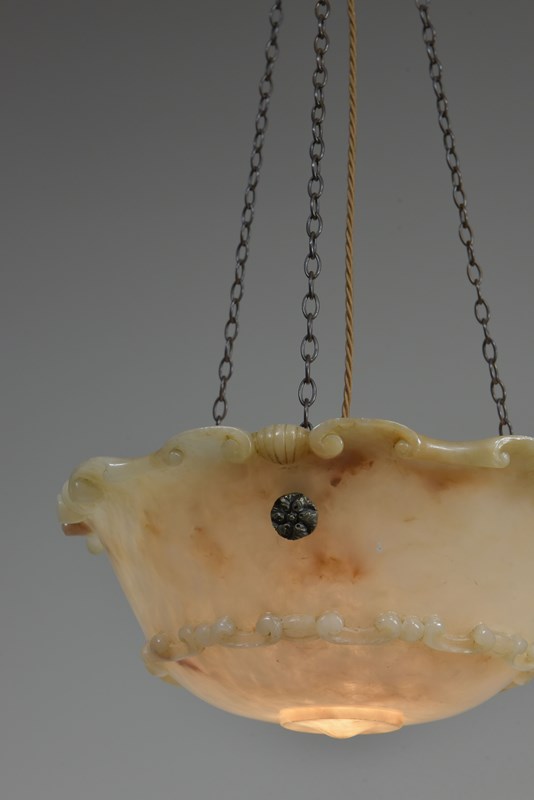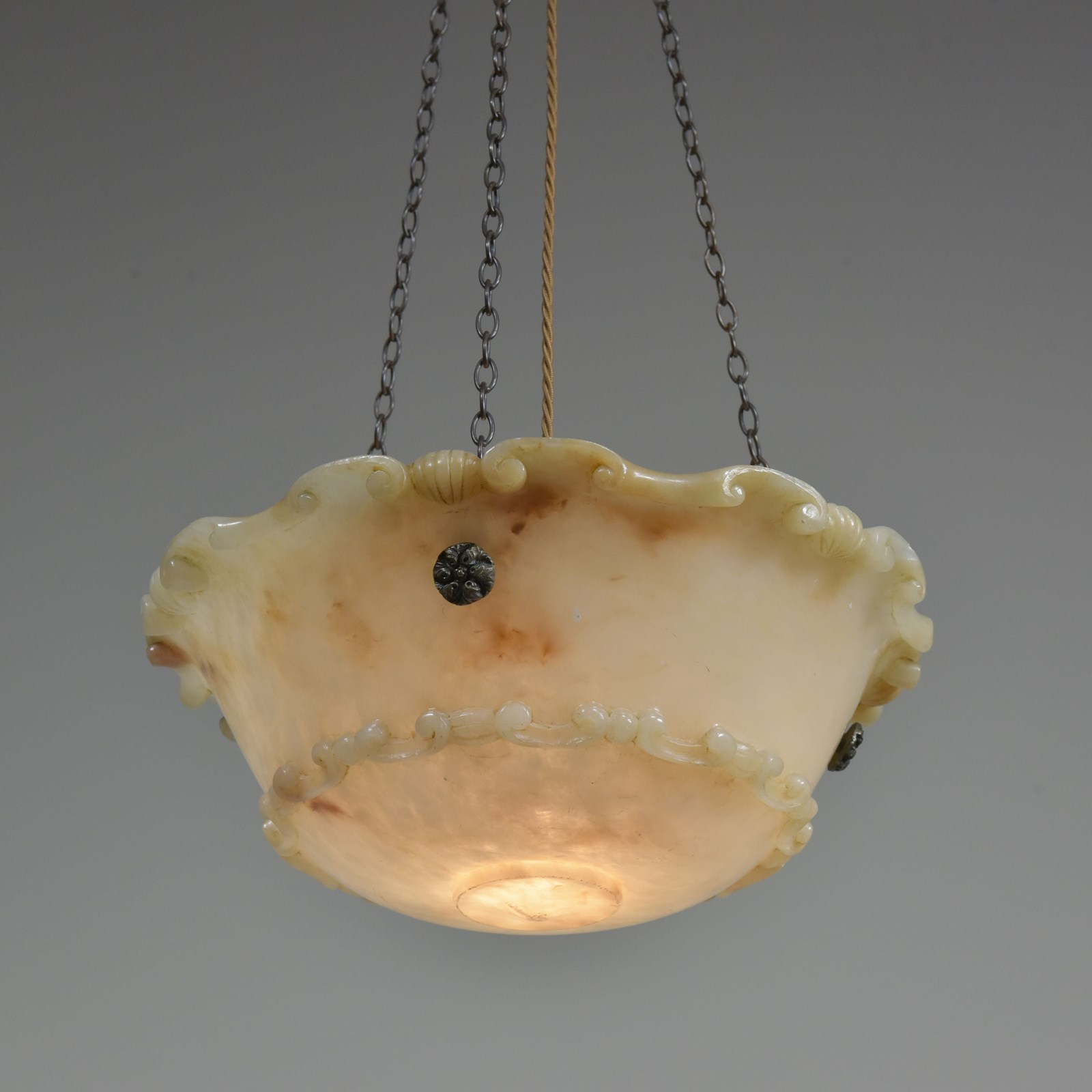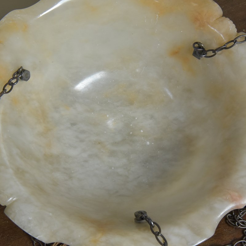 An antique alabaster bowl plafonnier with c scroll and shell decorative rim and band, floral rosette mounts and original quality brass chain. Excellent condition, lovely colour. English, early 20th century to 1920.