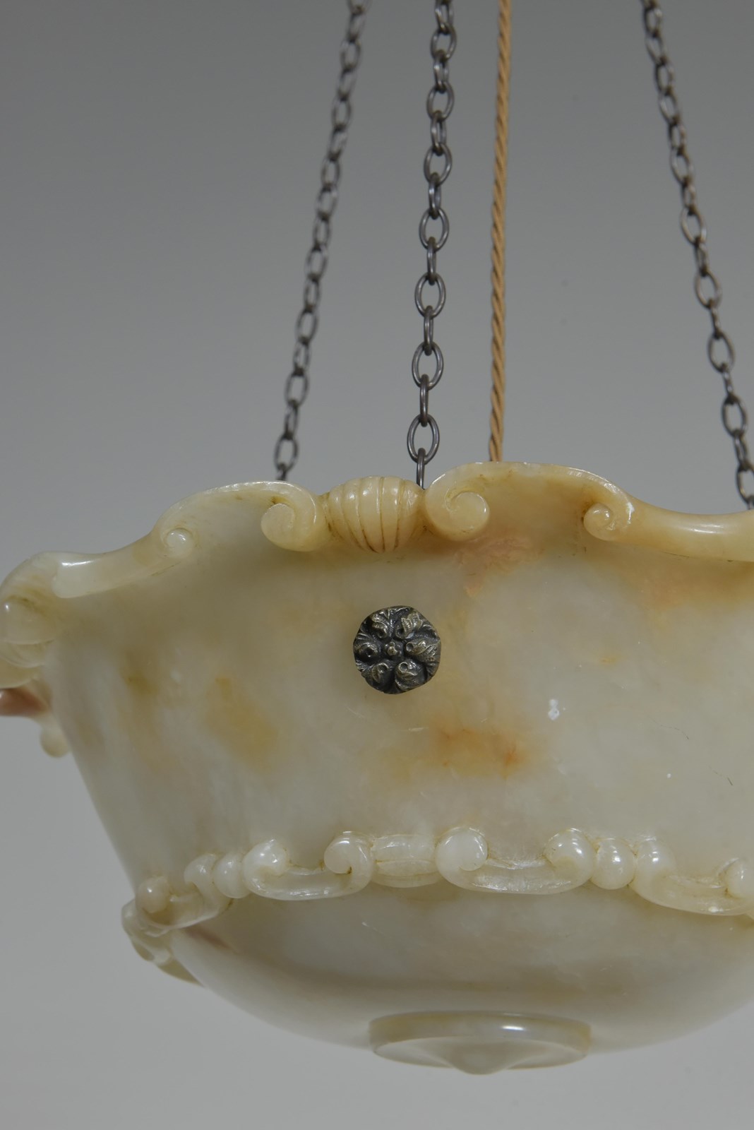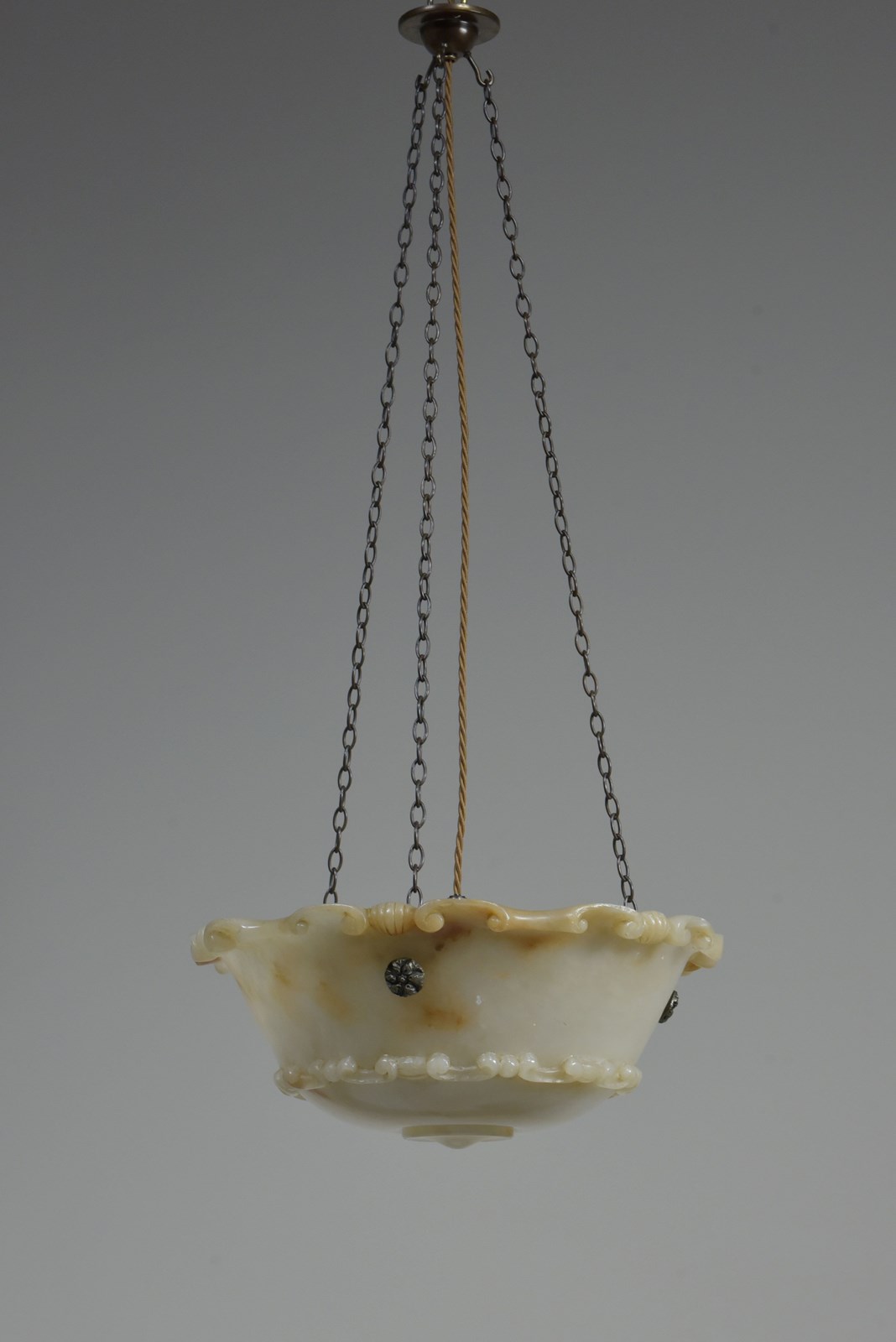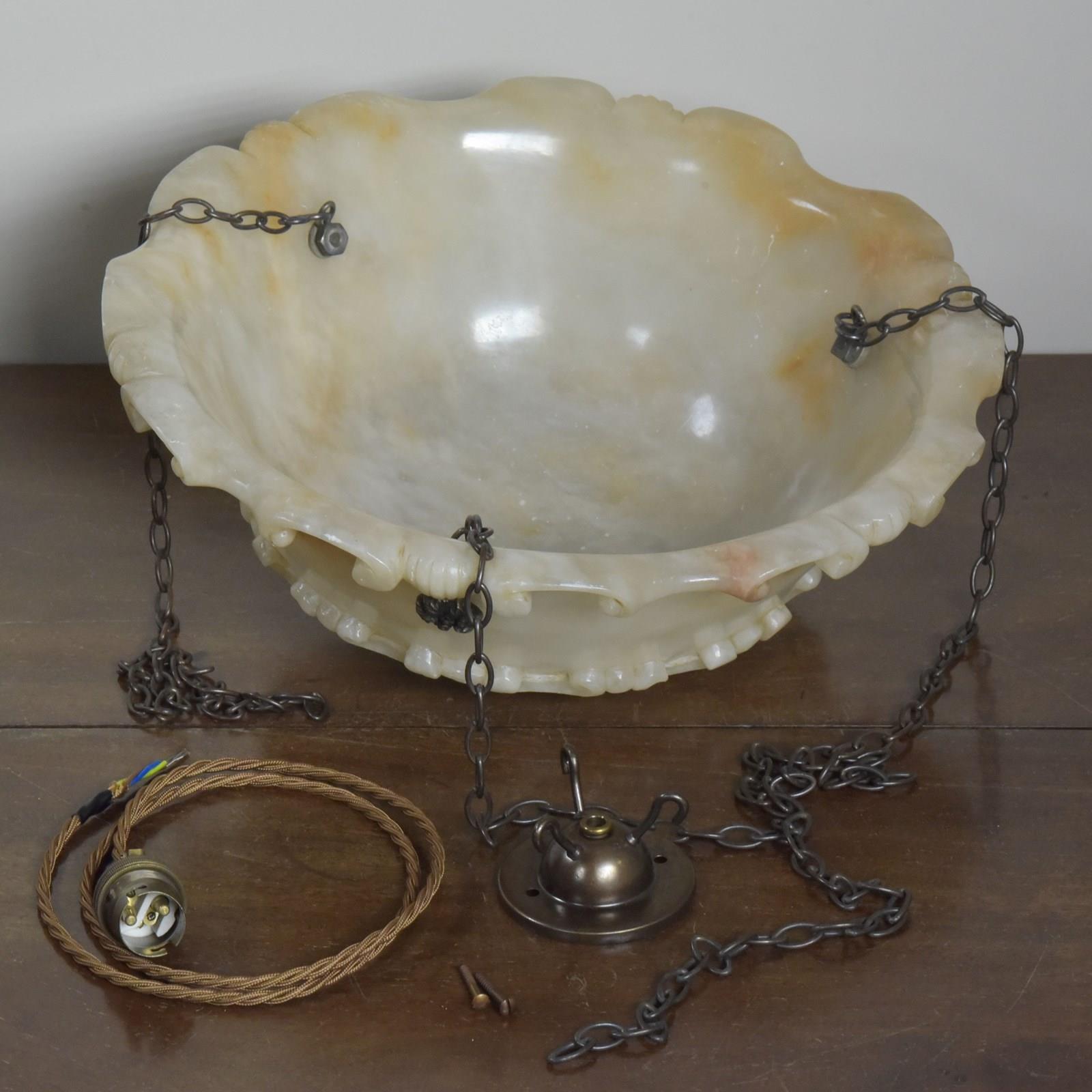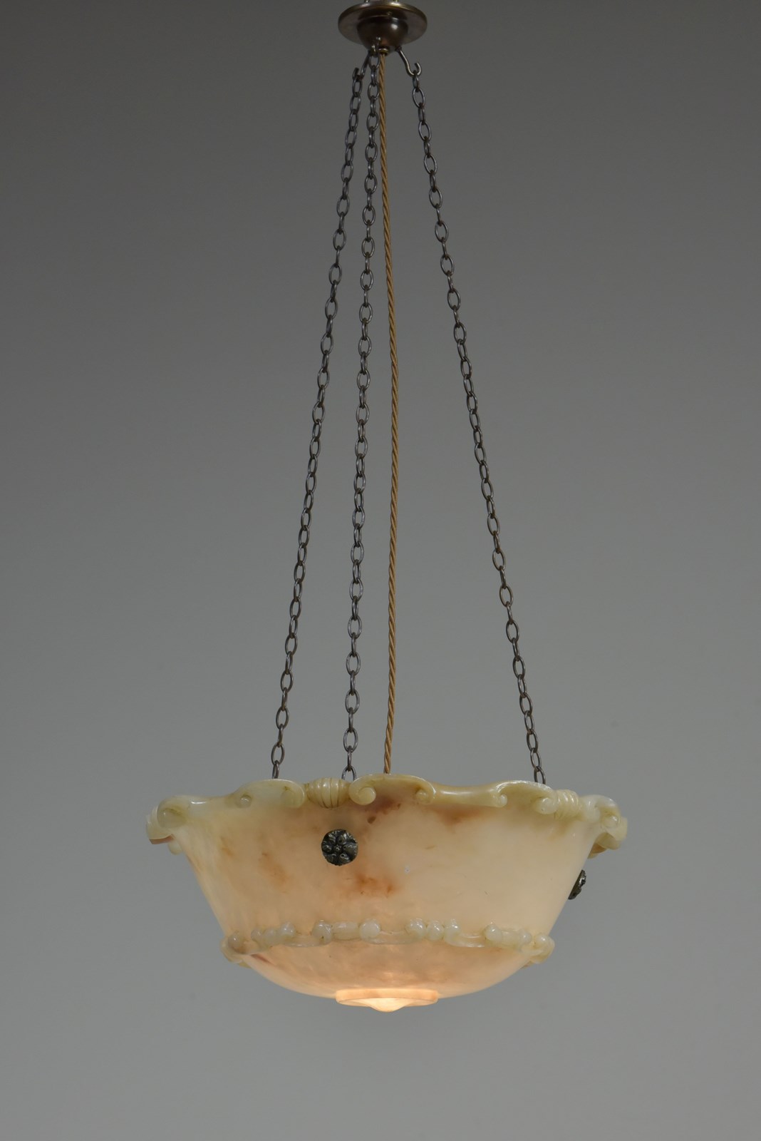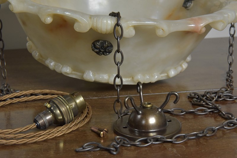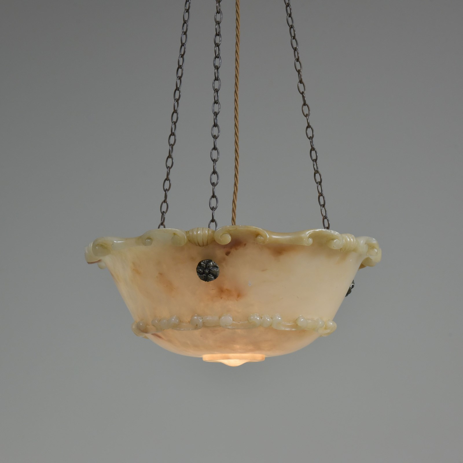 An antique alabaster bowl plafonnier with c scroll and shell decorative rim and band, floral rosette mounts and original quality brass chain. Excellent condition, lovely colour. English, early 20th century to 1920.