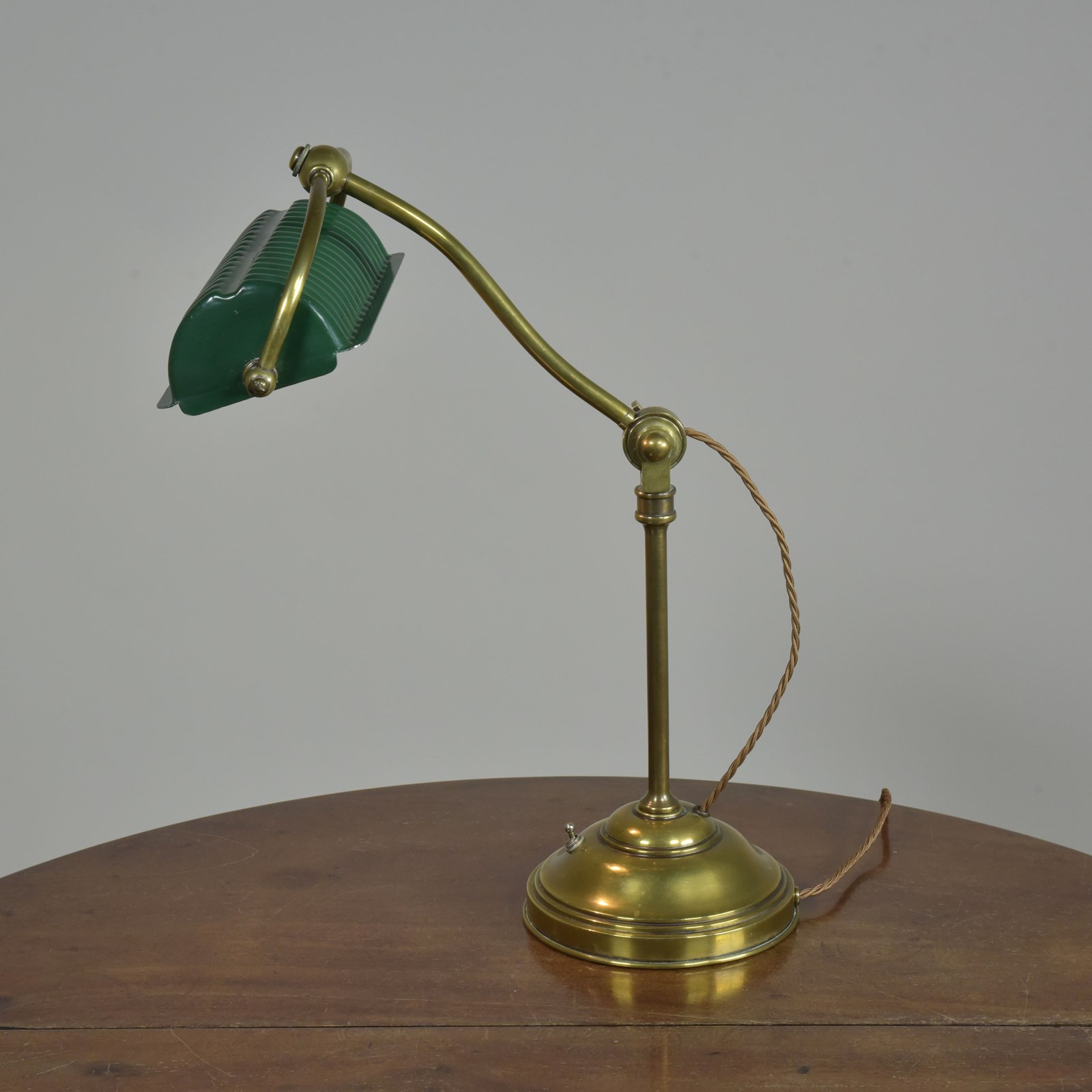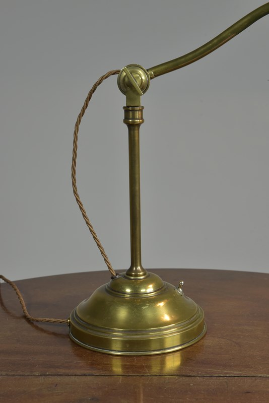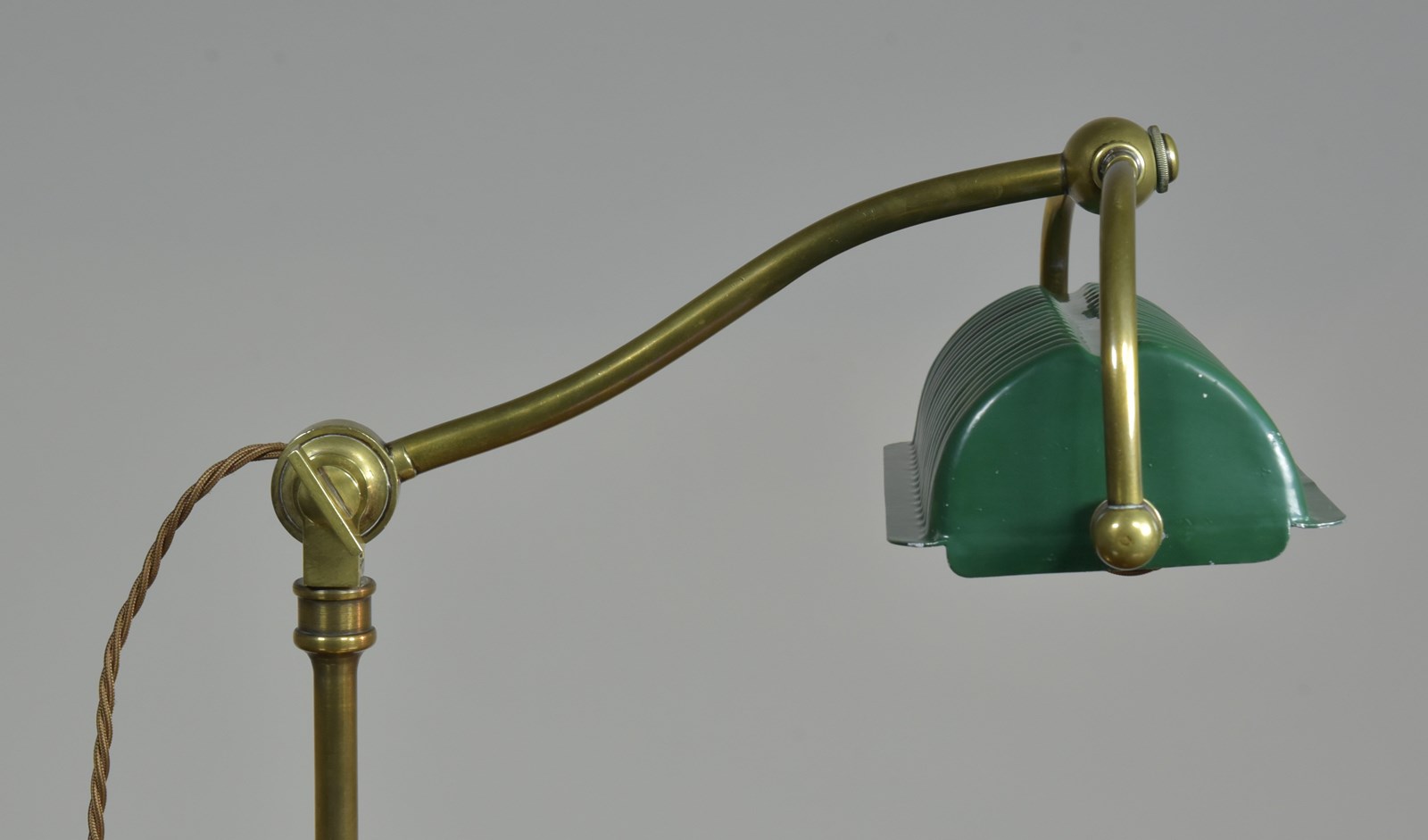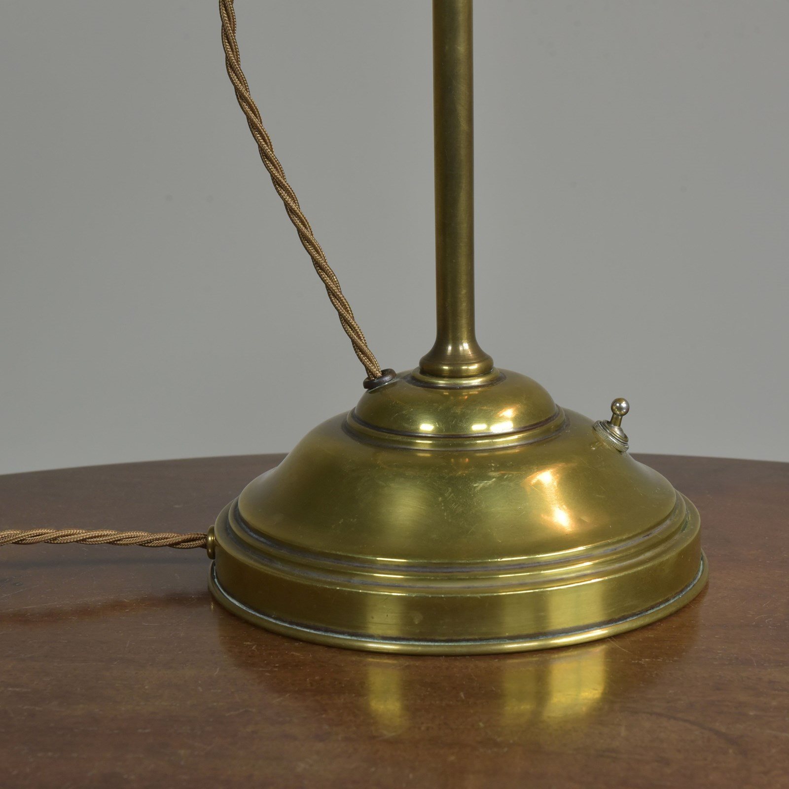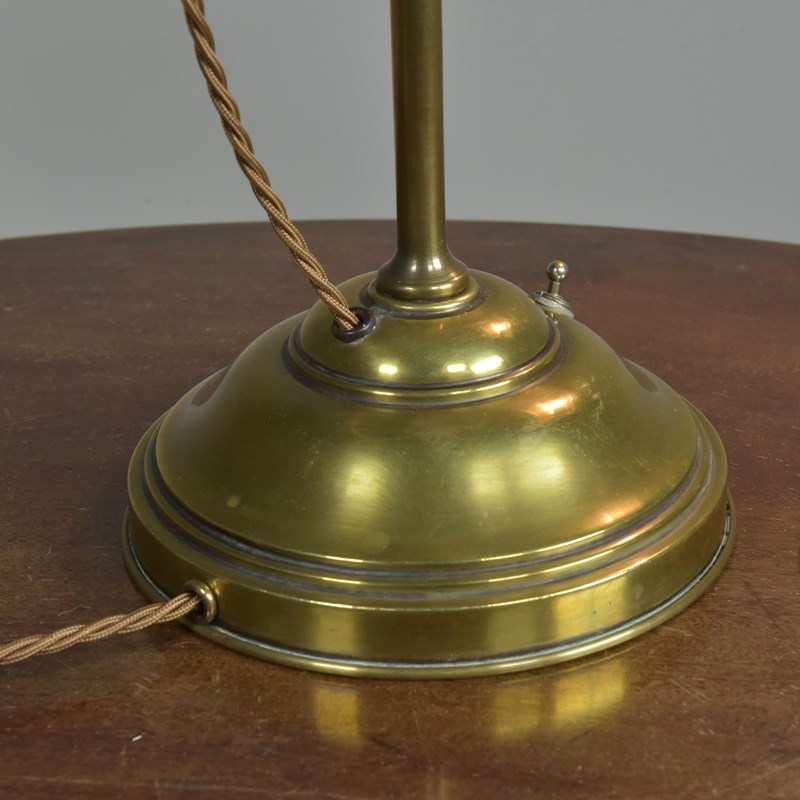 Taken apart, shade cleaned and polished, weighted cast iron base part cleaned and waxed, new patinated brass guide, original switch used.