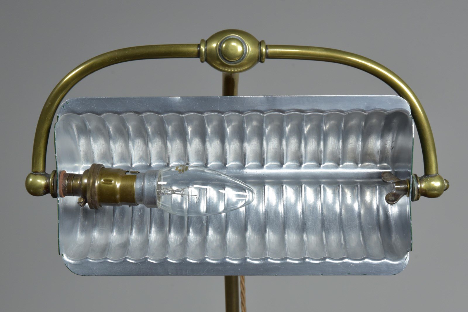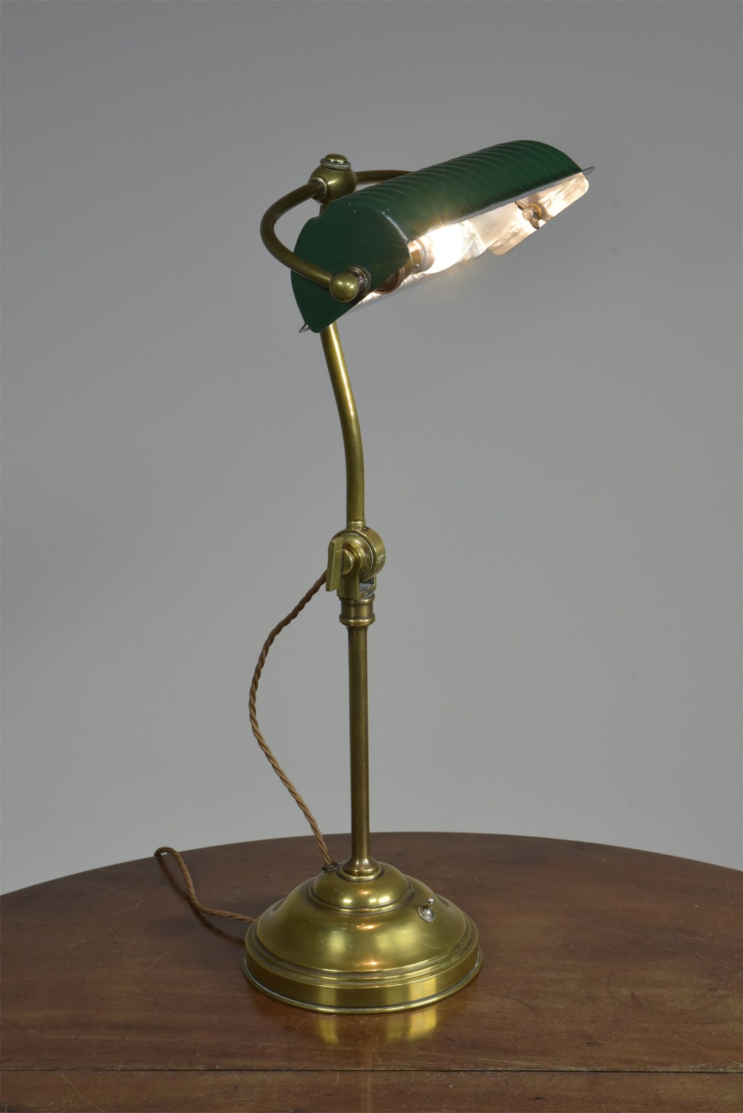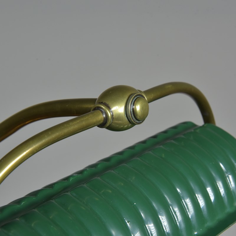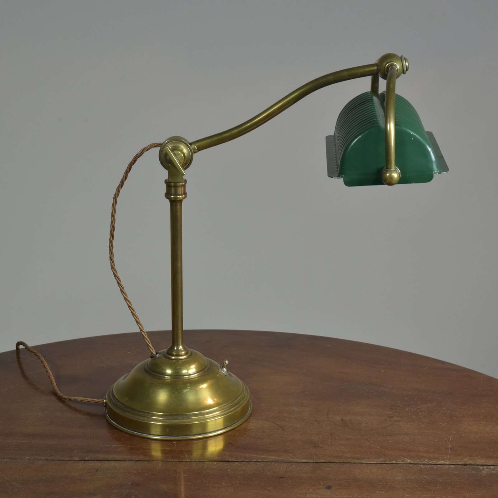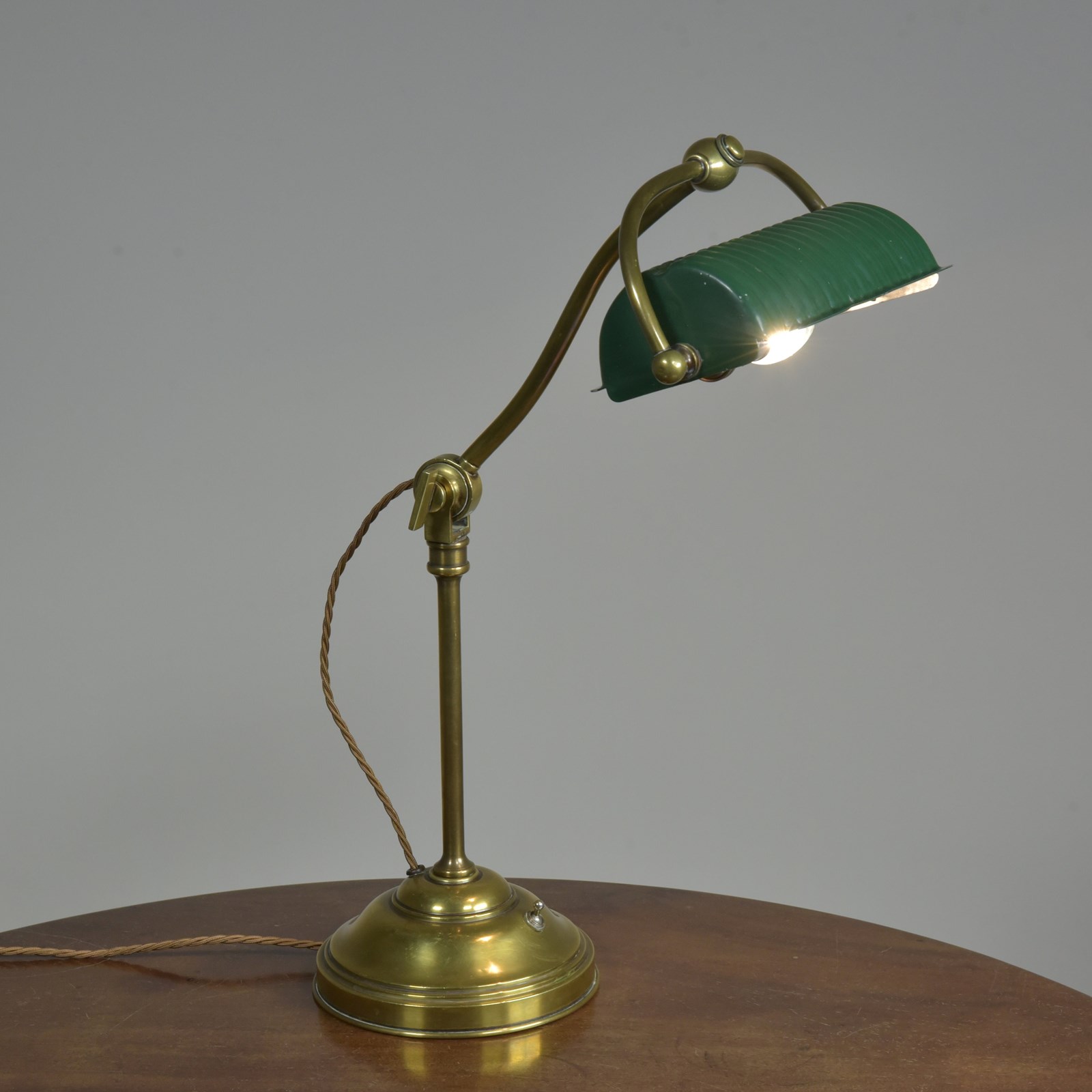 Taken apart, shade cleaned and polished, weighted cast iron base part cleaned and waxed, new patinated brass guide, original switch used.