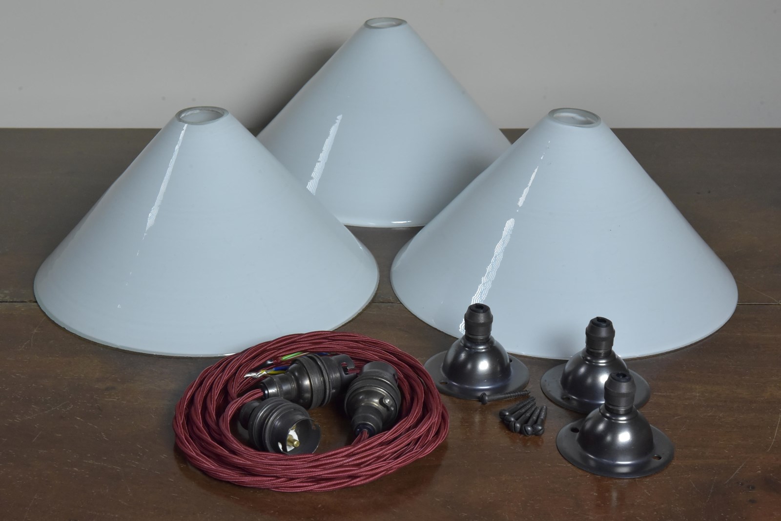 Each wired with 1.5m bergundy fabric flex / bronzed brass cordgrip lampholders. Come with bronzed brass cordgrip/ceiling plates (with earths and supplied with vintage slotted screws)