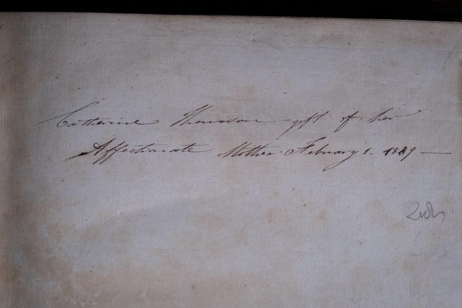 Ink inscription to front flyleaf which reads, 'Catherine Thompson - gift of her Affectionate Mother February 1 1839'. Frontispiece and title pages present to both volumes. Some spotting the preliminary pages but largely clear thereafter.