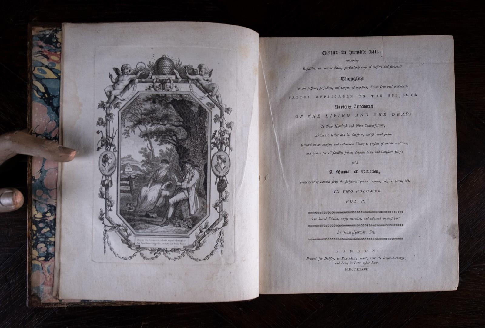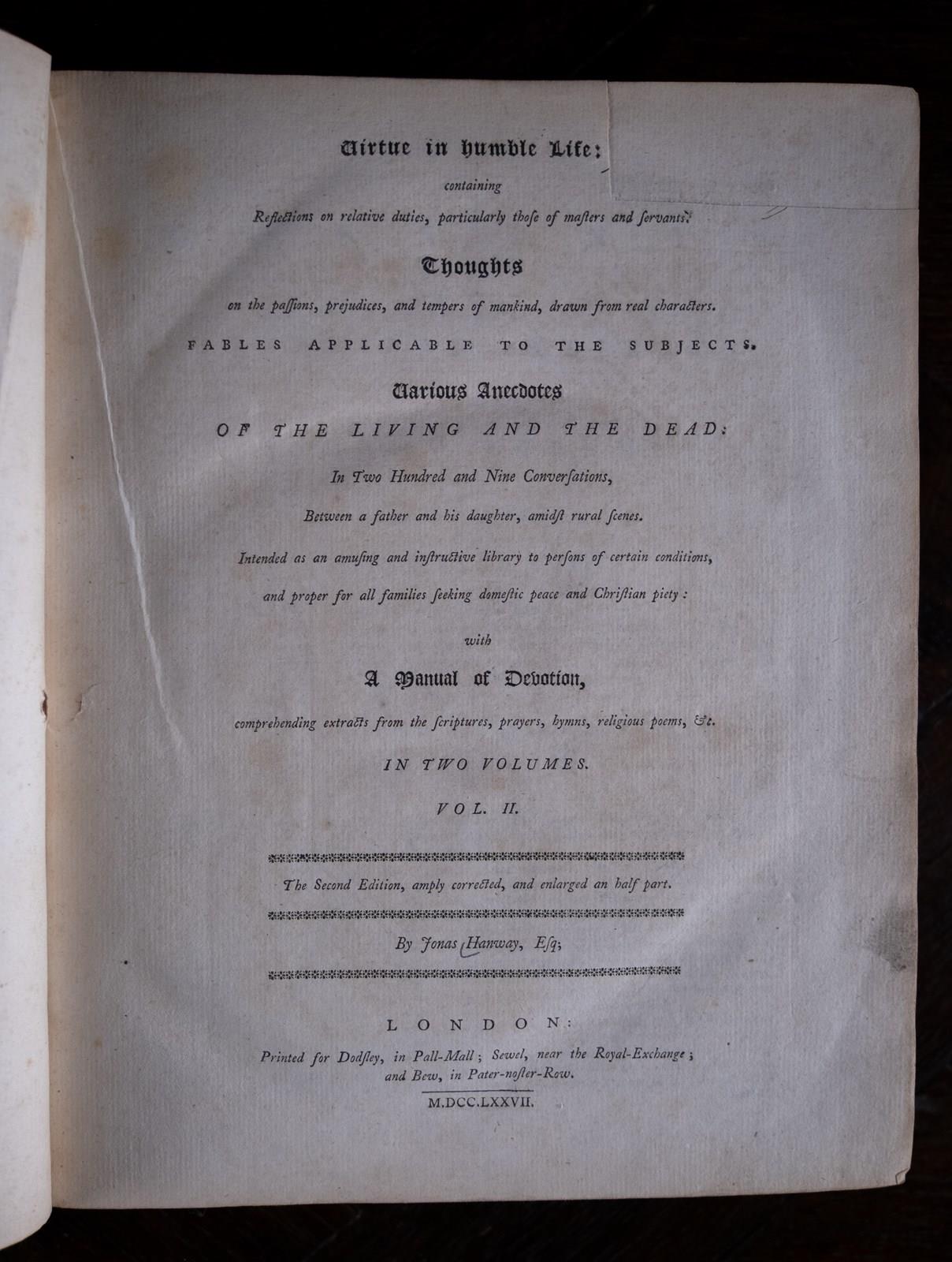 'Virtue In Humble Life' by Jonas Hanway, printed for Dodsley, Pall Mall, London in 1777. (Robert Dodsley ran a bookshop at number 52 Pall Mall and it was he who suggested to Dr Samuel Johnson the idea of writing what would become the first modern English language dictionary). Complete in two volumes.