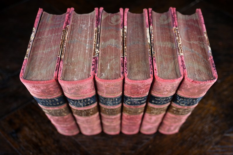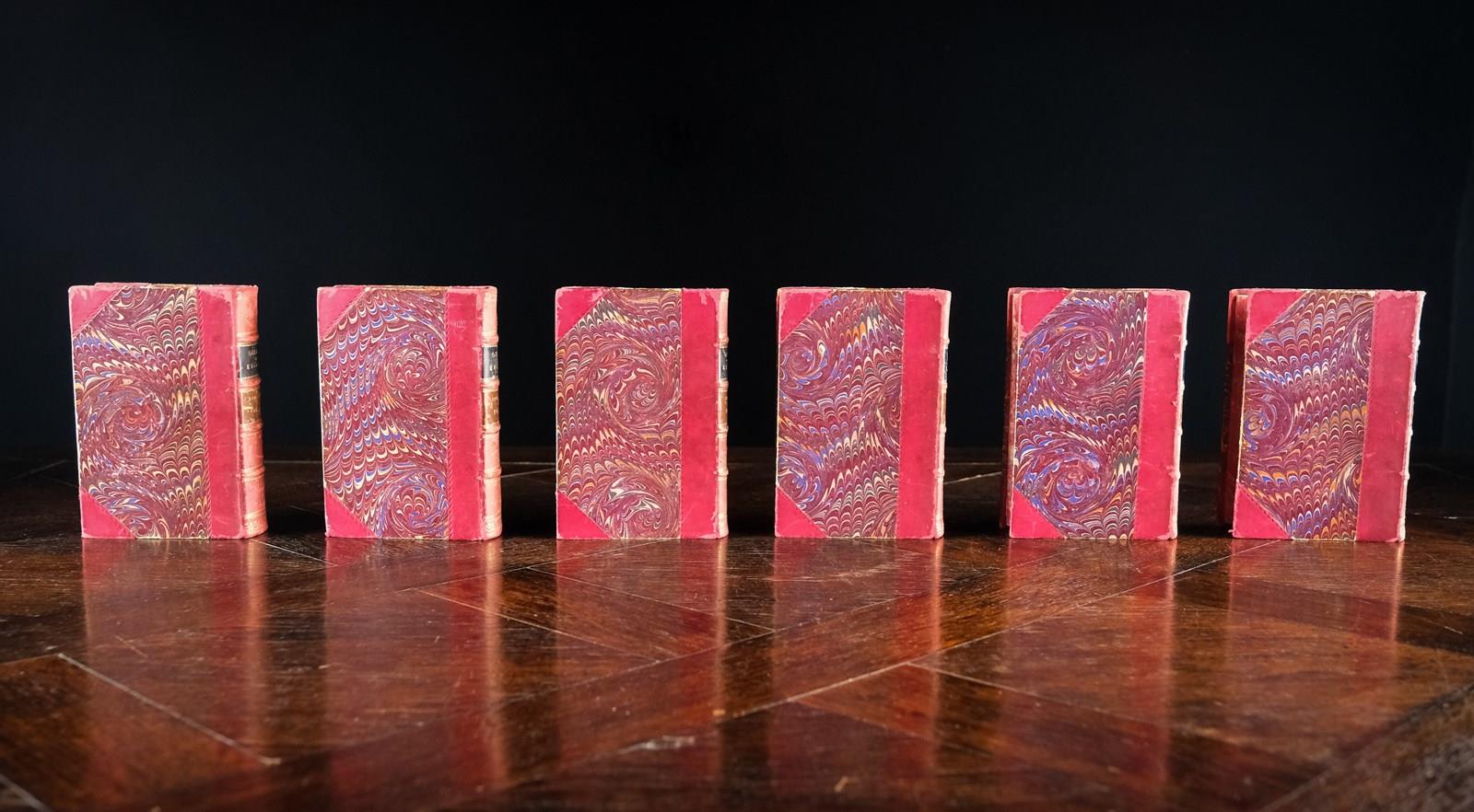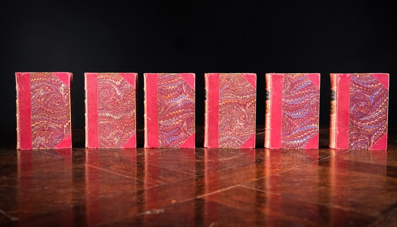 Each volume is three-quarter bound in Moroccon red leather with five raised bands, black leather title panels and brown leather volume panels to the spine. Signs of shelf wear throughout. Bindings remain tight.