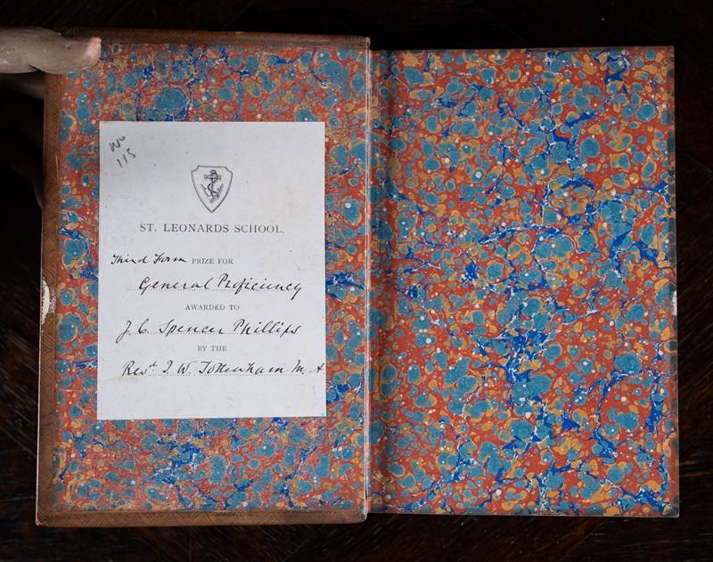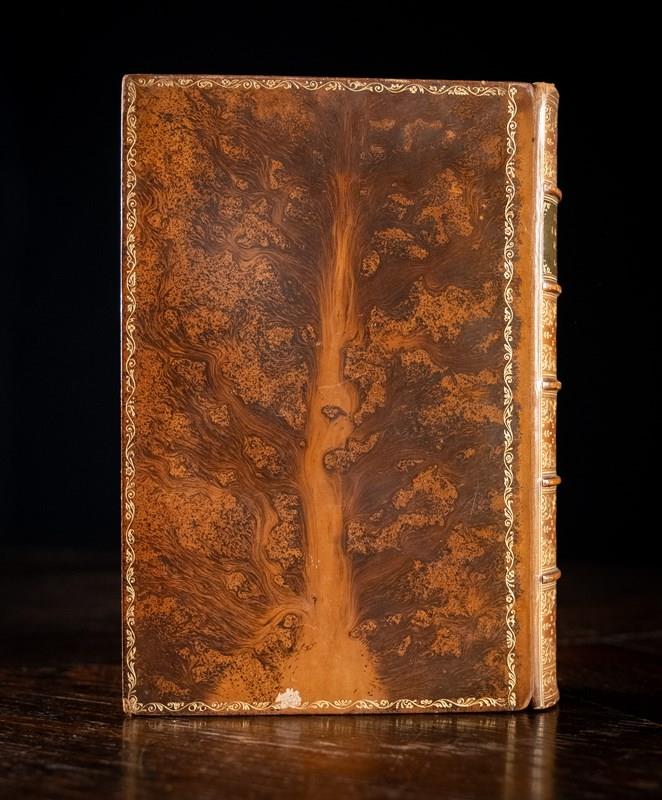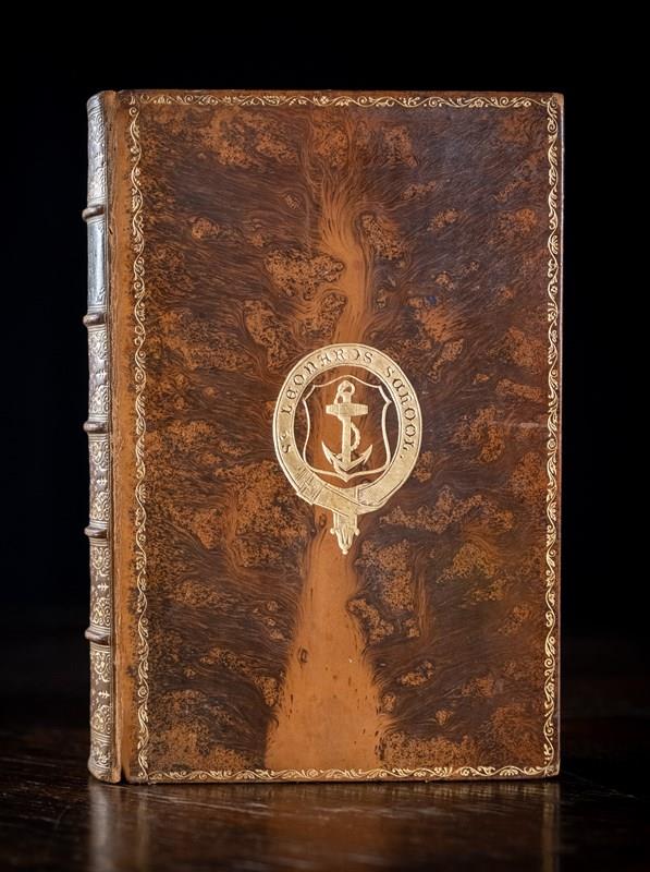 Full tree calf binding by Bickers & Son, Leicester Square London. St Leonard's School crest gilt stamped to the front board (the similarities in design of the crest to the ones of Celtic origin indicate this is St Leonard's School of Fife, Scotland rather than Exeter, Devon). Five raised bands and green leather gilt stamped title panel to the spine. Light shelf wear commensurate with age in areas. Small nick to the bottom of the back board. Generally the whole volume remains in a good attractive condition externally.