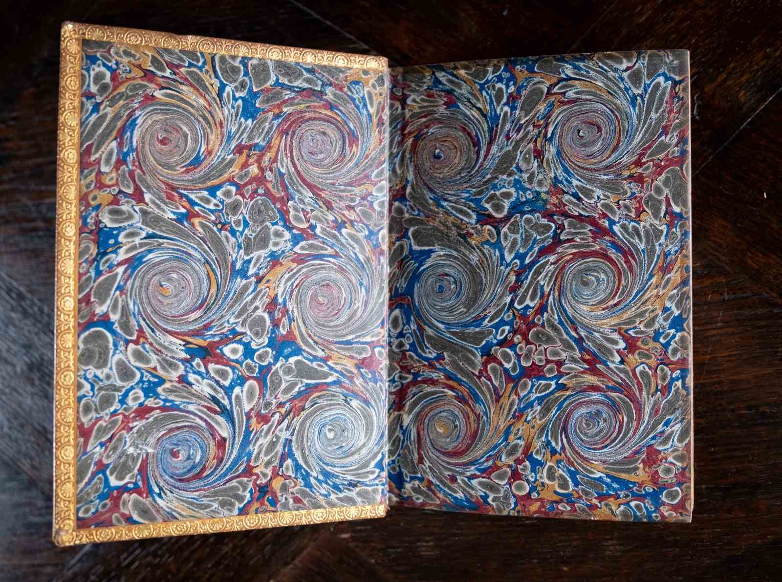 Marbled page edges. Marbled pastedown. Small pencil inscriptions to the front endpapers. All other pages remain in an excellent condition; clean, bright and free from inscription.