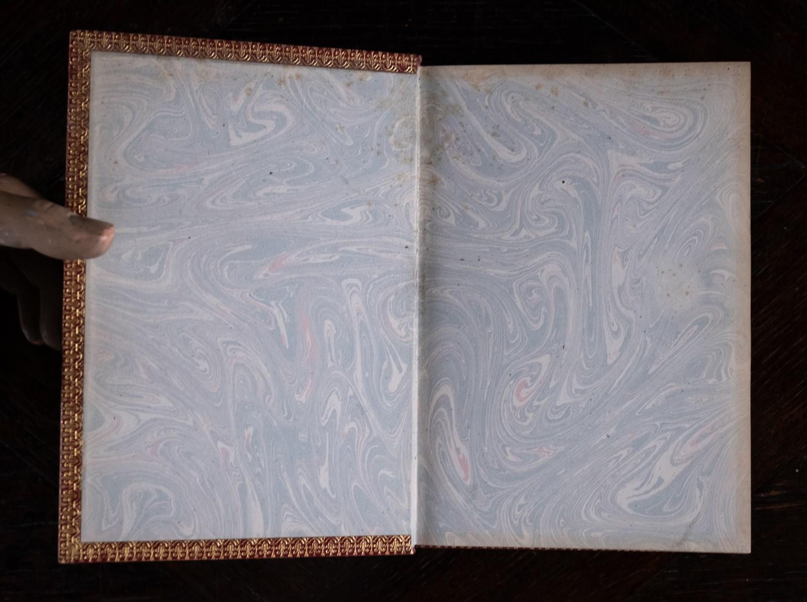 The volume is handsomely bound in a fine red Moroccon leather with gilt stamped title to the front board and spine. There is some light shelf wear, more notably to the back board, but generally the volume remains very attractive.