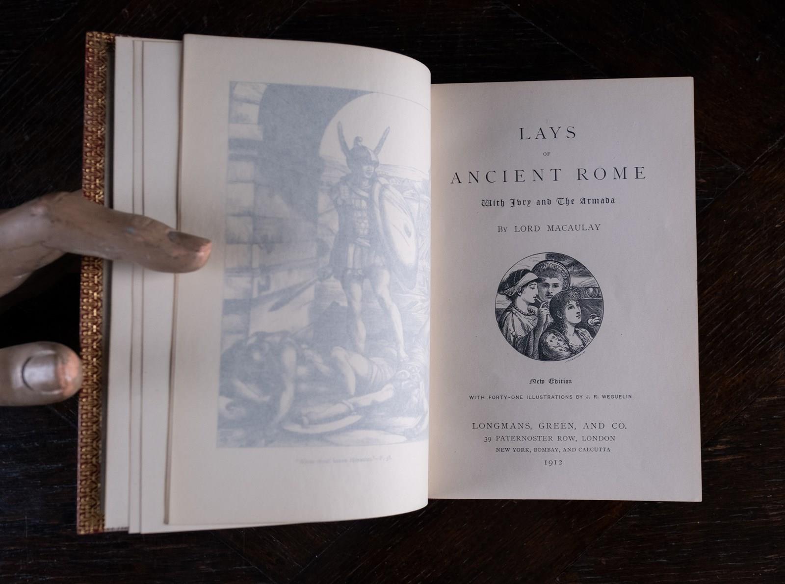 'Lays Of Ancient Rome' by Lord Macaulay, new edition with 'forty-one illustrations by J. R. Weguelin', published by Longman, Green & Co, 1912.