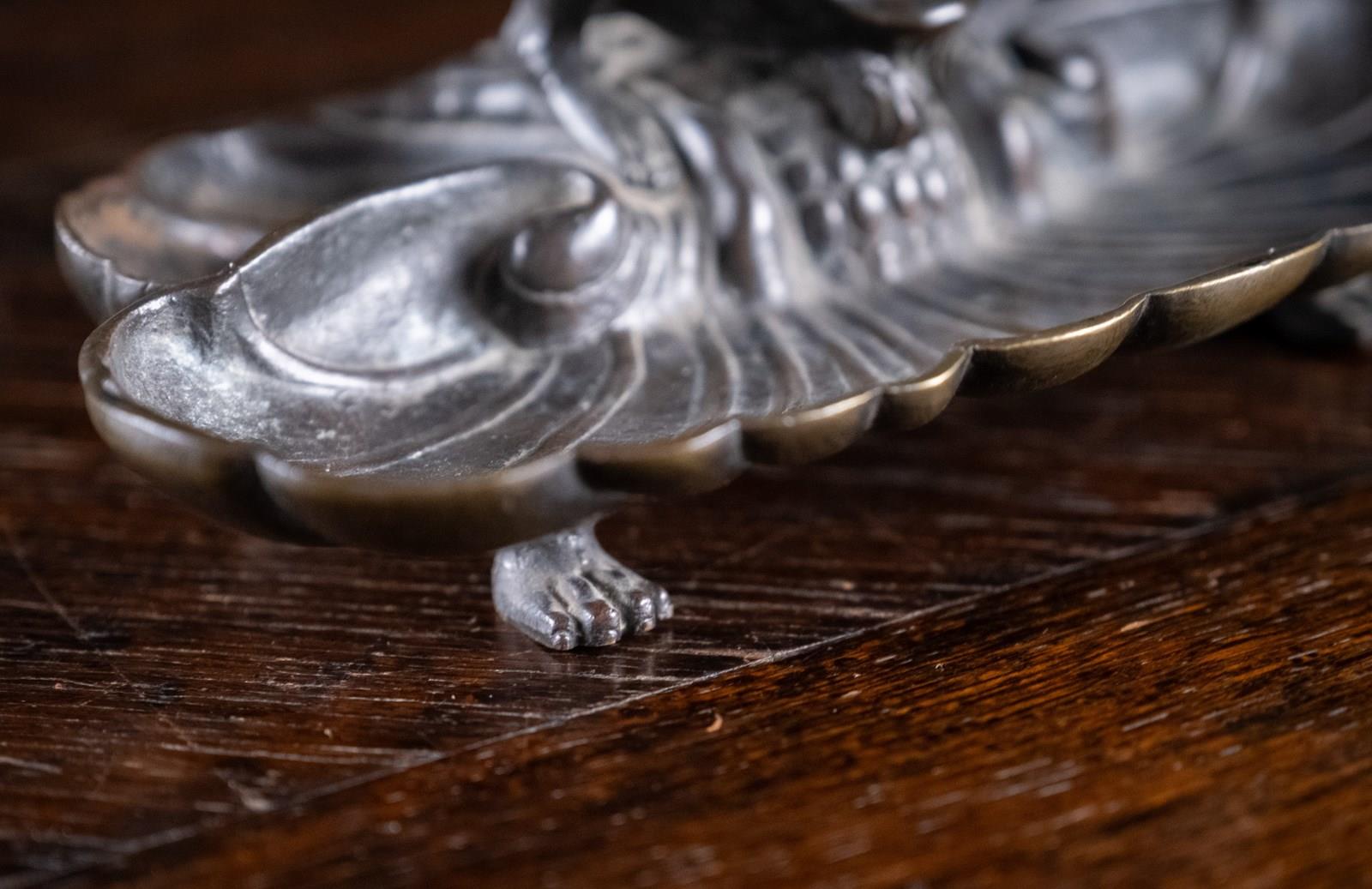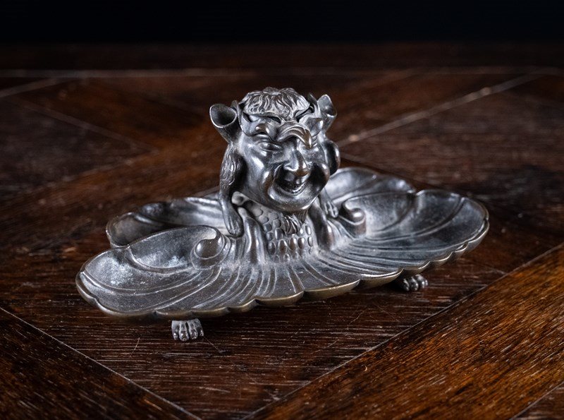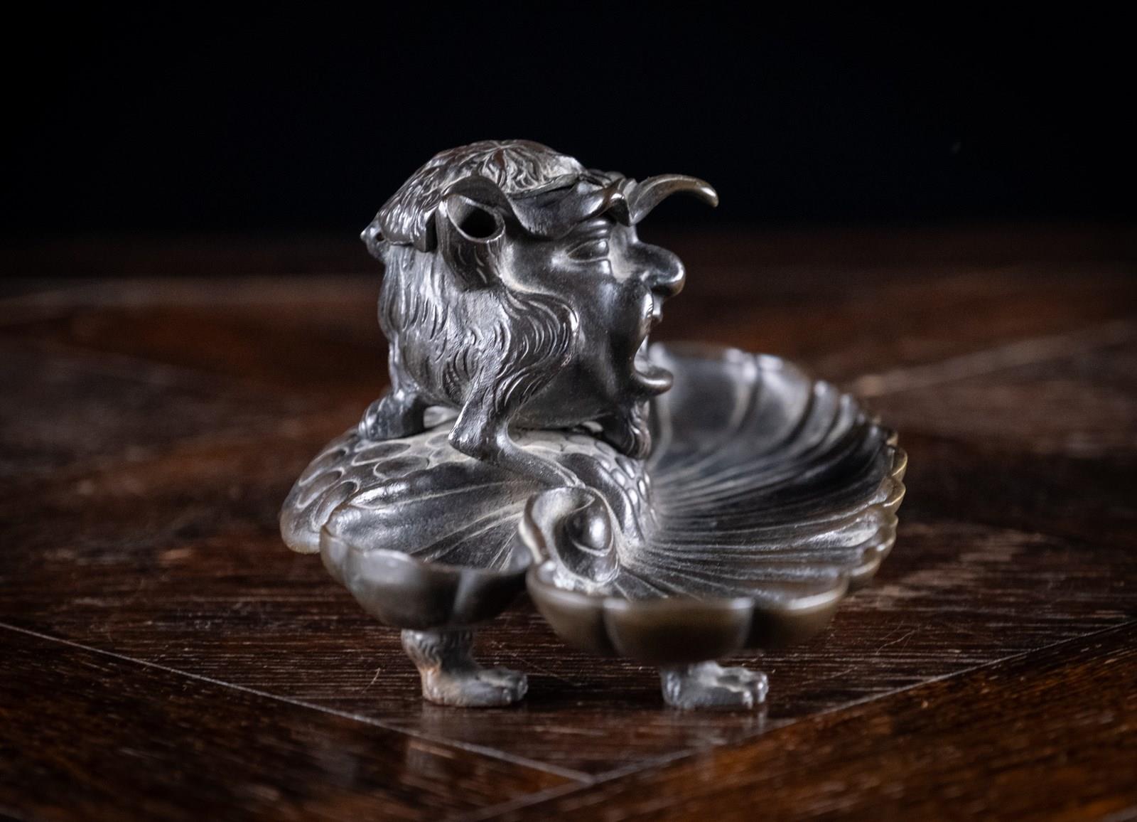 The devil is perched upon the back the bronze pen rest, with its hollow ears functioning as pen holders. The devil is concealed from above by a bird mask lid which reveals the devil beneath when lifted. Although the devil will be apparent to whomever opens the lid, he is then cleverly disguised as a bird when viewed from the back, with the devil's hind legs becoming the bird's feet and its ears the wings. The whole is sat upon four thick bronze paw feet.