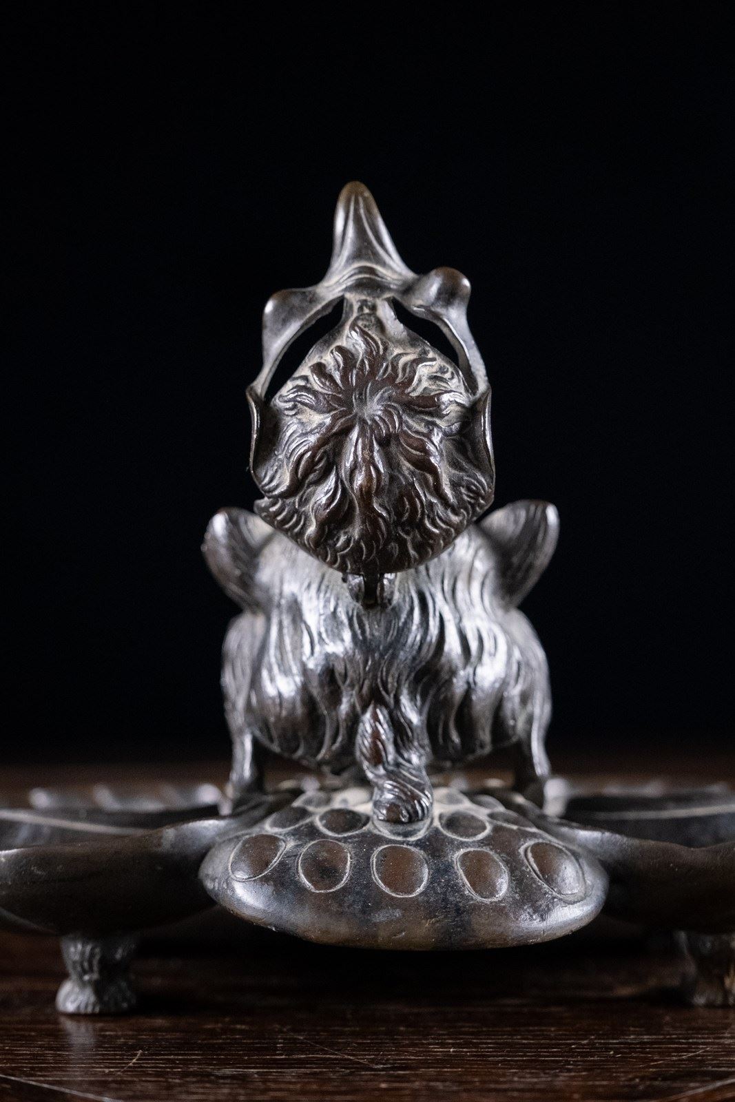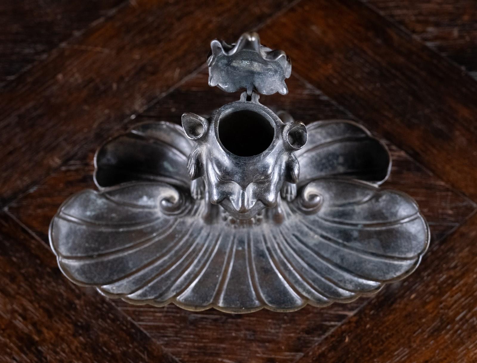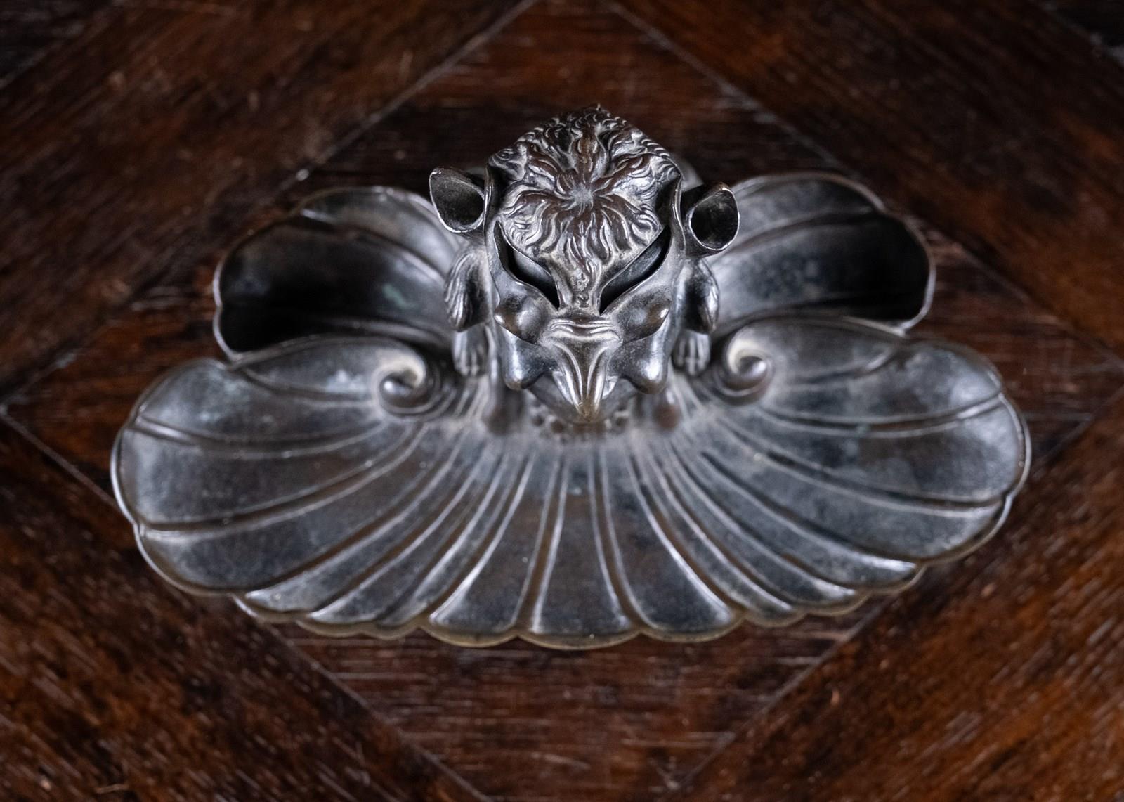 The devil is perched upon the back the bronze pen rest, with its hollow ears functioning as pen holders. The devil is concealed from above by a bird mask lid which reveals the devil beneath when lifted. Although the devil will be apparent to whomever opens the lid, he is then cleverly disguised as a bird when viewed from the back, with the devil's hind legs becoming the bird's feet and its ears the wings. The whole is sat upon four thick bronze paw feet.