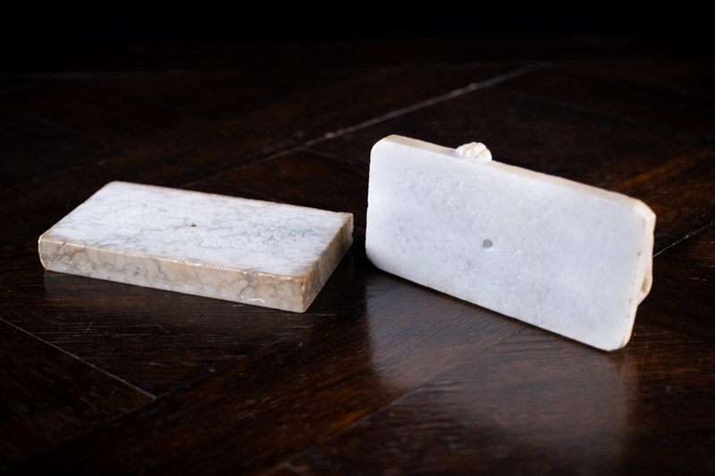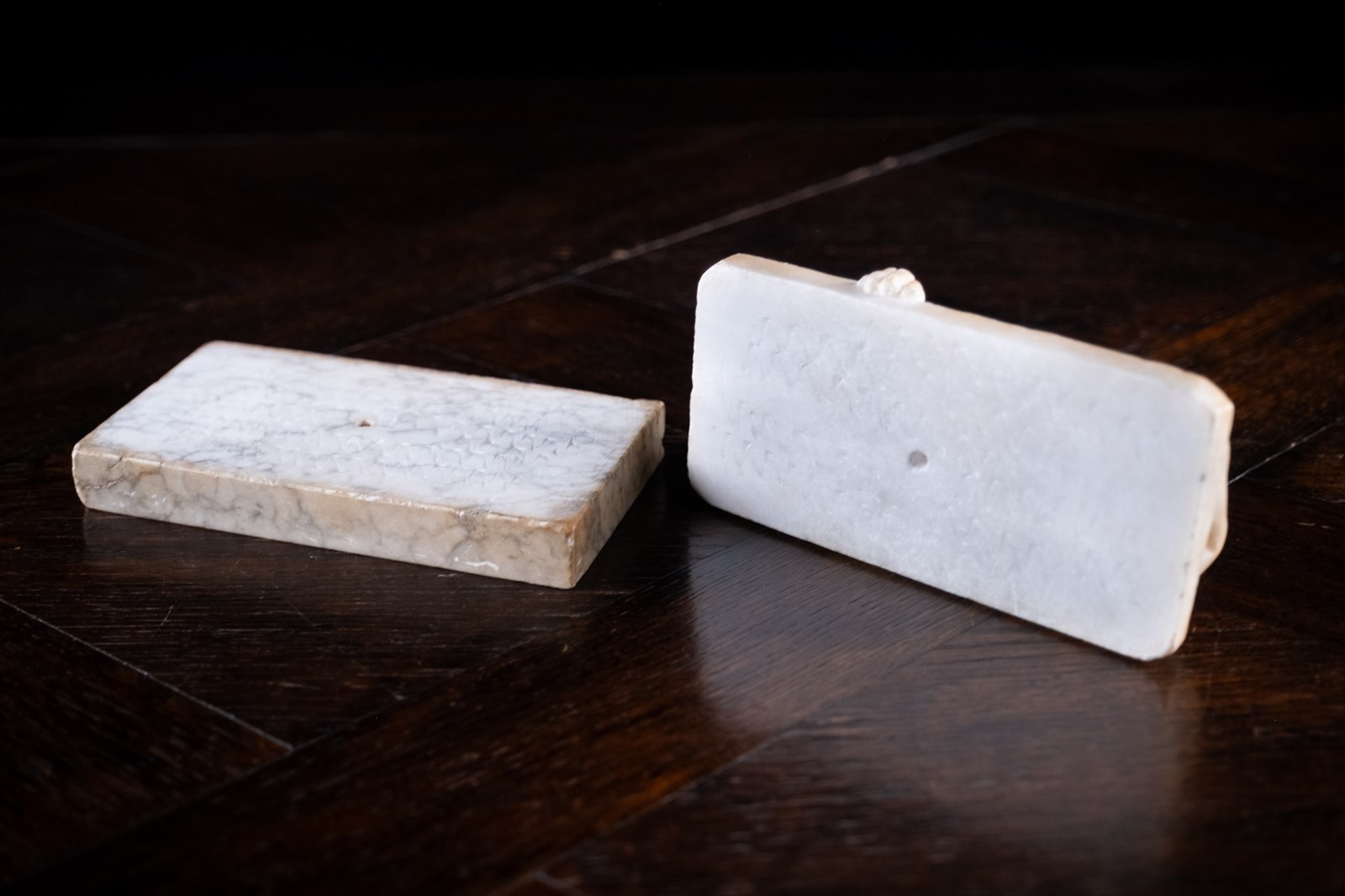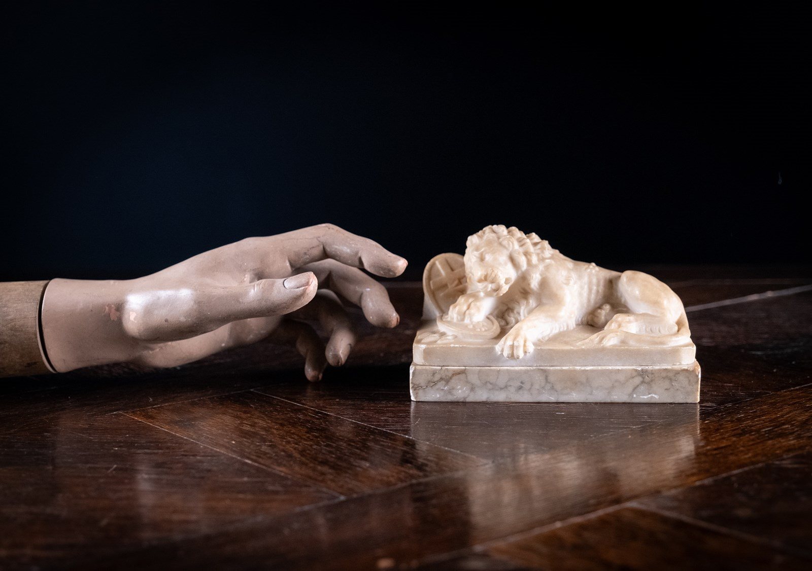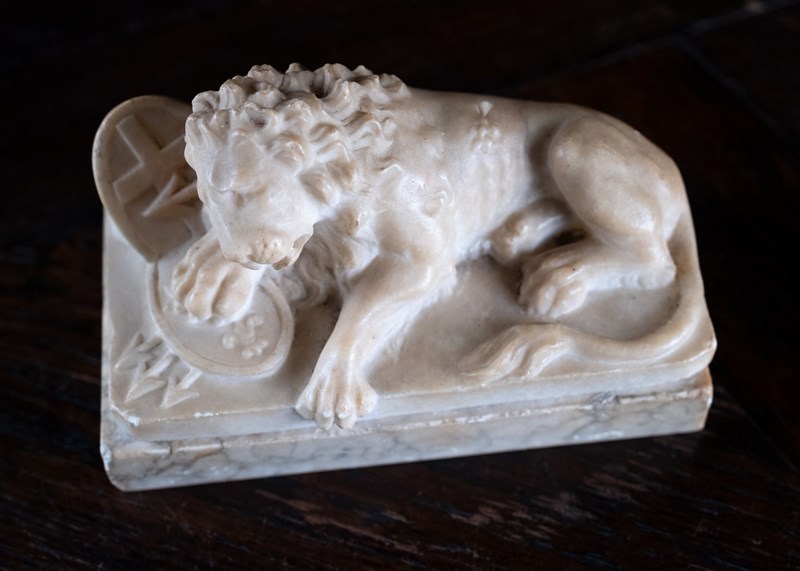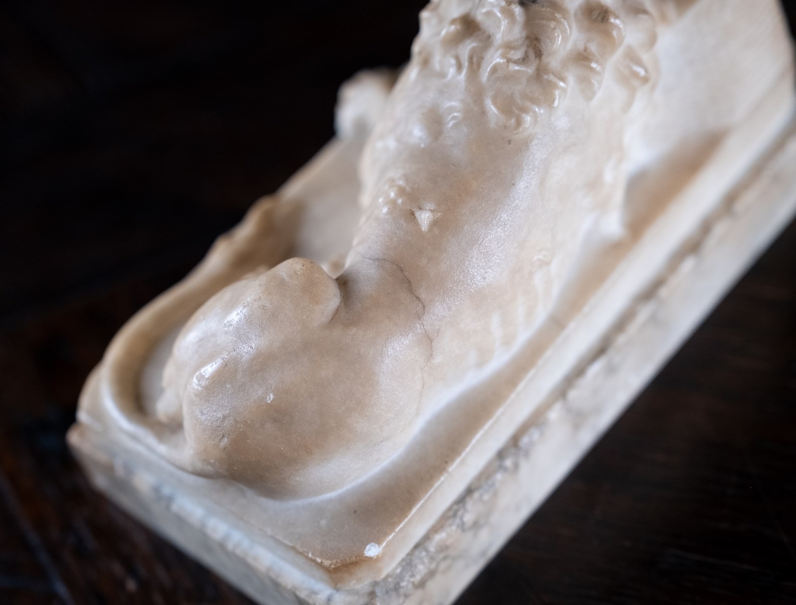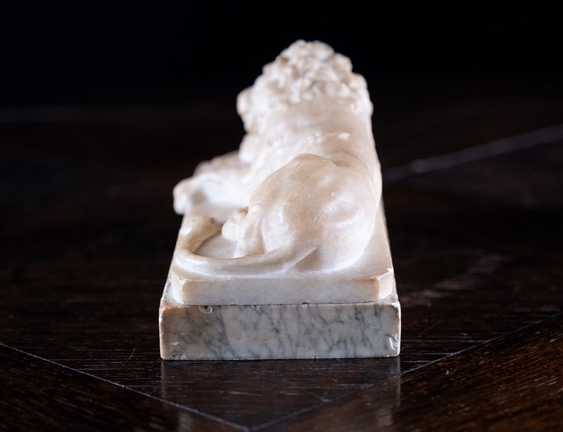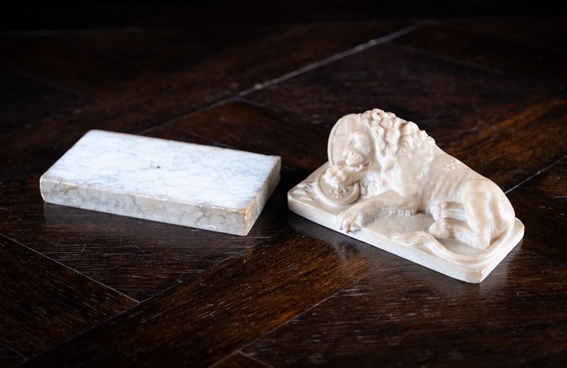 The alabaster lion sits atop an associated grey marble base. The two elements are separate but the presence of what looks to be a fixture in the middle of the base and mirrored hole to the lion indicates that they were likely affixed originally.