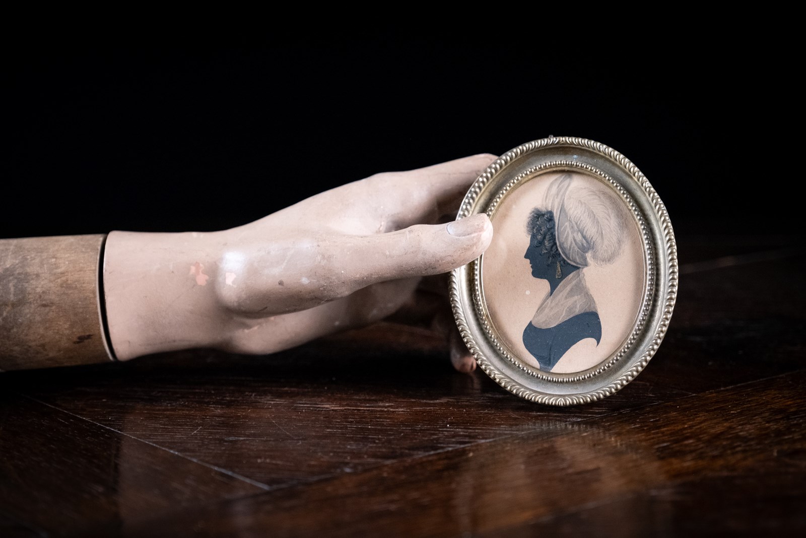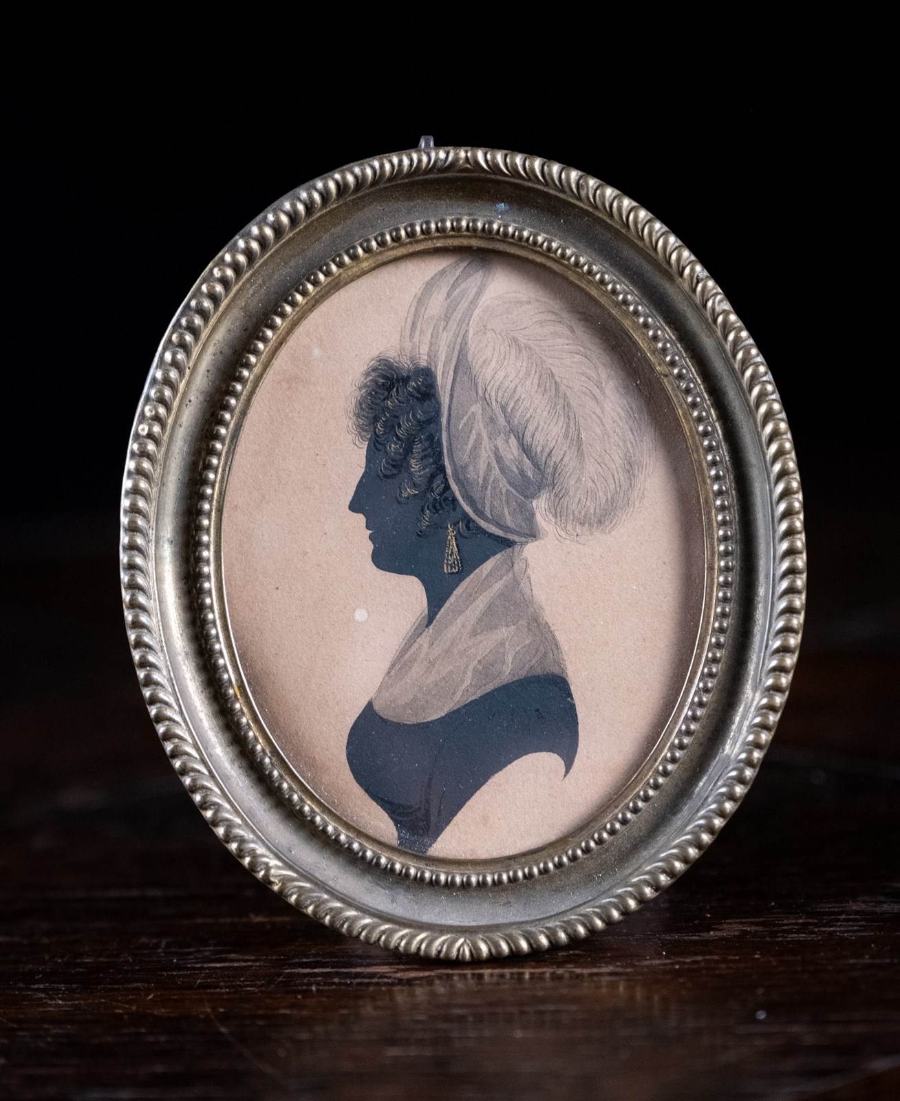 An early 19th century silhouette portrait of a lady in a plumed hat and dress.